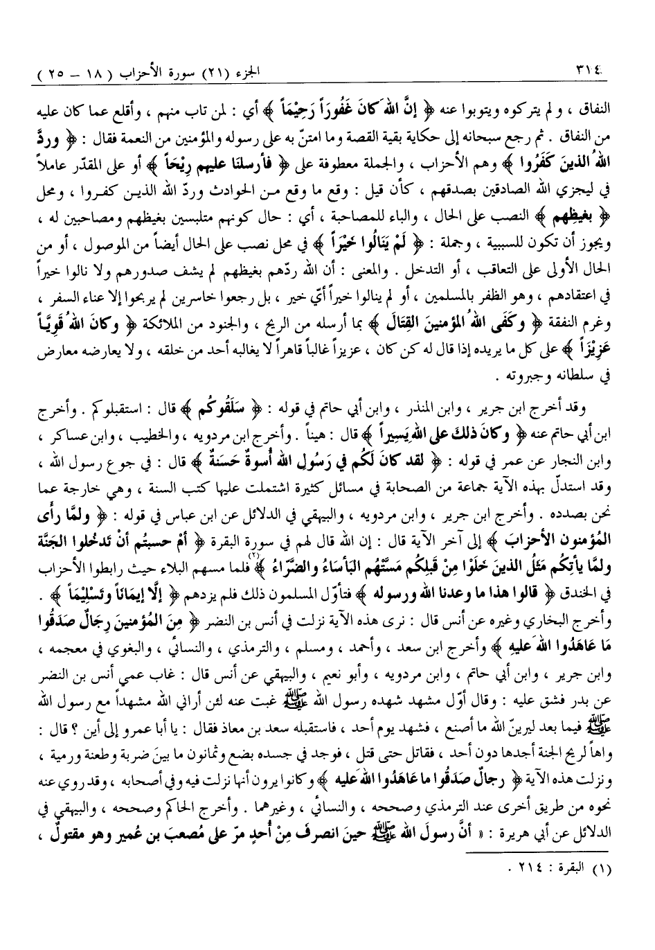 وَأَخْرَجَ الْبُخَارِيُّ وَغَيْرُهُ عَنْ أَنَسٍ قَالَ: نَرَى هَذِهِ الْآيَةَ نَزَلَتْ فِي أَنَسِ بْنِ النَّضْرِ مِنَ الْمُؤْمِنِينَ رِجالٌ صَدَقُوا مَا عاهَدُوا اللَّهَ عَلَيْهِ وَأَخْرَجَ ابْنُ سَعْدٍ، وَأَحْمَدُ، وَمُسْلِمٌ، وَالتِّرْمِذِيُّ، وَالنَّسَائِيُّ، وَالْبَغَوِيُّ فِي مُعْجَمِهِ، وَابْنُ جَرِيرٍ، وَابْنُ أَبِي حَاتِمٍ، وَابْنُ مَرْدَوَيْهِ، وَأَبُو نُعَيْمٍ، وَالْبَيْهَقِيُّ عَنْ أَنَسٍ قَالَ: غَابَ عَمِّي أَنْسُ بْنُ النَّضْرِ عَنْ بَدْرٍ فَشَقَّ عَلَيْهِ: وَقَالَ أَوَّلُ مَشْهَدٍ شَهِدَهُ رَسُولُ اللَّهِ صَلَّى اللَّهُ عليه وَسَلَّمَ غِبْتُ عَنْهُ لَئِنْ أَرَانِي اللَّهُ مَشْهَدًا مَعَ رَسُولِ اللَّهِ صَلَّى اللَّهُ عَلَيْهِ وَسَلَّمَ فِيمَا بَعْدُ لَيَرَيَنَّ اللَّهُ مَا أَصْنَعُ، فَشَهِدَ يَوْمَ أُحُدٍ، فَاسْتَقْبَلَهُ سَعْدُ بْنُ مُعَاذٍ فقال: يا أبا عمرو إلى أين؟ قَالَ: