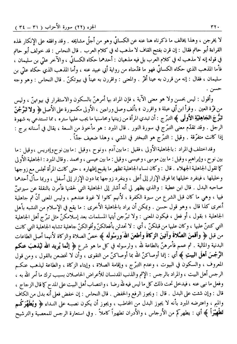 وَقَدِ اخْتُلِفَ فِي الْمُرَادِ: بِالْجَاهِلِيَّةِ الْأُولَى، فَقِيلَ: مَا بَيْنَ آدَمَ، وَنُوحٍ، وَقِيلَ: مَا بَيْنَ نُوحٍ وَإِدْرِيسَ، وَقِيلَ: مَا بَيْنَ نُوحٍ، وَإِبْرَاهِيمَ، وَقِيلَ: مَا بَيْنَ مُوسَى، وَعِيسَى، وَقِيلَ: مَا بَيْنَ عِيسَى، وَمُحَمَّدٍ. وَقَالَ الْمُبَرِّدُ: الْجَاهِلِيَّةُ الْأُولَى كَمَا تَقُولُ الْجَاهِلِيَّةُ الْجَهْلَاءُ. قَالَ: وَكَانَ نِسَاءُ الْجَاهِلِيَّةِ تُظْهِرُ مَا يَقْبُحُ إِظْهَارُهُ، حَتَّى كَانَتِ الْمَرْأَةُ تَجْلِسُ مَعَ زَوْجِهَا وَخَلِيلِهَا، فَيَنْفَرِدُ خَلِيلُهَا بِمَا فَوْقَ الْإِزَارِ إِلَى أَعْلَى، وَيَنْفَرِدُ زَوْجُهَا بِمَا دُونَ الْإِزَارِ إِلَى أَسْفَلَ، وَرُبَّمَا سَأَلَ أَحَدُهُمَا صَاحِبَهُ الْبَدَلَ. قَالَ ابْنُ عَطِيَّةَ: وَالَّذِي يَظْهَرُ لِي أَنَّهُ أَشَارَ إِلَى الْجَاهِلِيَّةِ الَّتِي لَحِقْنَهَا فَأُمِرْنَ بِالنُّقْلَةِ عَنْ سِيرَتِهِنَّ فِيهَا، وَهِيَ مَا كَانَ قَبْلَ الشَّرْعِ مِنْ سِيرَةِ الْكَفَرَةِ، لِأَنَّهُمْ كَانُوا لَا غَيْرَةَ عِنْدَهُمْ، وَلَيْسَ الْمَعْنَى أَنَّ ثَمَّ جَاهِلِيَّةً أُخْرَى كَذَا قَالَ، وَهُوَ قَوْلٌ حَسَنٌ. وَيُمْكِنُ أَنْ يُرَادَ بِالْجَاهِلِيَّةِ الْأُخْرَى: مَا يَقَعُ فِي الْإِسْلَامِ مِنَ التَّشَبُّهِ بِأَهْلِ الْجَاهِلِيَّةِ بِقَوْلٍ، أَوْ فعل، فيكون المعنى: ولا تبرّجن أيتها المسلمات بعد إسلامكنّ مثل تبرّج أهل الْجَاهِلِيَّةِ الَّتِي كُنْتُنَّ عَلَيْهَا، وَكَانَ عَلَيْهَا مَنْ قَبْلَكُنَّ، أَيْ: لَا تُحْدِثْنَ بِأَفْعَالِكُنَّ وَأَقْوَالِكُنَّ جَاهِلِيَّةً تُشَابِهُ الْجَاهِلِيَّةَ الَّتِي كَانَتْ مِنْ قَبْلُ وَأَقِمْنَ الصَّلاةَ وَآتِينَ الزَّكاةَ وَأَطِعْنَ اللَّهَ وَرَسُولَهُ خَصَّ الصَّلَاةَ وَالزَّكَاةَ لِأَنَّهُمَا أَصْلُ الطَّاعَاتِ الْبَدَنِيَّةِ وَالْمَالِيَّةِ. ثُمَّ عَمَّمَ فَأَمَرَهُنَّ بِالطَّاعَةِ لِلَّهِ، وَلِرَسُولِهِ فِي كُلِّ مَا هُوَ شَرْعٌ إِنَّما يُرِيدُ اللَّهُ لِيُذْهِبَ عَنْكُمُ الرِّجْسَ أَهْلَ الْبَيْتِ أَيْ: إِنَّمَا أَوْصَاكُنَّ اللَّهُ بِمَا أَوْصَاكُنَّ مِنَ التَّقْوَى، وَأَنْ لَا تَخْضَعْنَ بِالْقَوْلِ، وَمِنْ قَوْلِ الْمَعْرُوفِ، وَالسُّكُونِ فِي الْبُيُوتِ، وَعَدَمِ التَّبَرُّجِ، وَإِقَامَةِ الصَّلَاةِ، وَإِيتَاءِ الزَّكَاةِ، وَالطَّاعَةِ لِيُذْهِبَ عَنْكُمُ الرِّجْسَ أَهْلَ الْبَيْتِ، وَالْمُرَادُ بِالرِّجْسِ: الْإِثْمُ وَالذَّنْبُ الْمُدَنِّسَانِ لِلْأَعْرَاضِ الْحَاصِلَانِ بِسَبَبِ تَرْكِ مَا أَمَرَ اللَّهُ بِهِ، وَفِعْلِ مَا نَهَى عَنْهُ، فَيَدْخُلُ تَحْتَ ذَلِكَ كُلُّ مَا لَيْسَ فِيهِ لِلَّهِ رِضًا، وَانْتِصَابُ أَهْلَ الْبَيْتِ عَلَى الْمَدْحِ كَمَا قَالَ الزَّجَّاجُ، قَالَ: وَإِنْ شِئْتَ عَلَى الْبَدَلِ. قَالَ: وَيَجُوزُ الرَّفْعُ وَالْخَفْضُ. قَالَ النَّحَّاسُ: إِنْ خُفِضَ فَعَلَى أَنَّهُ بَدَلٌ مِنَ الْكَافِ وَالْمِيمِ، وَاعْتَرَضَهُ الْمُبَرِّدُ بِأَنَّهُ لَا يَجُوزُ الْبَدَلُ مِنَ الْمُخَاطَبِ، وَيَجُوزُ أَنْ يَكُونَ نَصَبَهُ عَلَى النِّدَاءِ وَيُطَهِّرَكُمْ تَطْهِيراً أَيْ: يُطَهِّرَكُمْ مِنَ الْأَرْجَاسِ، وَالْأَدْرَانِ تَطْهِيرًا كَامِلًا. وَفِي اسْتِعَارَةِ الرِّجْسِ لِلْمَعْصِيَةِ وَالتَّرْشِيحِ
