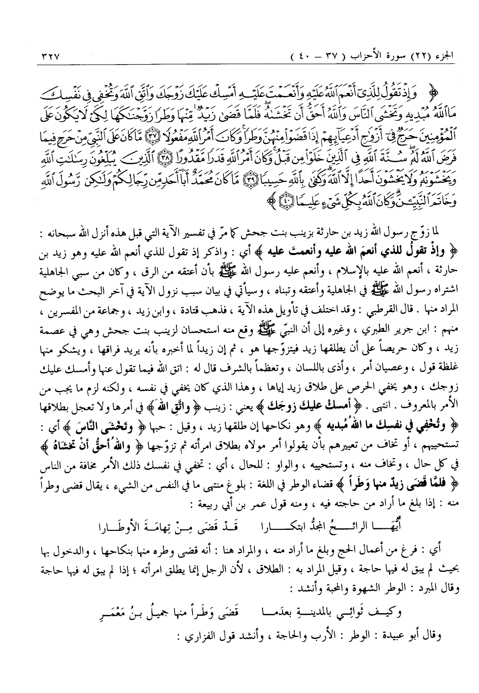 وَإِذْ تَقُولُ لِلَّذِي أَنْعَمَ اللَّهُ عَلَيْهِ وَأَنْعَمْتَ عَلَيْهِ أَمْسِكْ عَلَيْكَ زَوْجَكَ وَاتَّقِ اللَّهَ وَتُخْفِي فِي نَفْسِكَ مَا اللَّهُ مُبْدِيهِ وَتَخْشَى النَّاسَ وَاللَّهُ أَحَقُّ أَنْ تَخْشاهُ فَلَمَّا قَضى زَيْدٌ مِنْها وَطَراً زَوَّجْناكَها لِكَيْ لَا يَكُونَ عَلَى الْمُؤْمِنِينَ حَرَجٌ فِي أَزْواجِ أَدْعِيائِهِمْ إِذا قَضَوْا مِنْهُنَّ وَطَراً وَكانَ أَمْرُ اللَّهِ مَفْعُولاً (37) مَا كانَ عَلَى النَّبِيِّ مِنْ حَرَجٍ فِيما فَرَضَ اللَّهُ لَهُ سُنَّةَ اللَّهِ فِي الَّذِينَ خَلَوْا مِنْ قَبْلُ وَكانَ أَمْرُ اللَّهِ قَدَراً مَقْدُوراً (38) الَّذِينَ يُبَلِّغُونَ رِسالاتِ اللَّهِ وَيَخْشَوْنَهُ وَلا يَخْشَوْنَ أَحَداً إِلاَّ اللَّهَ وَكَفى بِاللَّهِ حَسِيباً (39) مَا كانَ مُحَمَّدٌ أَبا أَحَدٍ مِنْ رِجالِكُمْ وَلكِنْ رَسُولَ اللَّهِ وَخاتَمَ النَّبِيِّينَ وَكانَ اللَّهُ بِكُلِّ شَيْءٍ عَلِيماً (40)