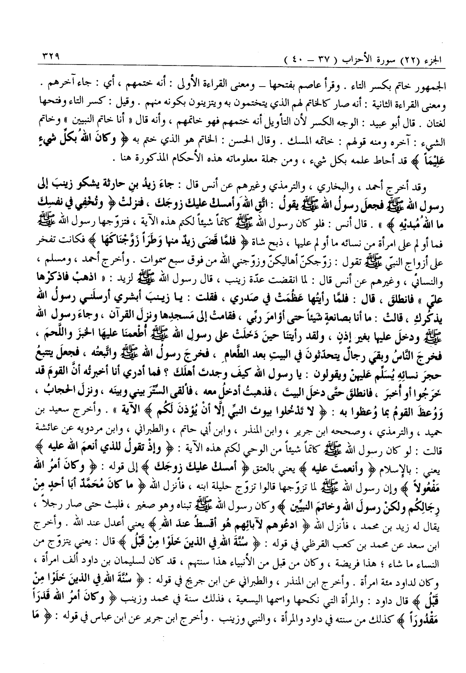 وَقَدْ أَخْرَجَ أَحْمَدُ، وَالْبُخَارِيُّ، وَالتِّرْمِذِيُّ وَغَيْرُهُمْ عَنْ أَنَسٍ قَالَ: جَاءَ زَيْدُ بْنُ حَارِثَةَ يَشْكُو زَيْنَبَ إِلَى رَسُولِ اللَّهِ صَلَّى اللَّهُ عَلَيْهِ وَسَلَّمَ فَجَعَلَ رَسُولُ اللَّهِ صَلَّى اللَّهُ عَلَيْهِ وَسَلَّمَ يَقُولُ: اتَّقِ اللَّهَ وَأَمْسِكْ عَلَيْكَ زَوْجَكَ، فَنَزَلَتْ وَتُخْفِي فِي نَفْسِكَ مَا اللَّهُ مُبْدِيهِ» . قَالَ أَنَسٌ: فَلَوْ كَانَ رَسُولُ اللَّهِ صَلَّى اللَّهُ عَلَيْهِ وَسَلَّمَ كَاتِمًا شَيْئًا لَكَتَمَ هَذِهِ الْآيَةَ، فَتَزَوَّجَهَا رسول الله صلى الله عليه وسلم فما أو لم على امرأة من نسائه ما أو لم عَلَيْهَا، ذَبَحَ شَاةً فَلَمَّا قَضى زَيْدٌ مِنْها وَطَراً زَوَّجْناكَها فَكَانَتْ تَفْخَرُ عَلَى أَزْوَاجِ النَّبِيِّ صلّى الله عليه وَسَلَّمَ تَقُولُ: زَوَّجَكُنَّ أَهَالِيكُنَّ وَزَوَّجَنِيَ اللَّهُ مِنْ فوق سبع سموات. وَأَخْرَجَ أَحْمَدُ، وَمُسْلِمٌ، وَالنَّسَائِيُّ، وَغَيْرُهُمْ عَنْ أَنَسٍ قَالَ: لَمَّا انْقَضَتْ عِدَّةُ زَيْنَبَ، قَالَ رَسُولُ اللَّهِ صَلَّى اللَّهُ عَلَيْهِ وَسَلَّمَ لِزَيْدٍ: «اذْهَبْ فَاذْكُرْهَا عَلَيَّ» فَانْطَلَقَ، قَالَ: فَلَمَّا رَأَيْتُهَا عَظُمَتْ فِي صَدْرِي، فَقُلْتُ: يَا زَيْنَبُ أَبْشِرِي أَرْسَلَنِي رَسُولُ اللَّهِ يَذْكُرُكِ، قَالَتْ: مَا أَنَا بِصَانِعَةٍ شَيْئًا حَتَّى أُؤَامِرَ رَبِّي، فَقَامَتْ إِلَى مَسْجِدِهَا وَنَزَلَ الْقُرْآنُ، وَجَاءَ رَسُولُ الله صلّى الله عليه وَسَلَّمَ وَدَخَلَ عَلَيْهَا بِغَيْرِ إِذْنٍ، وَلَقَدْ رَأَيْتُنَا حِينَ دَخَلْتُ عَلَى رَسُولِ اللَّهِ صَلَّى اللَّهُ عَلَيْهِ وَسَلَّمَ أَطْعَمَنَا عَلَيْهَا الْخُبْزَ وَاللَّحْمَ، فَخَرَجَ النَّاسُ وَبَقِيَ رِجَالٌ يَتَحَدَّثُونَ فِي الْبَيْتِ بَعْدَ الطَّعَامِ، فَخَرَجَ رَسُولُ اللَّهِ صَلَّى اللَّهُ عَلَيْهِ وَسَلَّمَ، وَاتَّبَعْتُهُ، فَجَعَلَ يَتَتَبَّعُ حُجَرَ نِسَائِهِ يُسَلِّمُ عَلَيْهِنَّ وَيَقُولُونَ: يَا رَسُولَ اللَّهِ كَيْفَ وَجَدْتَ أَهْلَكَ؟ فَمَا أَدْرِي أَنَا أَخْبَرْتُهُ أَنَّ الْقَوْمَ قَدْ خَرَجُوا أَوْ أُخْبِرَ، فَانْطَلَقَ حَتَّى دَخَلَ الْبَيْتَ، فَذَهَبْتُ أَدْخُلُ مَعَهُ، فَأَلْقَى السِّتْرَ بَيْنِي وَبَيْنَهُ، وَنَزَلَ الْحِجَابُ، وَوُعِظَ الْقَوْمُ بِمَا وُعِظُوا بِهِ: لَا تَدْخُلُوا بُيُوتَ النَّبِيِّ إِلَّا أَنْ يُؤْذَنَ لَكُمْ الآية» . وأخرج سعيد بن حميد، والترمذي، وصححه ابْنُ جَرِيرٍ، وَابْنُ الْمُنْذِرِ، وَابْنُ أَبِي حَاتِمٍ، وَالطَّبَرَانِيُّ، وَابْنُ مَرْدَوَيْهِ عَنْ عَائِشَةَ قَالَتْ: لَوْ كَانَ رَسُولُ اللَّهِ صَلَّى اللَّهُ عَلَيْهِ وَسَلَّمَ كَاتِمًا شَيْئًا مِنَ الْوَحْيِ لَكَتَمَ هَذِهِ الْآيَةَ: وَإِذْ تَقُولُ لِلَّذِي أَنْعَمَ اللَّهُ عَلَيْهِ يَعْنِي: بِالْإِسْلَامِ وَأَنْعَمْتَ عَلَيْهِ يَعْنِي بِالْعِتْقِ أَمْسِكْ عَلَيْكَ زَوْجَكَ إِلَى قَوْلِهِ: وَكانَ أَمْرُ اللَّهِ مَفْعُولًا وَإِنَّ رَسُولَ اللَّهِ صَلَّى اللَّهُ عَلَيْهِ وَسَلَّمَ لَمَّا تَزَوَّجَهَا قَالُوا تَزَوَّجَ حَلِيلَةَ ابْنِهِ، فَأَنْزَلَ اللَّهُ مَا كانَ مُحَمَّدٌ أَبا أَحَدٍ مِنْ رِجالِكُمْ وَلكِنْ رَسُولَ اللَّهِ وَخاتَمَ النَّبِيِّينَ وَكَانَ رَسُولُ اللَّهِ صَلَّى اللَّهُ عَلَيْهِ وَسَلَّمَ تَبَنَّاهُ وَهُوَ صَغِيرٌ، فَلَبِثَ حَتَّى صَارَ رَجُلًا، يُقَالُ لَهُ زَيْدُ بْنُ مُحَمَّدٍ، فَأَنْزَلَ اللَّهُ ادْعُوهُمْ لِآبائِهِمْ هُوَ أَقْسَطُ عِنْدَ اللَّهِ يَعْنِي أَعْدَلَ عِنْدَ اللَّهِ. وَأَخْرَجَ ابْنُ سَعْدٍ عَنْ مُحَمَّدِ بْنِ كَعْبٍ الْقُرَظِيِّ فِي قَوْلِهِ: سُنَّةَ اللَّهِ فِي الَّذِينَ خَلَوْا مِنْ قَبْلُ قَالَ: يَعْنِي يَتَزَوَّجُ مِنَ النِّسَاءِ مَا شَاءَ ه