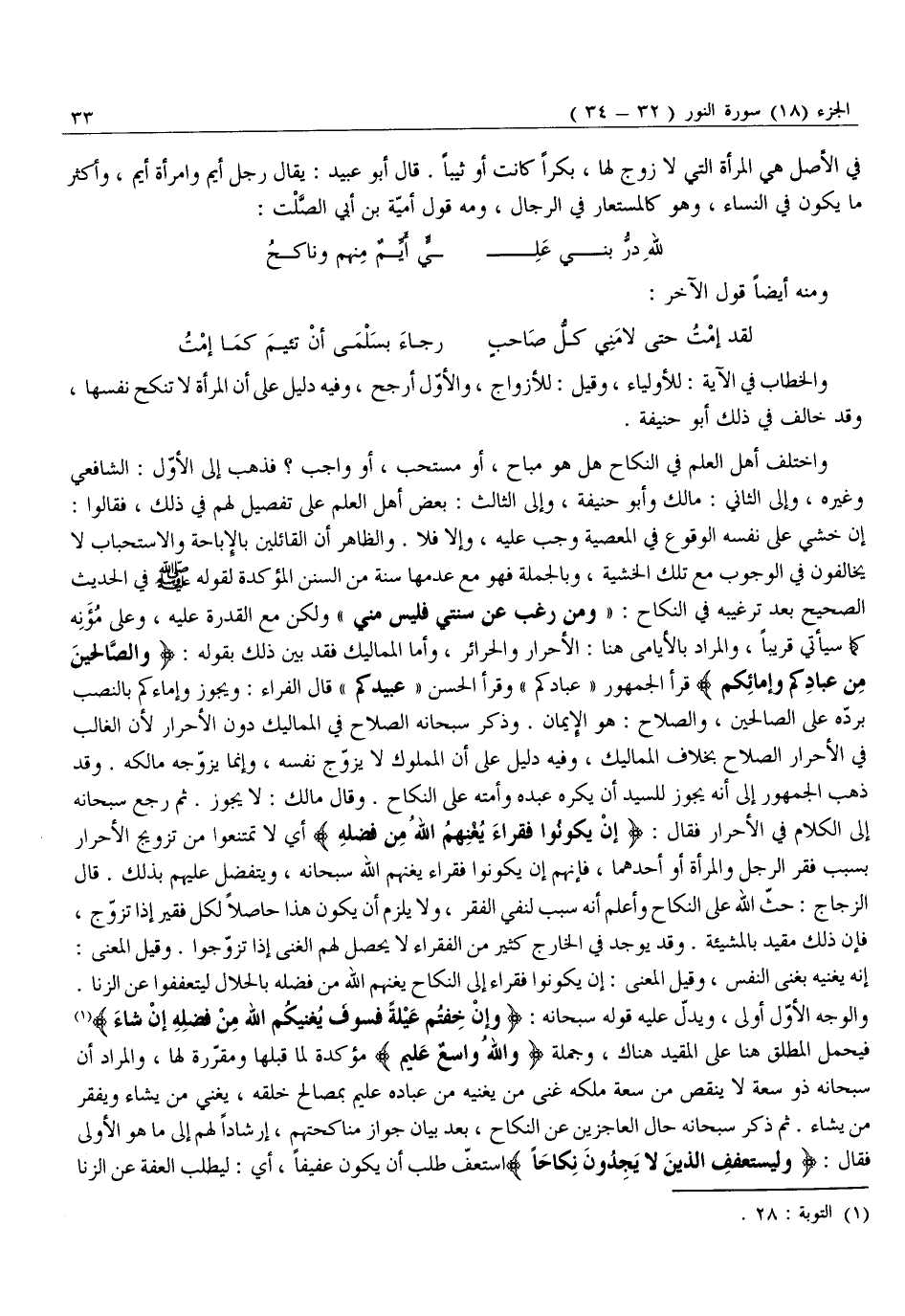إِنْ خَشِيَ عَلَى نَفْسِهِ الْوُقُوعَ فِي الْمَعْصِيَةِ وَجَبَ عَلَيْهِ، وَإِلَّا فَلَا. وَالظَّاهِرُ أَنَّ الْقَائِلِينَ بِالْإِبَاحَةِ وَالِاسْتِحْبَابِ لَا يُخَالِفُونَ فِي الْوُجُوبِ مَعَ تِلْكَ الْخَشْيَةِ، وَبِالْجُمْلَةِ فَهُوَ مَعَ عَدَمِهَا سُنَّةٌ مِنَ السُّنَنِ المؤكدة لقوله صلّى الله عليه وَسَلَّمَ فِي الْحَدِيثِ الصَّحِيحِ بَعْدَ تَرْغِيبِهِ فِي النِّكَاحِ: «وَمَنْ رَغِبَ عَنْ سُنَّتِي فَلَيْسَ مِنِّي» وَلَكِنْ مَعَ الْقُدْرَةِ عَلَيْهِ، وَعَلَى مُؤَنِهِ كَمَا سَيَأْتِي قَرِيبًا، وَالْمُرَادُ بِالْأَيَامَى هُنَا: الْأَحْرَارُ وَالْحَرَائِرُ، وَأَمَّا الْمَمَالِيكُ فَقَدْ بَيَّنَ ذَلِكَ بِقَوْلِهِ: وَالصَّالِحِينَ مِنْ عِبادِكُمْ وَإِمائِكُمْ قَرَأَ الْجُمْهُورُ «عِبَادِكُمْ» وَقَرَأَ الْحَسَنُ «عَبِيدِكُمْ» قَالَ الْفَرَّاءُ: وَيَجُوزُ وَإِمَاءَكُمْ بِالنَّصْبِ بِرَدِّهِ عَلَى الصَّالِحِينَ، وَالصَّلَاحُ: هُوَ الْإِيمَانُ. وَذَكَرَ سُبْحَانَهُ الصَّلَاحَ فِي الْمَمَالِيكِ دُونَ الْأَحْرَارِ لِأَنَّ الْغَالِبَ فِي الْأَحْرَارِ الصَّلَاحُ بِخِلَافِ الْمَمَالِيكِ، وَفِيهِ دَلِيلٌ عَلَى أَنَّ الْمَمْلُوكَ لَا يُزَوِّجُ نَفْسَهُ، وَإِنَّمَا يُزَوِّجُهُ مَالِكُهُ. وَقَدْ ذَهَبَ الْجُمْهُورُ إِلَى أَنَّهُ يَجُوزُ لِلسَّيِّدِ أَنْ يُكْرِهَ عَبْدَهُ وَأَمَتَهُ عَلَى النِّكَاحِ. وَقَالَ مَالِكٌ: لَا يَجُوزُ. ثُمَّ رَجَعَ سُبْحَانَهُ إِلَى الْكَلَامِ فِي الْأَحْرَارِ فَقَالَ: إِنْ يَكُونُوا فُقَراءَ يُغْنِهِمُ اللَّهُ مِنْ فَضْلِهِ أَيْ لَا تَمْتَنِعُوا مِنْ تَزْوِيجِ الْأَحْرَارِ بِسَبَبِ فَقْرِ الرَّجُلِ وَالْمَرْأَةِ أَوْ أَحَدِهِمَا، فَإِنَّهُمْ إِنْ يَكُونُوا فَقُرَّاءَ يُغْنِهِمُ اللَّهُ سُبْحَانَهُ، وَيَتَفَضَّلْ عَلَيْهِمْ بِذَلِكَ. قَالَ الزَّجَّاجُ: حَثَّ اللَّهُ عَلَى النِّكَاحِ وَأَعْلَمَ أَنَّهُ سَبَبٌ لِنَفْيِ الْفَقْرِ، وَلَا يَلْزَمُ أَنْ يَكُونَ هَذَا حَاصِلًا لِكُلِّ فَقِيرٍ إِذَا تَزَوَّجَ، فَإِنَّ ذَلِكَ مُقَيَّدٌ بِالْمَشِيئَةِ. وَقَدْ يُوجَدُ فِي الْخَارِجِ كَثِيرٌ مِنَ الْفُقَرَاءِ لَا يَحْصُلُ لَهُمُ الْغِنَى إِذَا تَزَوَّجُوا. وَقِيلَ الْمَعْنَى: