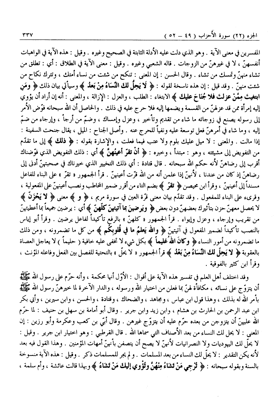 وَقَدِ اخْتَلَفَ أَهْلُ الْعِلْمِ فِي تَفْسِيرِ هَذِهِ الْآيَةِ عَلَى أَقْوَالٍ: الْأَوَّلُ أَنَّهَا مُحْكَمَةٌ، وَأَنَّهُ حَرَّمَ عَلَى رَسُولِ اللَّهِ صَلَّى اللَّهُ عَلَيْهِ وَسَلَّمَ أَنْ يَتَزَوَّجَ عَلَى نِسَائِهِ، مُكَافَأَةً لَهُنَّ بِمَا فَعَلْنَ مِنِ اخْتِيَارِ اللَّهِ وَرَسُولِهِ، وَالدَّارِ الْآخِرَةِ لَمَّا خَيَّرَهُنَّ رَسُولُ اللَّهِ صَلَّى اللَّهُ عليه وَسَلَّمَ بِأَمْرِ اللَّهِ لَهُ بِذَلِكَ، وَهَذَا قَوْلُ ابْنِ عَبَّاسٍ، وَمُجَاهِدٍ، وَالضَّحَّاكِ، وَقَتَادَةَ، وَالْحَسَنِ، وَابْنِ سيرين، وأبي بكر ابن عَبْدِ الرَّحْمَنِ بْنِ الْحَارِثِ بْنِ هِشَامٍ، وَابْنِ زَيْدٍ وَابْنِ جَرِيرٍ. وَقَالَ أَبُو أُمَامَةَ بْنُ سَهْلِ بْنِ حُنَيْفٍ: لَمَّا حَرَّمَ اللَّهُ عَلَيْهِنَّ أَنْ يَتَزَوَّجْنَ مِنْ بَعْدِهِ حَرَّمَ عَلَيْهِ أَنْ يَتَزَوَّجَ غَيْرَهُنَّ. وَقَالَ أُبَيُّ بْنُ كَعْبٍ وَعِكْرِمَةُ وَأَبُو رَزِينٍ: إِنَّ الْمَعْنَى: لَا يَحِلُّ لَكَ النِّسَاءُ مِنْ بَعْدِ الْأَصْنَافِ الَّتِي سَمَّاهَا اللَّهُ. قَالَ الْقُرْطُبِيُّ: وَهُوَ اخْتِيَارُ ابْنِ جَرِيرٍ. وَقِيلَ: