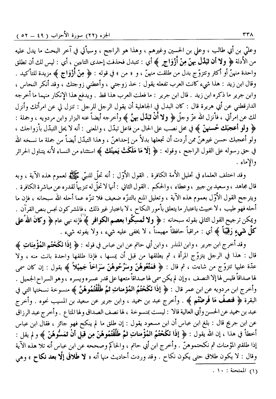 وَعَلِيُّ بْنُ أَبِي طَالِبٍ، وَعَلِيُّ بْنُ الْحُسَيْنِ وَغَيْرُهُمْ، وَهَذَا هُوَ الرَّاجِحُ، وَسَيَأْتِي فِي آخِرِ الْبَحْثِ مَا يَدُلُّ عَلَيْهِ مِنَ الْأَدِلَّةِ وَلا أَنْ تَبَدَّلَ بِهِنَّ مِنْ أَزْواجٍ أَيْ: تَتَبَدَّلَ فَحُذِفَتْ إِحْدَى التَّاءَيْنِ، أَيْ: لَيْسَ لَكَ أَنْ تُطَلِّقَ وَاحِدَةً مِنْهُنَّ أَوْ أَكْثَرَ وَتَتَزَوَّجَ بَدَلَ مَنْ طَلَّقْتَ مِنْهُنَّ، وَ «مِنْ» فِي قَوْلِهِ: مِنْ أَزْواجٍ مَزِيدَةٌ لِلتَّأْكِيدِ.