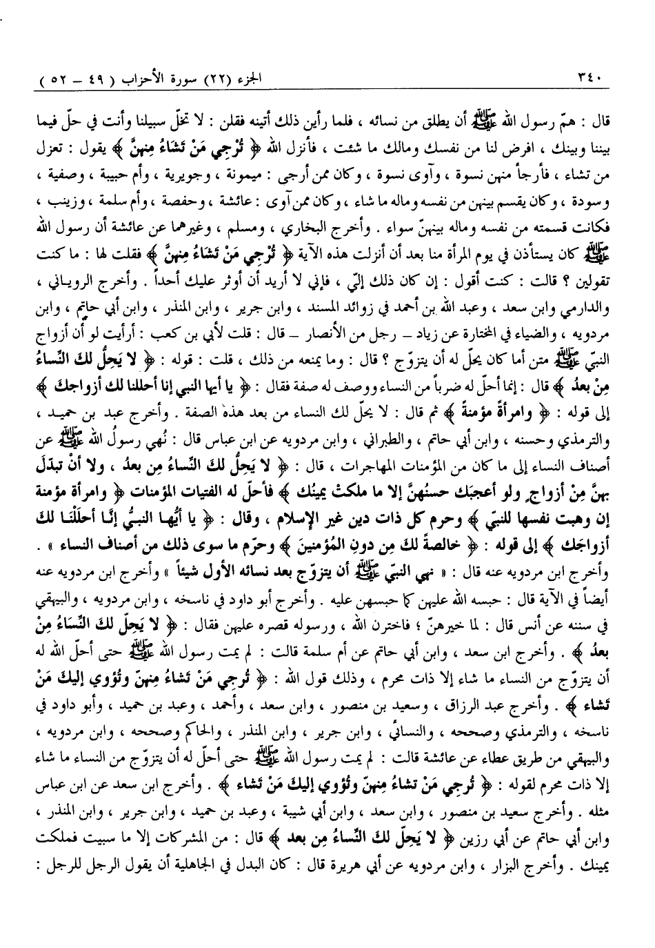 قَالَ: هَمَّ رَسُولُ اللَّهِ صَلَّى اللَّهُ عَلَيْهِ وَسَلَّمَ إِنَّ يُطَلِّقَ مِنْ نِسَائِهِ، فَلَمَّا رَأَيْنَ ذَلِكَ أَتَيْنَهُ فَقُلْنَ: لَا تُخَلِّ سَبِيلَنَا وَأَنْتَ فِي حِلٍّ فِيمَا بَيْنَنَا وَبَيْنَكَ، افْرِضْ لَنَا مِنْ نَفْسِكَ وَمَالِكَ مَا شِئْتَ، فَأَنْزَلَ اللَّهُ تُرْجِي مَنْ تَشاءُ مِنْهُنَّ يَقُولُ: تَعْزِلُ مَنْ تَشَاءُ، فَأَرْجَأَ مِنْهُنَّ نِسْوَةً، وَآوَى نِسْوَةً، وَكَانَ مِمَّنْ أَرْجَى: مَيْمُونَةُ، وَجُوَيْرِيَّةُ، وَأُمُّ حَبِيبَةَ، وَصَفِيَّةُ، وَسَوْدَةُ، وَكَانَ يَقْسِمُ بَيْنَهُنَّ مِنْ نَفْسِهِ وَمَالِهِ مَا شَاءَ، وَكَانَ مِمَّنْ آوَى: عَائِشَةُ، وَحَفْصَةُ، وَأُمُّ سَلَمَةَ، وَزَيْنَبُ، فَكَانَتْ قِسْمَتُهُ مِنْ نَفْسِهِ وَمَالِهِ بَيْنَهُنَّ سَوَاءً. وَأَخْرَجَ الْبُخَارِيُّ، وَمُسْلِمٌ، وَغَيْرُهُمَا عَنْ عَائِشَةُ إِنَّ رَسُولَ اللَّهِ صَلَّى اللَّهُ عَلَيْهِ وَسَلَّمَ كَانَ يَسْتَأْذِنُ فِي يَوْمِ الْمَرْأَةِ مِنَّا بَعْدَ أَنْ أُنْزِلَتْ هَذِهِ الْآيَةُ تُرْجِي مَنْ تَشاءُ مِنْهُنَّ فَقُلْتُ لَهَا: مَا كُنْتِ تَقُولِينَ؟ قَالَتْ: كُنْتُ أَقُولُ: إِنْ كَانَ ذَلِكَ إِلَيَّ، فإني لا أريد أن أوثر عَلَيْكَ أَحَدًا. وَأَخْرَجَ الرُّويَانِيُّ، وَالدَّارِمِيُّ وَابْنُ سَعْدٍ، وَعَبْدُ اللَّهِ بْنُ أَحْمَدَ فِي زَوَائِدِ الْمُسْنَدِ، وَابْنُ جَرِيرٍ، وَابْنُ الْمُنْذِرِ، وَابْنُ أَبِي حَاتِمٍ، وَابْنُ مَرْدَوَيْهِ، وَالضِّيَاءُ فِي الْمُخْتَارَةِ عَنْ زِيَادٍ- رَجُلٍ مِنَ الْأَنْصَارِ- قَالَ: قُلْتُ لِأُبَيِّ بْنِ كَعْبٍ: أَرَأَيْتَ لَوْ أَنَّ أَزْوَاجَ النَّبِيِّ صَلَّى اللَّهُ عَلَيْهِ وَسَلَّمَ مُتْنَ أَمَا كَانَ يَحِلُّ لَهُ أَنْ يَتَزَوَّجَ؟ قَالَ: وَمَا يَمْنَعُهُ مِنْ ذَلِكَ، قُلْتُ: قَوْلُهُ: لَا يَحِلُّ لَكَ النِّساءُ مِنْ بَعْدُ قَالَ: إِنَّمَا أَحَلَّ لَهُ ضَرْبًا مِنَ النِّسَاءِ ووصف له صفة فقال: يَا أَيُّهَا النَّبِيُّ إِنَّا أَحْلَلْنا لَكَ أَزْواجَكَ إِلَى قَوْلِهِ: وَامْرَأَةً مُؤْمِنَةً ثُمَّ قَالَ: لَا يَحِلُّ لَكَ النِّسَاءُ مِنْ بَعْدِ هَذِهِ الصِّفَةِ. وَأَخْرَجَ عَبْدُ بْنُ حُمَيْدٍ، وَالتِّرْمِذِيُّ وَحَسَّنَهُ، وَابْنُ أَبِي حَاتِمٍ، وَالطَّبَرَانِيُّ، وَابْنُ مَرْدَوَيْهِ عَنِ ابْنِ عَبَّاسٍ قَالَ: نَهَى رَسُولُ اللَّهِ صَلَّى اللَّهُ عَلَيْهِ وَسَلَّمَ عَنْ أصناف النساء إلى مَا كَانَ مِنَ الْمُؤْمِنَاتِ الْمُهَاجِرَاتِ، قَالَ: لَا يَحِلُّ لَكَ النِّساءُ مِنْ بَعْدُ، وَلا أَنْ تَبَدَّلَ بِهِنَّ مِنْ أَزْواجٍ وَلَوْ أَعْجَبَكَ حُسْنُهُنَّ إِلَّا مَا مَلَكَتْ يَمِينُكَ فَأَحَلَّ لَهُ الْفَتَيَاتِ الْمُؤْمِنَاتِ وَامْرَأَةً مُؤْمِنَةً إِنْ وَهَبَتْ نَفْسَها لِلنَّبِيِّ وَحَرَّمَ كُلَّ ذَاتِ دِينٍ غَيْرِ الْإِسْلَامِ، وَقَالَ: يَا أَيُّهَا النَّبِيُّ إِنَّا أَحْلَلْنا لَكَ أَزْواجَكَ