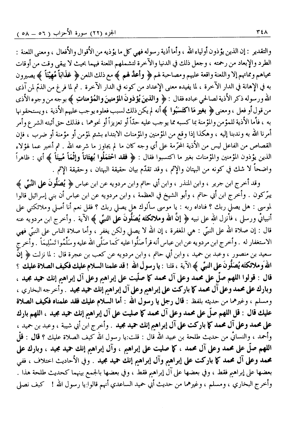 وَقَدْ أَخْرَجَ ابْنُ جَرِيرٍ، وَابْنُ الْمُنْذِرِ، وَابْنُ أَبِي حَاتِمٍ وَابْنُ مَرْدَوَيْهِ عَنِ ابْنِ عَبَّاسٍ يُصَلُّونَ عَلَى النَّبِيِّ يُبَرِّكُونَ. وَأَخْرَجَ ابْنُ أَبِي حَاتِمٍ، وَأَبُو الشَّيْخِ فِي الْعَظَمَةِ، وَابْنُ مَرْدَوَيْهِ عَنْ ابْنِ عَبَّاسٍ أَنَّ بَنِي إِسْرَائِيلَ قَالُوا لِمُوسَى: هَلْ يُصَلِّي رَبُّكَ؟ فَنَادَاهُ رَبُّهُ: يَا مُوسَى سَأَلُوكَ هَلْ يُصَلِّي رَبُّكَ؟ فَقُلْ نَعَمْ أَنَا أُصَلِّي وَمَلَائِكَتِي عَلَى أَنْبِيَائِي وَرُسُلِي، فَأَنْزَلَ اللَّهُ عَلَى نَبِيِّهِ إِنَّ اللَّهَ وَمَلائِكَتَهُ يُصَلُّونَ عَلَى النَّبِيِّ الْآيَةَ. وَأَخْرَجَ ابْنُ مَرْدَوَيْهِ عَنْهُ قَالَ: إِنَّ صَلَاةَ اللَّهِ عَلَى النَّبِيِّ: هِيَ الْمَغْفِرَةُ، إِنَّ اللَّهَ لَا يُصَلِّي وَلَكِنْ يَغْفِرُ، وَأَمَّا صَلَاةُ النَّاسِ عَلَى النَّبِيِّ فَهِيَ الِاسْتِغْفَارُ لَهُ. وَأَخْرَجَ ابْنُ مَرْدَوَيْهِ عَنِ ابْنِ عَبَّاسٍ أَنَّهُ قَرَأَ صَلُّوا عَلَيْهِ كَمَا صَلَّى اللَّهُ عَلَيْهِ وَسَلِّمُوا تَسْلِيمًا. وَأَخْرَجَ سَعِيدُ بْنُ مَنْصُورٍ، وَعَبْدُ بْنُ حُمَيْدٍ، وَابْنُ أَبِي حَاتِمٍ، وَابْنُ مَرْدَوَيْهِ عَنْ كَعْبِ بْنِ عُجْرَةَ قَالَ: لَمَّا نَزَلَتْ إِنَّ اللَّهَ وَمَلائِكَتَهُ يُصَلُّونَ عَلَى النَّبِيِّ الْآيَةَ، قُلْنَا: يَا رَسُولَ اللَّهِ! قَدْ عَلِمْنَا السَّلَامَ عَلَيْكَ فَكَيْفَ الصَّلَاةُ عَلَيْكَ؟