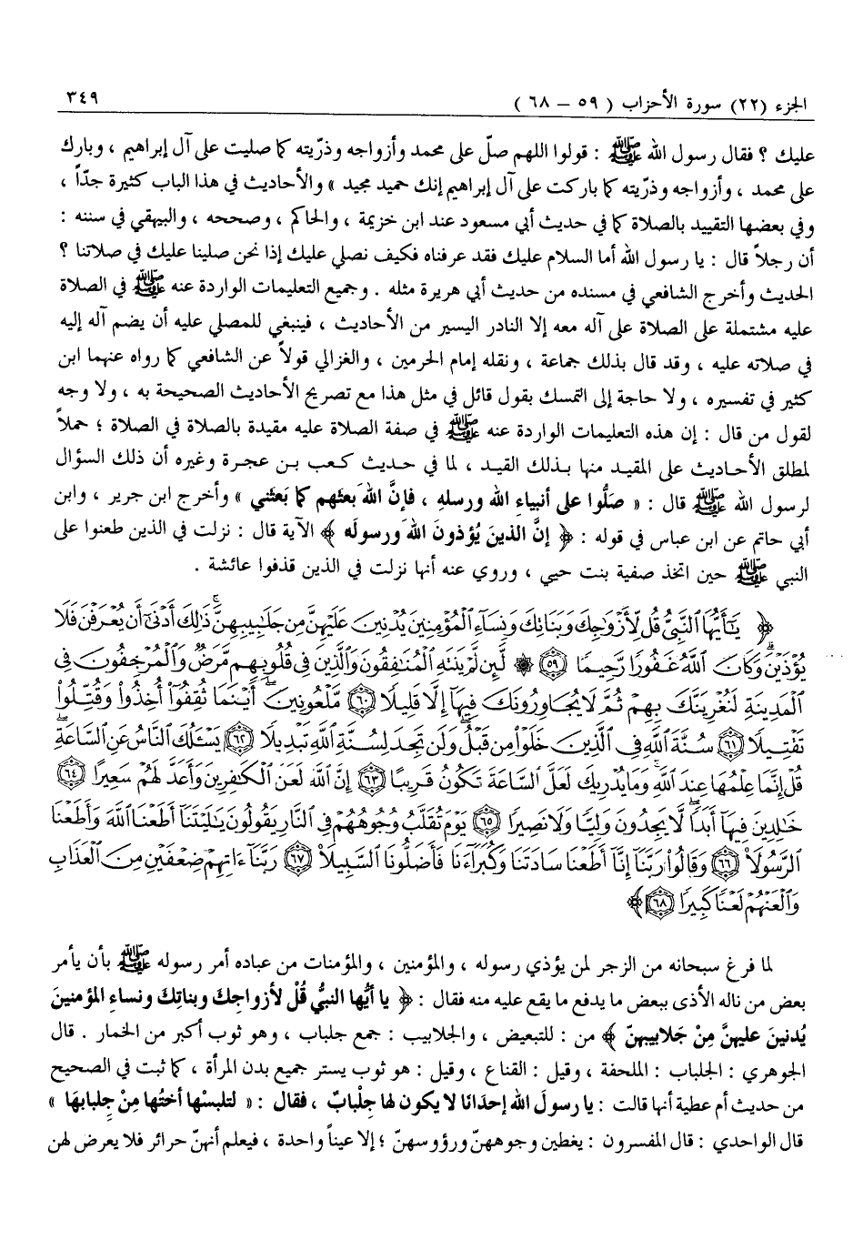 يَا أَيُّهَا النَّبِيُّ قُلْ لِأَزْواجِكَ وَبَناتِكَ وَنِساءِ الْمُؤْمِنِينَ يُدْنِينَ عَلَيْهِنَّ مِنْ جَلابِيبِهِنَّ ذلِكَ أَدْنى أَنْ يُعْرَفْنَ فَلا يُؤْذَيْنَ وَكانَ اللَّهُ غَفُوراً رَحِيماً (59) لَئِنْ لَمْ يَنْتَهِ الْمُنافِقُونَ وَالَّذِينَ فِي قُلُوبِهِمْ مَرَضٌ وَالْمُرْجِفُونَ فِي الْمَدِينَةِ لَنُغْرِيَنَّكَ بِهِمْ ثُمَّ لَا يُجاوِرُونَكَ فِيها إِلاَّ قَلِيلاً (60) مَلْعُونِينَ أَيْنَما ثُقِفُوا أُخِذُوا وَقُتِّلُوا تَقْتِيلاً (61) سُنَّةَ اللَّهِ فِي الَّذِينَ خَلَوْا مِنْ قَبْلُ وَلَنْ تَجِدَ لِسُنَّةِ اللَّهِ تَبْدِيلاً (62) يَسْئَلُكَ النَّاسُ عَنِ السَّاعَةِ قُلْ إِنَّما عِلْمُها عِنْدَ اللَّهِ وَما يُدْرِيكَ لَعَلَّ السَّاعَةَ تَكُونُ قَرِيباً (63)