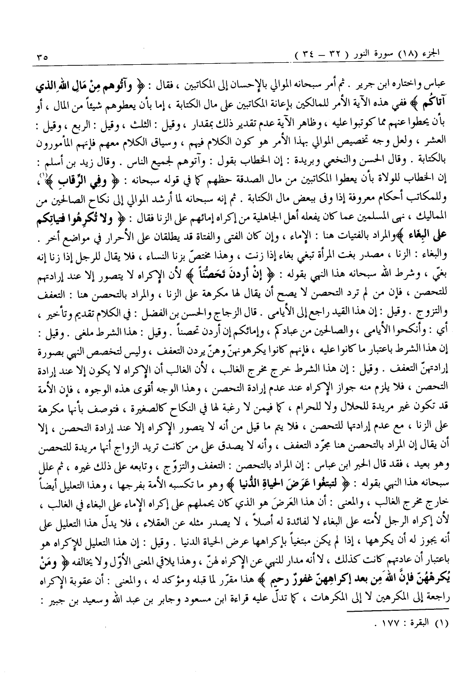 عَبَّاسٍ وَاخْتَارَهُ ابْنُ جَرِيرٍ. ثُمَّ أَمَرَ سُبْحَانَهُ الْمَوَالِيَ بِالْإِحْسَانِ إِلَى الْمُكَاتَبِينَ، فَقَالَ: وَآتُوهُمْ مِنْ مالِ اللَّهِ الَّذِي آتاكُمْ فَفِي هَذِهِ الْآيَةِ الْأَمْرُ لِلْمَالِكِينَ بِإِعَانَةِ الْمُكَاتَبِينَ عَلَى مَالِ الْكِتَابَةِ، إما بأن يعطوهم شيئا من المال، أو بأن يَحُطُّوا عَنْهُمْ مِمَّا كُوتِبُوا عَلَيْهِ، وَظَاهِرُ الْآيَةِ عَدَمُ تَقْدِيرِ ذَلِكَ بِمِقْدَارٍ، وَقِيلَ: الثُّلُثُ، وَقِيلَ: الرُّبُعُ، وَقِيلَ: