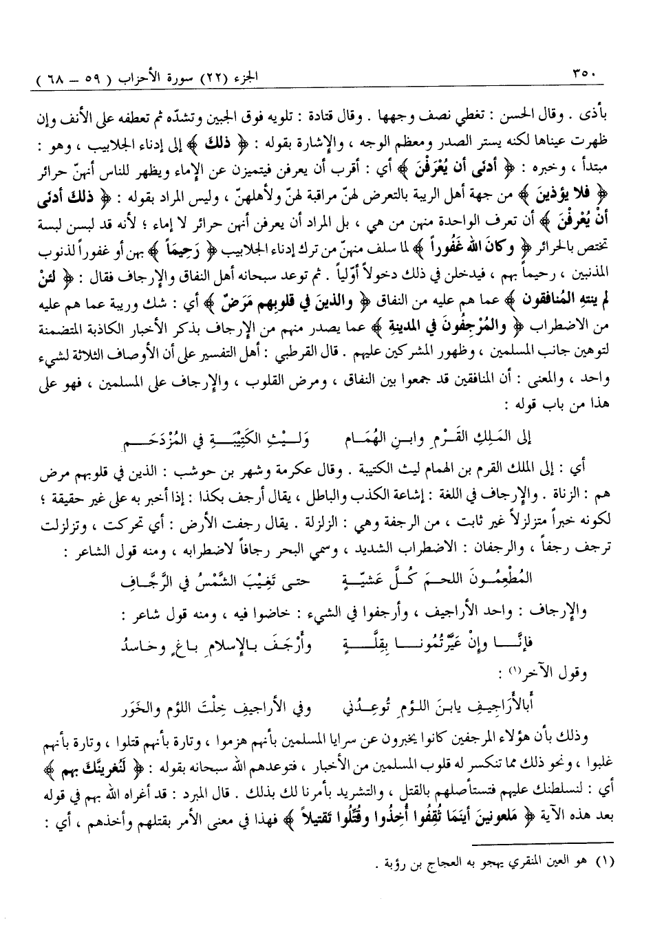 أَيْ: إِلَى الْمَلِكِ الْقَرِمِ بْنِ الْهُمَامِ لَيْثِ الْكَتِيبَةِ. وَقَالَ عِكْرِمَةُ وَشَهْرُ بْنُ حَوْشَبٍ: الَّذِينَ فِي قُلُوبِهِمْ مَرَضٌ هُمُ: الزُّنَاةُ. وَالْإِرْجَافُ فِي اللُّغَةِ: إِشَاعَةُ الْكَذِبِ وَالْبَاطِلِ، يُقَالُ أَرْجَفَ بِكَذَا: إِذَا أَخْبَرَ بِهِ عَلَى غَيْرِ حَقِيقَةٍ لِكَوْنِهِ خَبَرًا مُتَزَلْزِلًا غَيْرَ ثَابِتٍ، مِنَ الرَّجْفَةِ وَهِيَ: الزَّلْزَلَةُ. يُقَالُ رَجَفَتِ الْأَرْضُ: أَيْ تَحَرَّكَتْ، وَتَزَلْزَلَتْ تَرْجُفُ رَجْفًا، وَالرَّجَفَانُ: الِاضْطِرَابُ الشَّدِيدُ، وَسُمِّيَ الْبَحْرُ رَجَّافًا لِاضْطِرَابِهِ، وَمِنْهُ قَوْلُ الشَّاعِرِ: