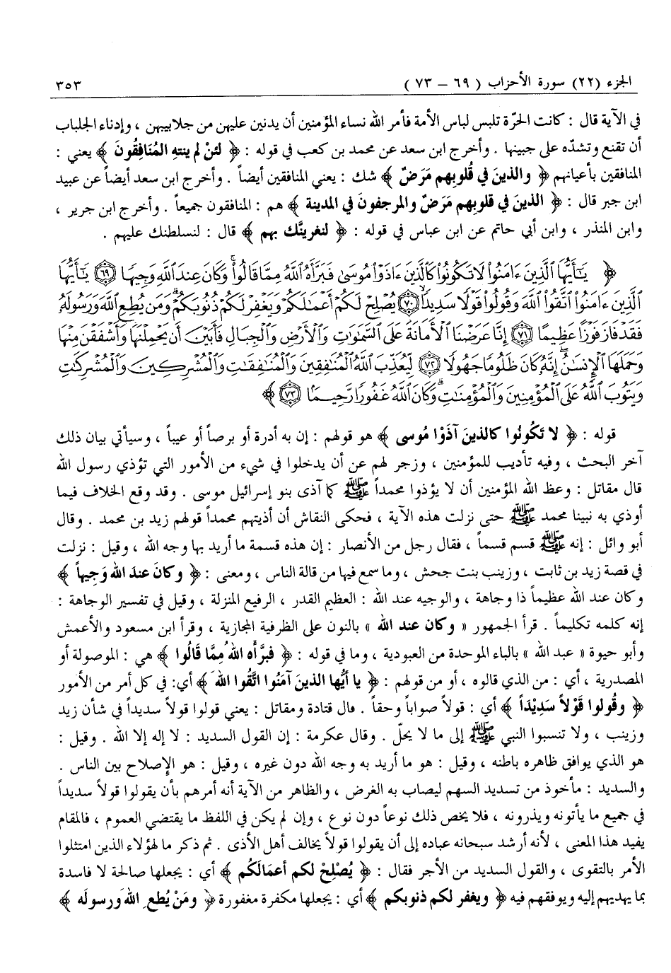 يَا أَيُّهَا الَّذِينَ آمَنُوا لَا تَكُونُوا كَالَّذِينَ آذَوْا مُوسى فَبَرَّأَهُ اللَّهُ مِمَّا قالُوا وَكانَ عِنْدَ اللَّهِ وَجِيهاً (69) يَا أَيُّهَا الَّذِينَ آمَنُوا اتَّقُوا اللَّهَ وَقُولُوا قَوْلاً سَدِيداً (70) يُصْلِحْ لَكُمْ أَعْمالَكُمْ وَيَغْفِرْ لَكُمْ ذُنُوبَكُمْ وَمَنْ يُطِعِ اللَّهَ وَرَسُولَهُ فَقَدْ فازَ فَوْزاً عَظِيماً (71) إِنَّا عَرَضْنَا الْأَمانَةَ عَلَى السَّماواتِ وَالْأَرْضِ وَالْجِبالِ فَأَبَيْنَ أَنْ يَحْمِلْنَها وَأَشْفَقْنَ مِنْها وَحَمَلَهَا الْإِنْسانُ إِنَّهُ كانَ ظَلُوماً جَهُولاً (72) لِيُعَذِّبَ اللَّهُ الْمُنافِقِينَ وَالْمُنافِقاتِ وَالْمُشْرِكِينَ وَالْمُشْرِكاتِ وَيَتُوبَ اللَّهُ عَلَى الْمُؤْمِنِينَ وَالْمُؤْمِناتِ وَكانَ اللَّهُ غَفُوراً رَحِيماً (73)