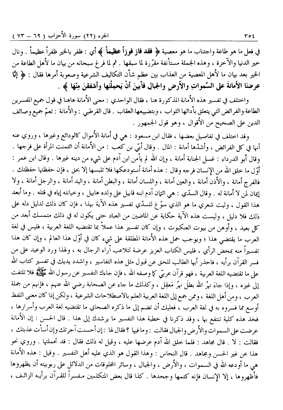 فِي فِعْلِ مَا هُوَ طَاعَةٌ وَاجْتِنَابِ مَا هُوَ مَعْصِيَةٌ فَقَدْ فازَ فَوْزاً عَظِيماً أَيْ: ظَفِرَ بِالْخَيْرِ ظَفَرًا عَظِيمًا. وَنَالَ خَيْرَ الدُّنْيَا وَالْآخِرَةِ، وَهَذِهِ الْجُمْلَةُ مُسْتَأْنَفَةٌ مُقَرِّرَةٌ لِمَا سَبَقَهَا. ثُمَّ لَمَّا فَرَغَ سُبْحَانَهُ مِنْ بَيَانِ مَا لِأَهْلِ الطَّاعَةِ مِنَ الْخَيْرِ بَعْدَ بَيَانِ مَا لِأَهْلِ الْمَعْصِيَةِ مِنَ الْعَذَابِ بَيَّنَ عِظَمَ شَأْنِ التَّكَالِيفِ الشَّرْعِيَّةِ وَصُعُوبَةَ أَمْرِهَا فَقَالَ: إِنَّا عَرَضْنَا الْأَمانَةَ عَلَى السَّماواتِ وَالْأَرْضِ وَالْجِبالِ فَأَبَيْنَ أَنْ يَحْمِلْنَها وَأَشْفَقْنَ مِنْها.