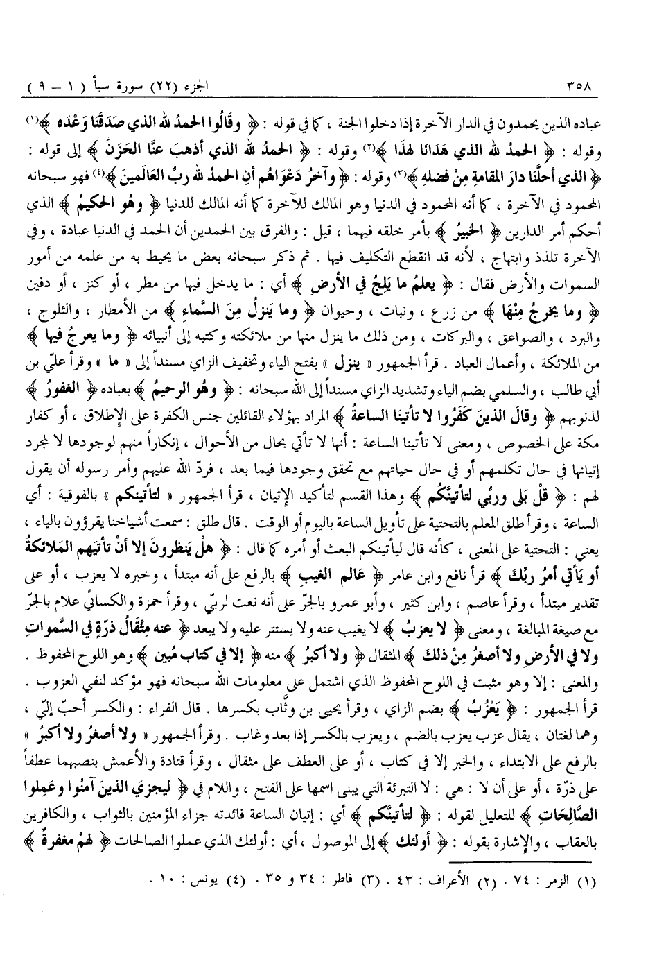 قَرَأَ الْجُمْهُورُ: يَعْزُبُ بِضَمِّ الزَّايِ، وَقَرَأَ يَحْيَى بْنُ وَثَّابٍ بِكَسْرِهَا. قَالَ الْفَرَّاءُ: وَالْكَسْرُ أَحَبُّ إِلَيَّ، وَهُمَا لُغَتَانِ، يُقَالُ عَزَبَ يَعْزُبُ بِالضَّمِّ، وَيَعْزِبُ بِالْكَسْرِ إِذَا بَعُدَ وَغَابَ. وَقَرَأَ الْجُمْهُورُ «وَلَا أَصْغَرُ وَلَا أَكْبَرُ» بِالرَّفْعِ عَلَى الِابْتِدَاءِ، وَالْخَبَرُ إِلَّا فِي كِتَابٍ، أَوْ عَلَى الْعَطْفِ عَلَى مِثْقَالُ، وَقَرَأَ قَتَادَةُ وَالْأَعْمَشُ بِنَصْبِهِمَا عَطْفًا عَلَى ذَرَّةٍ، أَوْ عَلَى أَنَّ لَا: هِيَ: لَا التَّبْرِئَةِ الَّتِي يُبْنَى اسْمُهَا عَلَى الْفَتْحِ، وَاللَّامُ فِي لِيَجْزِيَ الَّذِينَ آمَنُوا وَعَمِلُوا الصَّالِحاتِ لِلتَّعْلِيلِ لِقَوْلِهِ: لَتَأْتِيَنَّكُمْ أَيْ: إِتْيَانُ السَّاعَةِ فَائِدَتُهُ جَزَاءُ الْمُؤْمِنِينَ بِالثَّوَابِ، وَالْكَافِرِينَ بِالْعِقَابِ، وَالْإِشَارَةُ بِقَوْلِهِ: أُولئِكَ إِلَى الْمَوْصُولِ، أَيْ: أولئك الذي عملوا الصالحات لَهُمْ مَغْفِرَةٌ