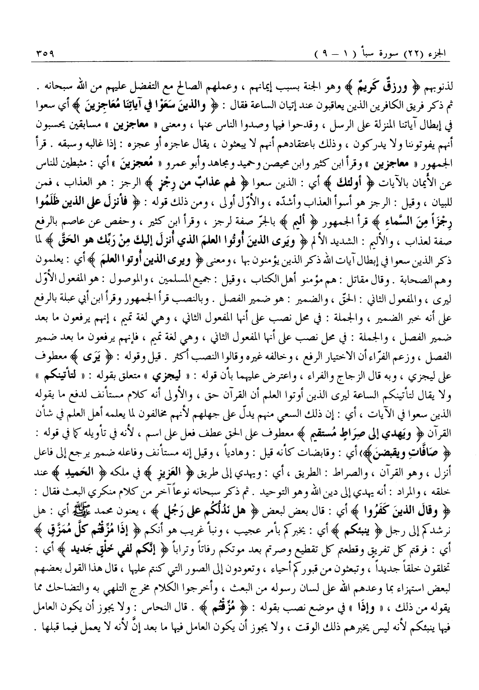ثُمَّ ذَكَرَ فَرِيقَ الْكَافِرِينَ الَّذِينَ يُعَاقَبُونَ عِنْدَ إِتْيَانِ السَّاعَةِ فَقَالَ: وَالَّذِينَ سَعَوْا فِي آياتِنا مُعاجِزِينَ أَيْ سَعَوْا فِي إِبْطَالِ آيَاتِنَا الْمُنَزَّلَةِ عَلَى الرُّسُلِ، وَقَدَحُوا فِيهَا وَصَدُّوا النَّاسَ عَنْهَا، وَمَعْنَى «مُعَاجِزِينَ» مُسَابِقِينَ يَحْسَبُونَ أَنَّهُمْ يَفُوتُونَنَا وَلَا يُدْرَكُونَ، وَذَلِكَ بِاعْتِقَادِهِمْ أَنَّهُمْ لَا يُبْعَثُونَ، يقال عاجزه أو عجزه: إِذَا غَالَبَهُ وَسَبَقَهُ. قَرَأَ الْجُمْهُورُ مُعاجِزِينَ وَقَرَأَ ابْنُ كَثِيرٍ وَابْنُ مُحَيْصِنٍ وَحُمَيْدٌ وَمُجَاهِدٌ وَأَبُو عَمْرٍو «مُعَجِّزِينَ» أَيْ: مُثَبِّطِينَ لِلنَّاسِ عَنِ الْإِيمَانِ بِالْآيَاتِ أُولئِكَ أَيِ: الَّذِينَ سَعَوْا لَهُمْ عَذابٌ مِنْ رِجْزٍ الرجز: هو العذاب، فمن لِلْبَيَانِ، وَقِيلَ: الرِّجْزُ هُوَ أَسْوَأُ الْعَذَابِ وَأَشَدُّهُ، وَالْأَوَّلُ أَوْلَى، وَمِنْ ذَلِكَ قَوْلُهُ: فَأَنْزَلْنا عَلَى الَّذِينَ ظَلَمُوا رِجْزاً مِنَ السَّماءِ قَرَأَ الْجُمْهُورُ «أَلِيمٍ» بِالْجَرِّ صِفَةً لِرِجْزٍ، وَقَرَأَ ابْنُ كَثِيرٍ، وَحَفْصٌ عَنْ عَاصِمٍ بِالرَّفْعِ صِفَةً لعذاب، وَالْأَلِيمُ: الشَّدِيدُ الْأَلَمِ وَيَرَى الَّذِينَ أُوتُوا الْعِلْمَ الَّذِي أُنْزِلَ إِلَيْكَ مِنْ رَبِّكَ هُوَ الْحَقَّ لَمَّا ذَكَرَ الَّذِينَ سَعَوْا فِي إِبْطَالِ آيَاتِ الله ذكر الذين يؤمنون بها، ومعنى وَيَرَى الَّذِينَ أُوتُوا الْعِلْمَ أَيْ: يَعْلَمُونَ وَهُمُ الصَّحَابَةُ. وَقَالَ مُقَاتِلٌ: هُمْ مُؤْمِنُو أَهْلِ الْكِتَابِ، وَقِيلَ: جَمِيعُ الْمُسْلِمِينَ، وَالْمَوْصُولُ: هُوَ الْمَفْعُولُ الْأَوَّلُ ليرى، وَالْمَفْعُولُ الثَّانِي: الْحَقَّ، وَالضَّمِيرُ: هُوَ ضَمِيرُ الْفَصْلِ. وَبِالنَّصْبِ قَرَأَ الْجُمْهُورُ وَقَرَأَ ابْنُ أَبِي عَبْلَةَ بِالرَّفْعِ عَلَى أَنَّهُ خَبَرُ الضَّمِيرِ، وَالْجُمْلَةُ: فِي مَحَلِّ نَصْبٍ عَلَى أَنَّهَا الْمَفْعُولُ الثَّانِي، وَهِيَ لغة تميم، إنهم يرفعون ما بعد ضمير الفصل، وَالْجُمْلَةُ: فِي مَحَلِّ نَصْبٍ عَلَى أَنَّهَا الْمَفْعُولُ الثَّانِي، وهي لغة تميم، فإنهم يرفعون مَا بَعْدَ ضَمِيرِ الْفَصْلِ، وَزَعَمَ الْفَرَّاءُ أَنَّ الِاخْتِيَارَ الرَّفْعُ، وَخَالَفَهُ غَيْرُهُ وَقَالُوا النَّصْبُ أَكْثَرُ. قِيلَ وَقَوْلُهُ: يَرَى مَعْطُوفٌ عَلَى لِيَجْزِيَ، وَبِهِ قال الزجاج والفراء، واعترض عليهما بِأَنَّ قَوْلَهُ: «لِيَجْزِيَ» مُتَعَلِّقٌ بِقَوْلِهِ: «لَتَأْتِيَنَّكُمْ» وَلَا يُقَالُ لَتَأْتِيَنَّكُمُ السَّاعَةُ لِيَرَى الَّذِينَ أُوتُوا الْعِلْمَ أَنَّ الْقُرْآنَ حَقٌّ، وَالْأَوْلَى أَنَّهُ كَلَامٌ مُسْتَأْنَفٌ لِدَفْعِ مَا يَقُولُهُ الَّذِينَ سَعَوْا فِي الْآيَاتِ، أي: إن ذلك السعي مِنْهُمْ يَدُلُّ عَلَى جَهْلِهِمْ لِأَنَّهُمْ مُخَالِفُونَ لِمَا يَعْلَمُهُ أَهْلُ الْعِلْمِ فِي شَأْنِ الْقُرْآنِ وَيَهْدِي مَنْ يَشاءُ إِلى صِراطٍ مُسْتَقِيمٍ مَعْطُوفٌ عَلَى الْحَقَّ عَطْفَ فِعْلٍ عَلَى اسْمٍ، لِأَنَّهُ فِي تَأْوِيلِهِ كَمَا فِي قَوْلِهِ: