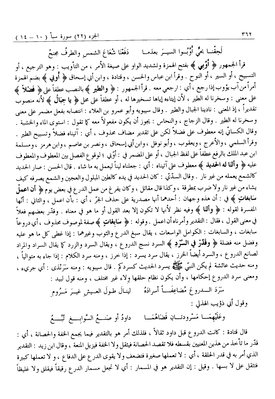 وَقَرَأَ السُّلَمِيُّ، وَالْأَعْرَجُ، وَيَعْقُوبُ، وَأَبُو نَوْفَلٍ، وَابْنُ أَبِي إِسْحَاقَ، وَنَصْرُ بْنُ عَاصِمٍ، وابن هرمز، ومسلمة ابن عَبْدِ الْمَلِكِ بِالرَّفْعِ عَطْفًا عَلَى لَفْظِ الْجِبَالِ، أَوْ عَلَى الْمُضْمَرِ فِي: أَوِّبِي لِوُقُوعِ الْفَصْلِ بَيْنَ الْمَعْطُوفِ وَالْمَعْطُوفِ عَلَيْهِ وَأَلَنَّا لَهُ الْحَدِيدَ مَعْطُوفٌ عَلَى آتَيْنَاهُ: أَيْ: جَعَلْنَاهُ لَيِّنًا لِيَعْمَلَ بِهِ مَا شَاءَ. قَالَ الْحَسَنُ: صَارَ الْحَدِيدُ كَالشَّمْعِ يَعْمَلُهُ مِنْ غَيْرِ نَارٍ. وَقَالَ السُّدِّيُّ: كَانَ الْحَدِيدُ فِي يَدِهِ كَالطِّينِ الْمَبْلُولِ وَالْعَجِينِ وَالشَّمْعِ يُصَرِّفُهُ كَيْفَ يَشَاءُ مِنْ غَيْرِ نَارٍ وَلَا ضَرْبٍ بِمِطْرَقَةٍ، وَكَذَا قَالَ مُقَاتِلٌ، وَكَانَ يَفْرَغُ مِنْ عَمَلِ الدِّرْعِ فِي بَعْضِ يَوْمٍ أَنِ اعْمَلْ سابِغاتٍ فِي: أَنْ هَذِهِ وَجْهَانِ: أحدهما أنها مصدرية على حذف الْجَرِّ، أَيْ: بِأَنِ اعْمَلْ، وَالثَّانِي: أَنَّهَا الْمُفَسِّرَةُ لِقَوْلِهِ: وَأَلَنَّا وَفِيهِ نَظَرٌ لِأَنَّهَا لَا تَكُونُ إِلَّا بَعْدَ الْقَوْلِ أَوْ مَا هُوَ فِي معناه. وقدّر بعضهم فعلا في مَعْنَى الْقَوْلِ، فَقَالَ: التَّقْدِيرُ وَأَمَرْنَاهُ أَنِ اعْمَلْ. وَقَوْلُهُ: سابِغاتٍ صِفَةٌ لِمَوْصُوفٍ مَحْذُوفٍ، أَيْ دُرُوعًا سَابِغَاتٍ، وَالسَّابِغَاتُ: الْكَوَامِلُ الْوَاسِعَاتُ، يُقَالُ سَبَغَ الدِّرْعُ وَالثَّوْبُ وَغَيْرُهُمَا: إِذَا غَطَّى كُلَّ مَا هُوَ عَلَيْهِ وَفَضَلَ مِنْهُ فَضْلَةٌ وَقَدِّرْ فِي السَّرْدِ السَّرْدُ نَسْجُ الدُّرُوعِ، وَيُقَالُ السَّرْدُ وَالزَّرْدُ كَمَا يقال السراد والمراد لِصَانِعِ الدُّرُوعِ، وَالسَّرْدُ أَيْضًا الْخَرْزُ، يُقَالُ سَرَدَ يَسْرُدُ: إِذَا خَرَزَ، وَمِنْهُ سَرَدَ الْكَلَامَ: إِذَا جاء به متواليا، ومنه حَدِيثِ عَائِشَةَ لَمْ يَكُنِ النَّبِيُّ صَلَّى اللَّهُ عليه وَسَلَّمَ يَسْرُدُ الْحَدِيثَ كَسَرْدِكُمْ. قَالَ سِيبَوَيْهِ: وَمِنْهُ سرندى: أي جريء، وَمَعْنَى سَرْدِ الدُّرُوعِ إِحْكَامُهَا، وَأَنْ يَكُونَ نِظَامُ حِلَقِهَا وِلَاءً غَيْرَ مُخْتَلِفٍ، وَمِنْهُ قَوْلُ لَبِيدٍ: