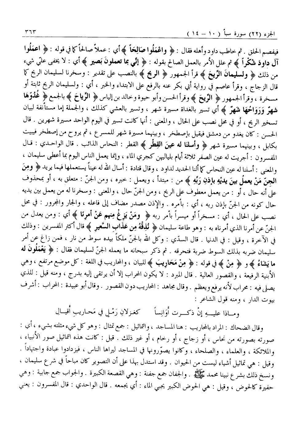فَيَفْصِمَ الْحِلَقَ. ثُمَّ خَاطَبَ دَاوُدَ وَأَهْلَهُ فَقَالَ: وَاعْمَلُوا صالِحاً أَيْ: عَمَلًا صَالِحًا كَمَا فِي قَوْلِهِ: اعْمَلُوا آلَ داوُدَ شُكْراً ثُمَّ عَلَّلَ الْأَمْرَ بِالْعَمَلِ الصَّالِحِ بِقَوْلِهِ: إِنِّي بِما تَعْمَلُونَ بَصِيرٌ أَيْ: لَا يَخْفَى عَلَيَّ شَيْءٌ مِنْ ذَلِكَ وَلِسُلَيْمانَ الرِّيحَ قَرَأَ الْجُمْهُورُ الرِّيحَ بِالنَّصْبِ عَلَى تَقْدِيرِ: وَسَخَّرْنَا لِسُلَيْمَانَ الرِّيحَ كَمَا قَالَ الزَّجَّاجُ، وَقَرَأَ عَاصِمٌ فِي رِوَايَةِ أَبِي بَكْرٍ عَنْهُ بِالرَّفْعِ عَلَى الِابْتِدَاءِ وَالْخَبَرِ، أَيْ: وَلِسُلَيْمَانَ الرِّيحُ ثَابِتَةٌ أَوْ مُسَخَّرَةٌ، وَقَرَأَ الْجُمْهُورُ الرِّيحَ وَقَرَأَ الْحَسَنُ وَأَبُو حَيْوَةَ وَخَالِدُ بْنُ إِلْيَاسَ «الرِّيَاحَ» بِالْجَمْعِ غُدُوُّها شَهْرٌ وَرَواحُها شَهْرٌ أَيْ تَسِيرُ بِالْغَدَاةِ مَسِيرَةَ شَهْرٍ، وَتَسِيرُ بِالْعَشِيِّ كَذَلِكَ، وَالْجُمْلَةُ إِمَّا مُسْتَأْنَفَةٌ لِبَيَانِ تَسْخِيرِ الرِّيحِ، أَوْ فِي مَحَلِّ نَصْبٍ عَلَى الْحَالِ، وَالْمَعْنَى: أَنَّهَا كَانَتْ تَسِيرُ فِي الْيَوْمِ الْوَاحِدِ مَسِيرَةَ شَهْرَيْنِ. قَالَ الْحَسَنُ: كَانَ يَغْدُو مِنْ دِمَشْقَ فَيَقِيلُ بِإِصْطَخْرَ، وَبَيْنَهُمَا مَسِيرَةُ شَهْرٍ لِلْمُسْرِعِ، ثُمَّ يَرُوحُ مِنْ إِصْطَخْرَ فَيَبِيتُ بِكَابُلَ، وَبَيْنَهُمَا مَسِيرَةُ شَهْرٍ وَأَسَلْنا لَهُ عَيْنَ الْقِطْرِ الْقِطْرُ: النُّحَاسُ الذَّائِبُ. قَالَ الْوَاحِدِيُّ: قَالَ الْمُفَسِّرُونَ: أُجْرِيَتْ لَهُ عَيْنُ الصُّفْرِ ثَلَاثَةَ أَيَّامٍ بِلَيَالِيهِنَّ كَجَرْيِ الْمَاءِ، وَإِنَّمَا يَعْمَلُ النَّاسُ الْيَوْمَ بِمَا أُعْطِيَ سُلَيْمَانُ، وَالْمَعْنَى: أَسَلْنَا لَهُ عَيْنَ النُّحَاسِ كَمَا أَلَنَّا الْحَدِيدَ لِدَاوُدَ، وَقَالَ قَتَادَةُ: أَسَالَ اللَّهُ لَهُ عَيْنًا يَسْتَعْمِلُهَا فِيمَا يُرِيدُ وَمِنَ الْجِنِّ مَنْ يَعْمَلُ بَيْنَ يَدَيْهِ بِإِذْنِ رَبِّهِ من: مبتدأ، ويعمل: خبره، ومن الْجِنِّ: مُتَعَلِّقٌ بِهِ، أَوْ بِمَحْذُوفٍ عَلَى أَنَّهُ حَالٌ، أَوْ: مَنْ يَعْمَلُ مَعْطُوفٌ عَلَى الرِّيحِ، ومن الْجِنِّ حَالٌ، وَالْمَعْنَى: وَسَخَّرْنَا لَهُ مَنْ يَعْمَلُ بَيْنَ يَدَيْهِ حَالَ كَوْنِهِ مِنَ الْجِنِّ بِإِذْنِ رَبِّهِ، أَيْ: بِأَمْرِهِ. وَالْإِذْنُ مَصْدَرٌ مُضَافٌ إِلَى فَاعِلِهِ، وَالْجَارُّ وَالْمَجْرُورُ: فِي مَحَلِّ نَصْبٍ عَلَى الْحَالِ، أَيْ: مُسَخَّرًا أَوْ مُيَسَّرًا بِأَمْرِ رَبِّهِ وَمَنْ يَزِغْ مِنْهُمْ عَنْ أَمْرِنا أَيْ: وَمَنْ يَعْدِلْ مِنَ الْجِنِّ عَنْ أَمْرِنَا الَّذِي أَمَرْنَاهُ بِهِ: وَهُوَ طَاعَةُ سُلَيْمَانَ نُذِقْهُ مِنْ عَذابِ السَّعِيرِ قَالَ أَكْثَرُ الْمُفَسِّرِينَ: وَذَلِكَ فِي الْآخِرَةِ، وَقِيلَ: فِي الدُّنْيَا. قَالَ السُّدِّيُّ: وَكَّلَ اللَّهُ بالجنّ ملكا بيده سوط من نار، فَمَنْ زَاغَ عَنْ أَمْرِ سُلَيْمَانَ ضَرَبَهُ بِذَلِكَ السَّوْطِ ضَرْبَةً فَتَحْرُقَهُ. ثُمَّ ذَكَرَ سُبْحَانَهُ مَا يَعْمَلُهُ الْجِنُّ لِسُلَيْمَانَ فَقَالَ: يَعْمَلُونَ لَهُ مَا يَشاءُ ومِنْ فِي قَوْلِهِ: مِنْ مَحارِيبَ لِلْبَيَانِ، وَالْمَحَارِيبُ فِي اللُّغَةِ: كُلُّ مَوْضِعٍ مُرْتَفِعٍ، وَهِيَ الْأَبْنِيَةُ الرَّفِيعَةُ، وَالْقُصُورُ الْعَالِيَةُ. قَالَ الْمُبَرِّدُ: لَا يَكُونُ الْمِحْرَابُ إِلَّا أَنْ يُرْتَقَى إِلَيْهِ بِدَرَجٍ، وَمِنْهُ قِيلَ: لِلَّذِي يُصَلَّى فِيهِ: مِحْرَابٌ لِأَنَّهُ يُرْفَعُ وَيُعَظَّمُ. وَقَالَ مُجَاهِدٌ: الْمَحَارِيبُ دُونَ الْقُصُورِ. وَقَالَ أَبُو عُبَيْدَةَ: الْمِحْرَابُ: أَشْرَفُ بُيُوتِ الدَّارِ، وَمِنْهُ قَوْلُ الشَّاعِرِ:
