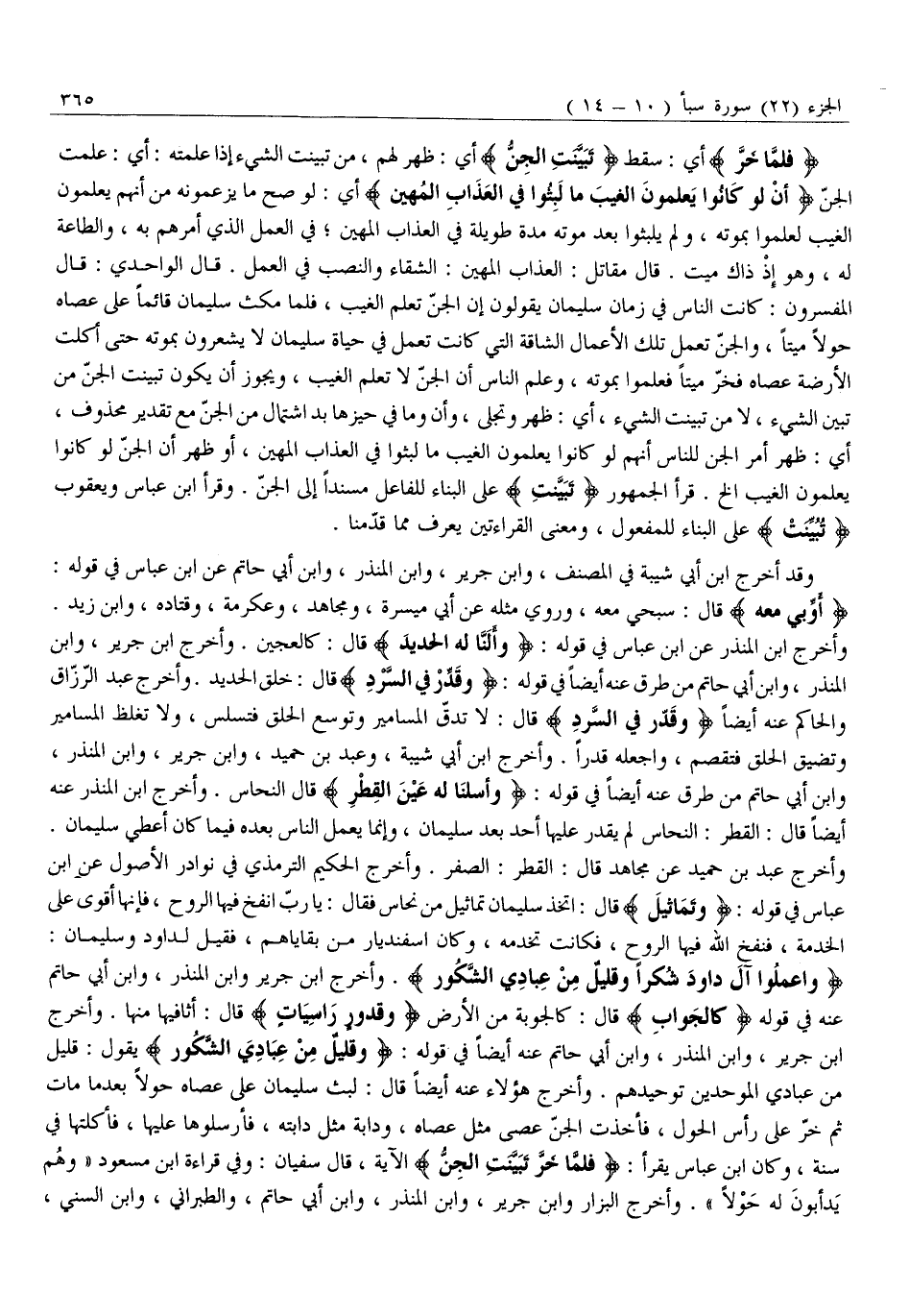 اعْمَلُوا آلَ داوُدَ شُكْراً وَقَلِيلٌ مِنْ عِبادِيَ الشَّكُورُ. وَأَخْرَجَ ابْنُ جَرِيرٍ وَابْنُ الْمُنْذِرِ، وَابْنُ أَبِي حَاتِمٍ عَنْهُ فِي قَوْلِهِ كَالْجَوابِ قَالَ: كَالْجَوْبَةِ مِنَ الْأَرْضِ وَقُدُورٍ راسِياتٍ قال: أثافيها منها. وَأَخْرَجَ ابْنُ جَرِيرٍ، وَابْنُ الْمُنْذِرِ، وَابْنُ أَبِي حَاتِمٍ عَنْهُ أَيْضًا فِي قَوْلِهِ: وَقَلِيلٌ مِنْ عِبادِيَ الشَّكُورُ يَقُولُ: قَلِيلٌ مِنْ عِبَادِيَ الْمُوَحِّدِينَ تَوْحِيدَهُمْ. وَأَخْرَجَ هَؤُلَاءِ عَنْهُ أَيْضًا قَالَ: لَبِثَ سُلَيْمَانُ عَلَى عَصَاهُ حَوْلًا بَعْدَ مَا مَاتَ ثُمَّ خَرَّ عَلَى رَأْسِ الْحَوْلِ، فَأَخَذَتِ الْجِنُّ عصى مِثْلَ عَصَاهُ، وَدَابَّةً مِثْلَ دَابَّتِهِ، فَأَرْسَلُوهَا عَلَيْهَا، فَأَكَلَتْهَا فِي سَنَةٍ، وَكَانَ ابْنُ عَبَّاسٍ يَقْرَأُ: فَلَمَّا خَرَّ تَبَيَّنَتِ الْجِنُّ الْآيَةَ، قَالَ سُفْيَانُ: وَفِي قِرَاءَةِ ابْنِ مَسْعُودٍ «وَهُمْ يَدْأَبُونَ لَهُ حَوْلًا» . وَأَخْرَجَ الْبَزَّارُ وَابْنُ جَرِيرٍ، وَابْنُ الْمُنْذِرِ، وَابْنُ أَبِي حَاتِمٍ، وَالطَّبَرَانِيُّ، وَابْنُ السُّنِّيِّ،