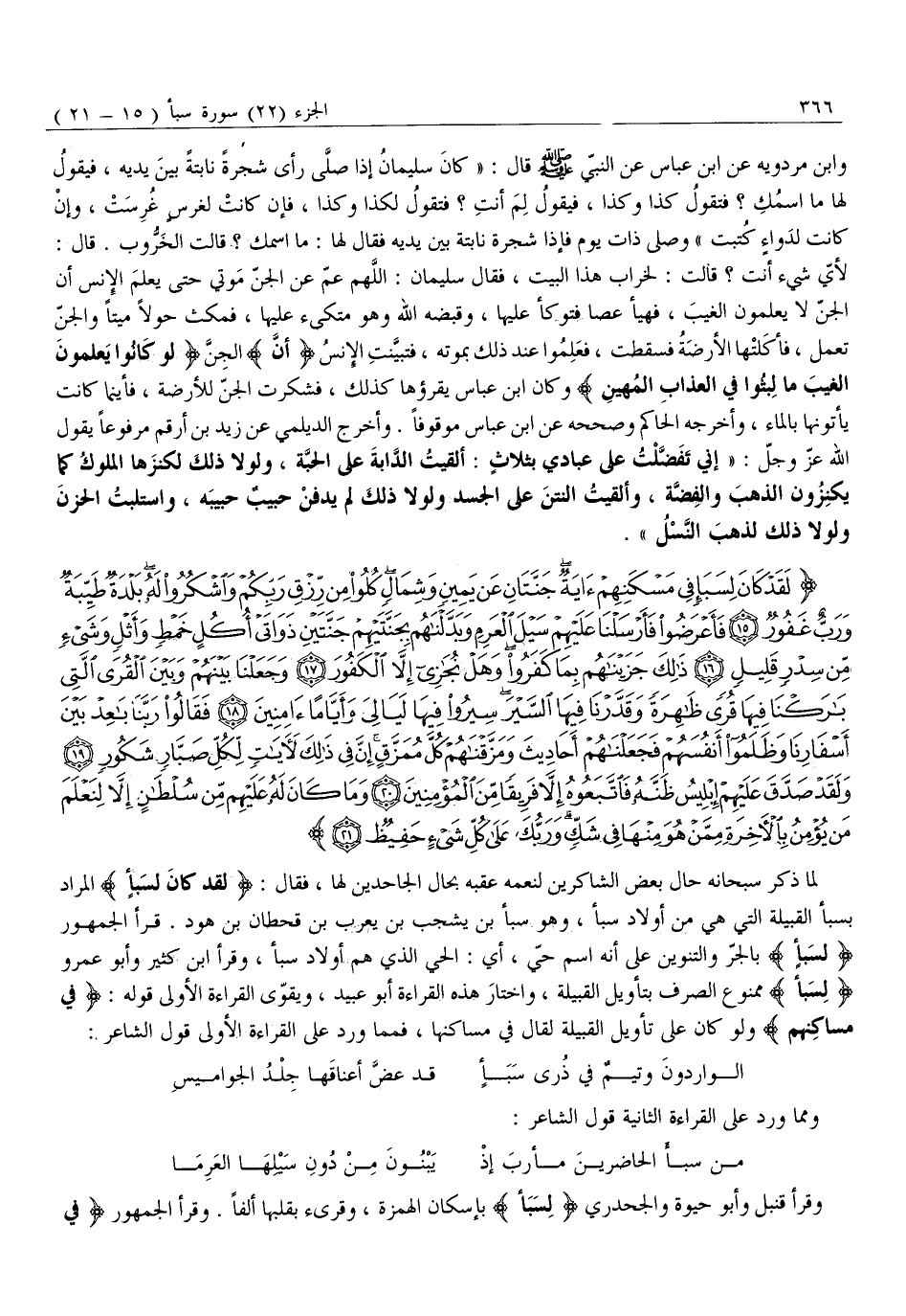 لَمَّا ذَكَرَ سُبْحَانَهُ حَالَ بَعْضِ الشَّاكِرِينَ لِنِعَمِهِ عَقَّبَهُ بحال الْجَاحِدِينَ لَهَا، فَقَالَ: لَقَدْ كانَ لِسَبَإٍ الْمُرَادُ بِسَبَإٍ الْقَبِيلَةُ الَّتِي هِيَ مِنْ أَوْلَادِ سَبَإٍ، وَهُوَ سَبَأُ بْنُ يَشْجُبَ بْنِ يَعْرُبَ بْنِ قَحْطَانَ بْنِ هُودٍ. قَرَأَ الْجُمْهُورُ لِسَبَإٍ بِالْجَرِّ وَالتَّنْوِينِ عَلَى أَنَّهُ اسْمُ حَيٍّ، أَيِ: الْحَيُّ الذي هُمْ أَوْلَادُ سَبَأٍ، وَقَرَأَ ابْنُ كَثِيرٍ وَأَبُو عَمْرٍو لِسَبَإٍ مَمْنُوعَ الصَّرْفِ بِتَأْوِيلِ الْقَبِيلَةِ، وَاخْتَارَ هَذِهِ الْقِرَاءَةَ أَبُو عُبَيْدٍ، وَيُقَوِّي الْقِرَاءَةَ الْأُولَى قوله: فِي مَسْكَنِهِمْ وَلَوْ كَانَ عَلَى تَأْوِيلِ الْقَبِيلَةِ لَقَالَ فِي مساكنها، فمما وَرَدَ عَلَى الْقِرَاءَةِ الْأُولَى قَوْلُ الشَّاعِرِ: