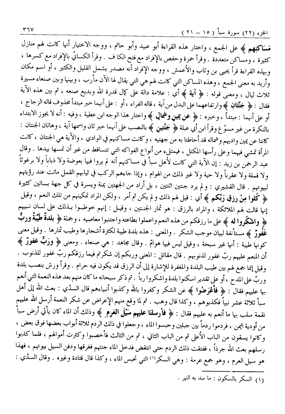 وَقِيلَ إِنَّمَا جَمَعَ لَهُمْ بَيْنَ طِيبِ الْبَلْدَةِ وَالْمَغْفِرَةِ لِلْإِشَارَةِ إِلَى أَنَّ الرِّزْقَ قَدْ يَكُونُ فِيهِ حَرَامٌ. وَقَرَأَ ورش بنصب بلدة وربّ عَلَى الْمَدْحِ، أَوْ عَلَى تَقْدِيرِ اسْكُنُوا بَلْدَةً وَاشْكُرُوا رَبًّا. ثُمَّ ذَكَرَ سُبْحَانَهُ مَا كَانَ مِنْهُمْ بَعْدَ هَذِهِ النِّعْمَةِ الَّتِي أَنْعَمَ بِهَا عَلَيْهِمْ فَقَالَ: فَأَعْرَضُوا عَنِ الشُّكْرِ وَكَفَرُوا بِاللَّهِ وَكَذَّبُوا أَنْبِيَاءَهُمْ قَالَ السُّدِّيُّ: بَعَثَ اللَّهُ إِلَى أَهْلِ سَبَأٍ ثَلَاثَةَ عَشَرَ نَبِيًّا فَكَذَّبُوهُمْ، وَكَذَا قَالَ وَهْبٌ. ثُمَّ لَمَّا وَقَعَ مِنْهُمُ الْإِعْرَاضَ عَنْ شُكْرِ النِّعْمَةِ أَرْسَلَ اللَّهُ عَلَيْهِمْ نِقْمَةً سَلَبَ بِهَا مَا أَنْعَمَ بِهِ عَلَيْهِمْ فَقَالَ: فَأَرْسَلْنا عَلَيْهِمْ سَيْلَ الْعَرِمِ وَذَلِكَ أَنَّ الْمَاءَ كَانَ يَأْتِي أَرْضَ سَبَأٍ مِنْ أَوْدِيَةِ الْيَمَنِ، فَرَدَمُوا رَدْمًا بَيْنَ جَبَلَيْنِ وَحَبَسُوا الْمَاءَ، وَجَعَلُوا فِي ذَلِكَ الرَّدْمِ ثَلَاثَةَ أَبْوَابٍ بَعْضُهَا فَوْقَ بَعْضٍ، وَكَانُوا يَسْقُونَ مِنَ الْبَابِ الْأَعْلَى ثُمَّ مِنَ الْبَابِ الثَّانِي، ثُمَّ مِنَ الثَّالِثِ فَأَخْصَبُوا وَكَثُرَتْ أَمْوَالُهُمْ، فَلَمَّا كَذَّبُوا رُسُلَهُمْ بَعَثَ اللَّهُ جُرَذًا، فَفَتَقَتْ ذَلِكَ الرَّدْمَ حَتَّى انْتَقَضَ فَدَخَلَ الْمَاءُ جَنَّتَهُمْ فَغَرَّقَهَا وَدَفَنَ السَّيْلُ بُيُوتَهُمْ، فَهَذَا هو سيل العرم، وهو جمع عرمة: وهي السَّكْرُ «1» الَّتِي تَحْبِسُ الْمَاءَ، وَكَذَا قَالَ قَتَادَةُ وغيره. وقال السدّي: