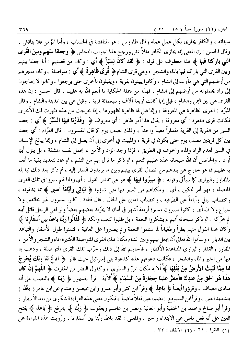 وَقَالَ الْحَسَنُ: إِنَّ الْمَعْنَى إِنَّهُ يُجَازِي الْكَافِرَ مِثْلًا بِمِثْلٍ وَرَجَّحَ هَذَا الْجَوَابَ النَّحَّاسُ وَجَعَلْنا بَيْنَهُمْ وَبَيْنَ الْقُرَى الَّتِي بارَكْنا فِيها هَذَا مَعْطُوفٌ عَلَى قَوْلِهِ: لَقَدْ كانَ لِسَبَإٍ أَيْ: وَكَانَ مِنْ قِصَّتِهِمْ: أَنَّا جَعَلْنَا بَيْنَهُمْ وَبَيْنَ الْقُرَى الَّتِي بَارَكْنَا فِيهَا بِالْمَاءِ وَالشَّجَرِ، وَهِيَ قُرَى الشَّامِ قُرىً ظاهِرَةً أَيْ: مُتَوَاصِلَةً، وَكَانَ مَتْجَرُهُمْ مِنْ أَرْضِهِمُ الَّتِي هِيَ مَأْرِبٌ إِلَى الشَّامِ، وَكَانُوا يَبِيتُونَ بِقَرْيَةٍ، وَيَقِيلُونَ بِأُخْرَى حَتَّى يَرْجِعُوا، وَكَانُوا لَا يَحْتَاجُونَ إِلَى زَادٍ يَحْمِلُونَهُ مِنْ أَرْضِهِمْ إِلَى الشَّامِ، فَهَذَا مِنْ جُمْلَةِ الْحِكَايَةِ لِمَا أَنْعَمَ اللَّهُ بِهِ عَلَيْهِمْ. قَالَ الْحَسَنُ: إِنَّ هَذِهِ الْقُرَى هِيَ بَيْنَ الْيَمَنِ وَالشَّامِ، قِيلَ إِنَّهَا كَانَتْ أَرْبَعَةَ آلَافٍ وَسَبْعَمِائَةِ قَرْيَةٍ، وَقِيلَ هِيَ بَيْنَ الْمَدِينَةِ وَالشَّامِ. وَقَالَ الْمُبَرِّدُ: الْقُرَى الظَّاهِرَةُ هِيَ الْمَعْرُوفَةُ، وَإِنَّمَا قِيلَ لَهَا ظَاهِرَةٌ لِظُهُورِهَا، إِذَا خَرَجْتَ مِنْ هَذِهِ ظَهَرَتْ لَكَ الْأُخْرَى فَكَانَتْ قُرًى ظَاهِرَةً: أَيْ مَعْرُوفَةً، يُقَالُ هَذَا أَمْرٌ ظَاهِرٌ: أَيْ مَعْرُوفٌ وَقَدَّرْنا فِيهَا السَّيْرَ أَيْ: جَعَلْنَا السَّيْرَ مِنَ الْقَرْيَةِ إِلَى الْقَرْيَةِ مِقْدَارًا مُعَيَّنًا وَاحِدًا، وَذَلِكَ نِصْفُ يَوْمٍ كَمَا قَالَ الْمُفَسِّرُونَ. قَالَ الْفَرَّاءُ: أَيْ جَعَلْنَا بَيْنَ كُلِّ قَرْيَتَيْنِ نصف يوم حتى يكون فِي قَرْيَةٍ، وَالْمَبِيتُ فِي أُخْرَى إِلَى أَنْ يَصِلَ إِلَى الشَّامِ، وَإِنَّمَا يُبَالِغُ الْإِنْسَانُ فِي السير لعدم الزاد والماء والخوف في الطَّرِيقِ، فَإِذَا وُجِدَ الزَّادُ وَالْأَمْنُ لَمْ يُحَمِّلْ نَفْسَهُ الْمَشَقَّةَ، بَلْ يَنْزِلُ أَيْنَمَا أَرَادَ. وَالْحَاصِلُ أَنَّ اللَّهَ سُبْحَانَهُ عَدَّدَ عَلَيْهِمُ النِّعَمَ، ثُمَّ ذَكَرَ مَا نَزَلَ بِهِمْ مِنَ النِّقَمِ، ثُمَّ عَادَ لِتَعْدِيدِ بَقِيَّةِ مَا أَنْعَمَ بِهِ عَلَيْهِمْ مِمَّا هُوَ خَارِجٌ عَنْ بَلَدِهِمْ مِنِ اتِّصَالِ الْقُرَى بَيْنَهُمْ وَبَيْنَ مَا يُرِيدُونَ السَّفَرَ إِلَيْهِ، ثُمَّ ذَكَرَ بَعْدَ ذَلِكَ تَبْدِيلَهُ بِالْمَفَاوِزِ وَالْبَرَارِي كَمَا سَيَأْتِي وَقَوْلُهُ: سِيرُوا فِيها هُوَ عَلَى تَقْدِيرِ الْقَوْلِ: أَيْ وَقُلْنَا لَهُمْ سِيرُوا فِي تِلْكَ الْقُرَى الْمُتَّصِلَةِ، فَهُوَ أَمْرُ تَمْكِينٍ، أَيْ: ومكناهم من السير فيها متى شاؤوا لَيالِيَ وَأَيَّاماً آمِنِينَ مِمَّا يَخَافُونَهُ، وَانْتِصَابُ لَيَالِيَ وأياما عَلَى الظَّرْفِيَّةِ، وَانْتِصَابُ آمِنِينَ عَلَى الْحَالِ. قَالَ قَتَادَةُ: كَانُوا يَسِيرُونَ غَيْرَ خَائِفِينَ وَلَا جِيَاعٍ ولا ظمأى، كَانُوا يَسِيرُونَ مَسِيرَةَ أَرْبَعَةِ أَشْهُرٍ فِي أَمَانٍ لَا يُحَرِّكُ بَعْضُهُمْ بَعْضًا وَلَوْ لَقِيَ الرَّجُلُ قَاتِلَ أَبِيهِ لَمْ يُحَرِّكْهُ. ثُمَّ ذَكَرَ سُبْحَانَهُ أَنَّهُمْ لَمْ يَشْكُرُوا النِّعْمَةَ، بَلْ طَلَبُوا التَّعَبَ وَالْكَدَّ فَقالُوا رَبَّنا باعِدْ بَيْنَ أَسْفارِنا وَكَانَ هَذَا الْقَوْلُ مِنْهُمْ بَطَرًا وَطُغْيَانًا لَمَّا سَئِمُوا النِّعْمَةَ وَلَمْ يَصْبِرُوا عَلَى الْعَافِيَةِ، فَتَمَنَّوْا طُولَ الْأَسْفَارِ وَالتَّبَاعُدَ بَيْنَ الدِّيَارِ، وَسَأَلُوا اللَّهَ تَعَالَى أَنْ يَجْعَلَ بَيْنَهُمْ وَبَيْنَ الشَّامِ مَكَانَ تِلْكَ الْقُرَى الْمُتَوَاصِلَةِ الْكَثِيرَةِ الْمَاءِ وَالشَّجَرِ وَالْأَمْنِ، الْمَفَاوِزَ وَالْقِفَارَ وَالْبَرَارِي الْمُتَبَاعِدَةَ الْأَقْطَارِ، فَأَجَابَهُمُ 