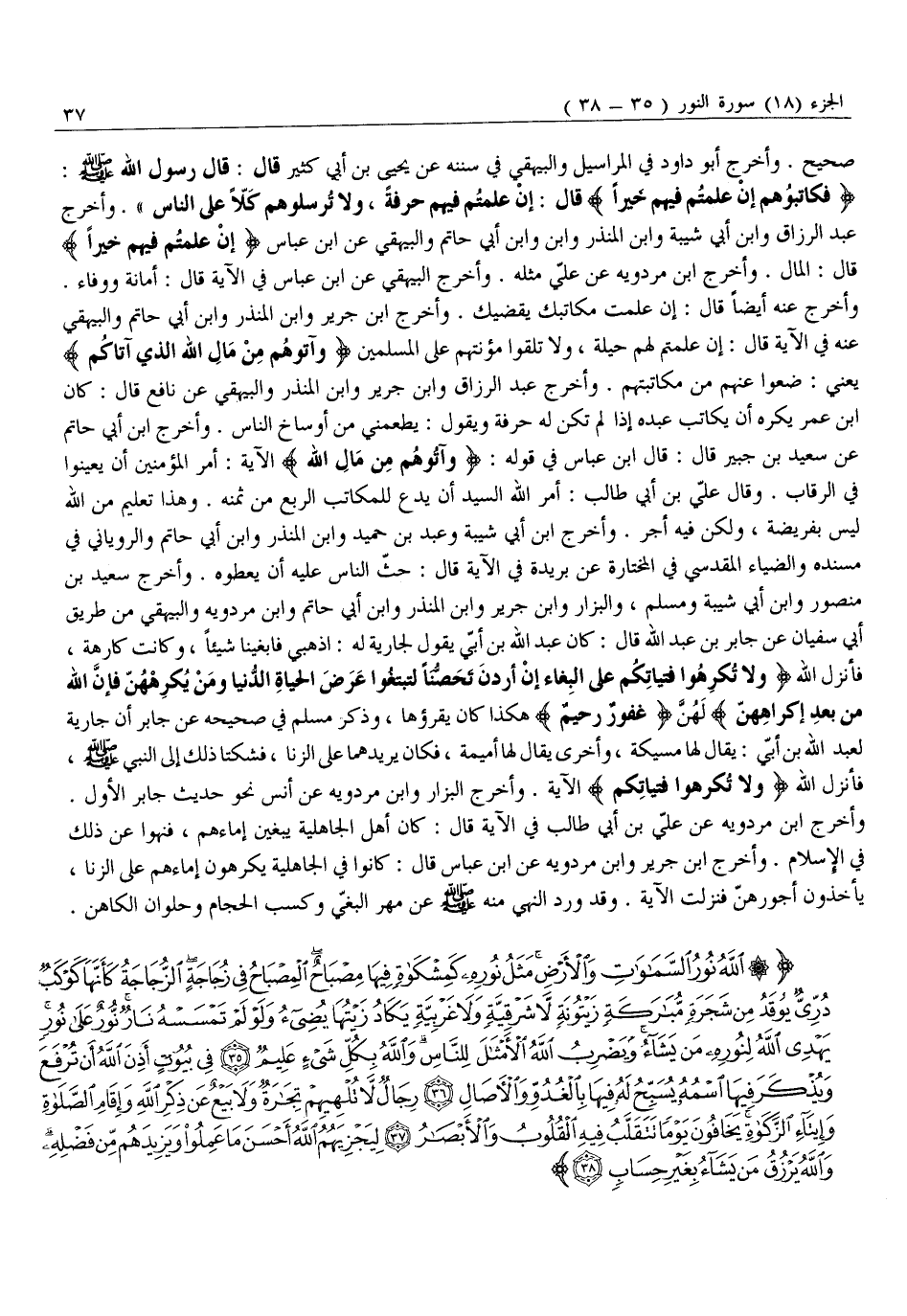 اللَّهُ نُورُ السَّماواتِ وَالْأَرْضِ مَثَلُ نُورِهِ كَمِشْكاةٍ فِيها مِصْباحٌ الْمِصْباحُ فِي زُجاجَةٍ الزُّجاجَةُ كَأَنَّها كَوْكَبٌ دُرِّيٌّ يُوقَدُ مِنْ شَجَرَةٍ مُبارَكَةٍ زَيْتُونَةٍ لَا شَرْقِيَّةٍ وَلا غَرْبِيَّةٍ يَكادُ زَيْتُها يُضِيءُ وَلَوْ لَمْ تَمْسَسْهُ نارٌ نُورٌ عَلى نُورٍ يَهْدِي اللَّهُ لِنُورِهِ مَنْ يَشاءُ وَيَضْرِبُ اللَّهُ الْأَمْثالَ لِلنَّاسِ وَاللَّهُ بِكُلِّ شَيْءٍ عَلِيمٌ (35) فِي بُيُوتٍ أَذِنَ اللَّهُ أَنْ تُرْفَعَ وَيُذْكَرَ فِيهَا اسْمُهُ يُسَبِّحُ لَهُ فِيها بِالْغُدُوِّ وَالْآصالِ (36) رِجالٌ لَا تُلْهِيهِمْ تِجارَةٌ وَلا بَيْعٌ عَنْ ذِكْرِ اللَّهِ وَإِقامِ الصَّلاةِ وَإِيتاءِ الزَّكاةِ يَخافُونَ يَوْماً تَتَقَلَّبُ فِيهِ الْقُلُوبُ وَالْأَبْصارُ (37) لِيَجْزِيَهُمُ اللَّهُ أَحْسَنَ مَا عَمِلُوا وَيَزِيدَهُمْ مِنْ فَضْلِهِ وَاللَّهُ يَرْزُقُ مَنْ يَشاءُ بِغَيْرِ حِسابٍ (38)