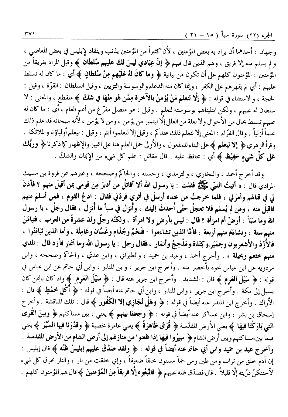 وَقَدْ أَخْرَجَ أَحْمَدُ، وَالْبُخَارِيُّ، وَالتِّرْمِذِيُّ، وَحَسَّنَهُ، وَالْحَاكِمُ وَصَحَّحَهُ، وَغَيْرُهُمْ عَنْ فَرْوَةَ بْنِ مُسَيْكٍ الْمُرَادِيِّ قَالَ: «أَتَيْتُ النَّبِيَّ صَلَّى اللَّهُ عَلَيْهِ وَسَلَّمَ فَقُلْتُ: يَا رَسُولَ اللَّهِ أَلَا أُقَاتِلُ مَنْ أَدْبَرَ مِنْ قَوْمِي بِمَنْ أَقْبَلَ مِنْهُمْ؟ فَأَذِنَ لِي فِي قِتَالِهِمْ وَأَمَرَنِي، فَلَمَّا خَرَجْتُ مِنْ عِنْدِهِ أَرْسَلَ فِي أَثَرِي فَرَدَّنِي فَقَالَ: ادْعُ الْقَوْمَ، فَمَنْ أَسْلَمَ مِنْهُمْ فَاقْبَلْ مِنْهُ، وَمَنْ لَمْ يُسْلِمْ فَلَا تَعْجَلْ حَتَّى أُحْدِثَ إِلَيْكَ، وَأُنْزِلَ فِي سَبَأٍ مَا أُنْزِلَ، فَقَالَ رَجُلٌ، يَا رَسُولَ اللَّهِ وَمَا سَبَأٌ: أَرْضٌ أَمِ امْرَأَةٌ؟ قَالَ: لَيْسَ بِأَرْضٍ وَلَا امْرَأَةٍ، وَلَكِنَّهُ رِجُلٌ وَلَدَ عَشَرَةً مِنَ الْعَرَبِ، فَتَيَامَنَ مِنْهُمْ سِتَّةٌ، وَتَشَاءَمَ مِنْهُمْ أَرْبَعَةٌ، فَأَمَّا الَّذِينَ تَشَاءَمُوا: فَلَخْمٌ وَجُذَامُ وَغَسَّانُ وَعَامِلَةُ، وَأَمَّا الَّذِينَ تَيَامَنُوا، فَالْأَزْدُ وَالْأَشْعَرِيُّونَ وَحِمْيَرُ وَكِنْدَةُ وَمُذْحِجٌ وَأَنْمَارٌ، فَقَالَ رَجُلٌ: يَا رَسُولَ اللَّهِ وَمَا أَنْمَارٌ فأزد قَالَ: الَّذِي مِنْهُمْ خَثْعَمُ وَبَجِيلَةُ» . وَأَخْرَجَ أَحْمَدُ، وَعَبْدُ بْنُ حُمَيْدٍ، وَالطَّبَرَانِيُّ، وَابْنُ عَدِيٍّ، وَالْحَاكِمُ وَصَحَّحَهُ، وَابْنُ مَرْدَوَيْهِ عَنِ ابْنِ عَبَّاسٍ نَحْوَهُ بِأَخْصَرَ مِنْهُ. وَأَخْرَجَ ابْنُ جَرِيرٍ، وَابْنُ الْمُنْذِرِ، وَابْنُ أَبِي حَاتِمٍ عَنِ ابْنِ عَبَّاسٍ فِي قَوْلِهِ: سَيْلَ الْعَرِمِ قَالَ: الشَّدِيدُ. وَأَخْرَجَ ابْنُ جَرِيرٍ عَنْهُ قَالَ: سَيْلَ الْعَرِمِ وَادٍ كَانَ بِالْيَمَنِ كَانَ يَسِيلُ إِلَى مَكَّةَ. وَأَخْرَجَ ابْنُ جَرِيرٍ، وَابْنُ الْمُنْذِرِ، وَابْنُ أَبِي حَاتِمٍ عَنْهُ أَيْضًا فِي قَوْلِهِ: أُكُلٍ خَمْطٍ قَالَ:
