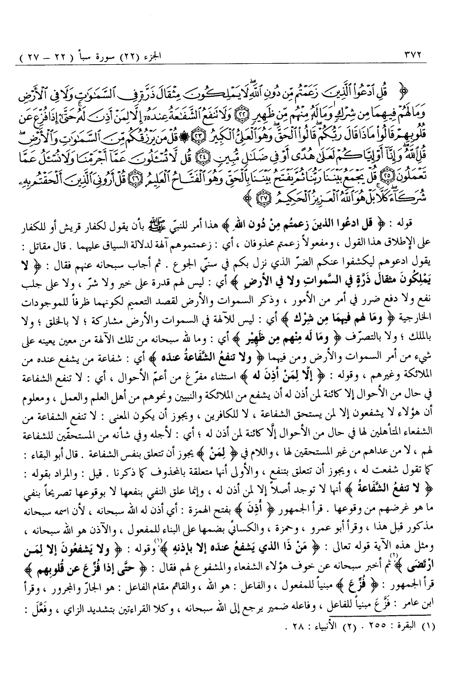 يَقُولُ ادْعُوهُمْ لِيَكْشِفُوا عَنْكُمُ الضُّرَّ الَّذِي نزل بكم في سنّي الْجُوعِ. ثُمَّ أَجَابَ سُبْحَانَهُ عَنْهُمْ فَقَالَ: لَا يَمْلِكُونَ مِثْقالَ ذَرَّةٍ فِي السَّماواتِ وَلا فِي الْأَرْضِ أَيْ: لَيْسَ لَهُمْ قُدْرَةٌ عَلَى خَيْرٍ وَلَا شَرٍّ، وَلَا عَلَى جَلْبِ نَفْعٍ وَلَا دَفْعِ ضَرَرٍ فِي أَمْرٍ مِنَ الْأُمُورِ، وَذَكَرَ السموات وَالْأَرْضَ لِقَصْدِ التَّعْمِيمِ لِكَوْنِهِمَا ظَرْفًا لِلْمَوْجُودَاتِ الْخَارِجِيَّةِ وَما لَهُمْ فِيهِما مِنْ شِرْكٍ أَيْ: لَيْسَ للآلهة في السموات وَالْأَرْضِ مُشَارَكَةٌ لَا بِالْخَلْقِ وَلَا بِالْمِلْكِ وَلَا بِالتَّصَرُّفِ وَما لَهُ مِنْهُمْ مِنْ ظَهِيرٍ أَيْ: وَمَا لِلَّهِ سُبْحَانَهُ مِنْ تِلْكَ الْآلِهَةِ مِنْ معين يعينه على شيء من أمر السموات وَالْأَرْضِ وَمَنْ فِيهِمَا وَلا تَنْفَعُ الشَّفاعَةُ عِنْدَهُ أَيْ: شَفَاعَةُ مَنْ يَشْفَعُ عِنْدَهُ مِنَ الْمَلَائِكَةِ وَغَيْرِهِمْ، وَقَوْلُهُ: إِلَّا لِمَنْ أَذِنَ لَهُ اسْتِثْنَاءٌ مُفَرَّغٌ مِنْ أَعَمِّ الْأَحْوَالِ، أَيْ: لَا تَنْفَعُ الشَّفَاعَةُ فِي حَالٍ مِنَ الْأَحْوَالِ إِلَّا كَائِنَةً لِمَنْ أَذِنَ لَهُ أَنْ يَشْفَعَ مِنَ الْمَلَائِكَةِ وَالنَّبِيِّينَ وَنَحْوِهِمْ مِنْ أَهْلِ الْعِلْمِ وَالْعَمَلِ، وَمَعْلُومٌ أَنَّ هَؤُلَاءِ لَا يَشْفَعُونَ إِلَّا لِمَنْ يَسْتَحِقُّ الشَّفَاعَةَ، لَا لِلْكَافِرِينَ، وَيَجُوزُ أَنْ يَكُونَ الْمَعْنَى: لا تنفع الشفاعة من الشفاء الْمُتَأَهِّلِينَ لَهَا فِي حَالٍ مِنَ الْأَحْوَالِ إِلَّا كَائِنَةً لِمَنْ أَذِنَ لَهُ أَيْ: لِأَجْلِهِ وَفِي شَأْنِهِ مِنَ الْمُسْتَحِقِّينَ لِلشَّفَاعَةِ لَهُمْ، لَا مَنْ عَدَاهُمْ مِنْ غَيْرِ الْمُسْتَحِقِّينَ لَهَا، وَاللَّامُ فِي لِمَنْ يَجُوزُ أَنْ تَتَعَلَّقَ بِنَفْسِ الشَّفَاعَةِ. قَالَ أَبُو الْبَقَاءِ: