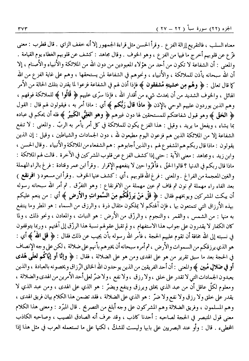 مَاذَا قَالَ رَبُّكُمْ فِي الدُّنْيَا؟ قَالُوا الْحَقَّ، فَأَقَرُّوا حِينَ لَا يَنْفَعُهُمُ الْإِقْرَارُ. وَقَرَأَ ابْنُ عُمَرَ وَقَتَادَةُ: فَرَّغَ بِالرَّاءِ الْمُهْمَلَةِ وَالْغَيْنِ الْمُعْجَمَةِ مِنَ الْفَرَاغِ. وَالْمَعْنَى: فَرَّغَ اللَّهُ قُلُوبَهُمْ، أَيْ: كَشَفَ عَنْهَا الْخَوْفَ. وَقَرَأَ ابْنُ مَسْعُودٍ (افْرُنْقِعَ) بَعْدَ الْفَاءِ رَاءٌ مُهْمَلَةٌ ثُمَّ نُونٌ ثُمَّ قَافٌ ثُمَّ عَيْنٌ مُهْمَلَةٌ مِنَ الِافْرِنْقَاعِ: وَهُوَ التَّفَرُّقُ. ثُمَّ أَمَرَ اللَّهُ سُبْحَانَهُ رَسُولَهُ أَنْ يُبَكِّتَ الْمُشْرِكِينَ وَيُوَبِّخَهُمْ فَقَالَ: قُلْ مَنْ يَرْزُقُكُمْ مِنَ السَّماواتِ وَالْأَرْضِ أَيْ: مَنْ يُنْعِمُ عَلَيْكُمْ بِهَذِهِ الْأَرْزَاقِ الَّتِي تَتَمَتَّعُونَ بِهَا، فَإِنَّ آلِهَتَكُمْ لَا يَمْلِكُونَ مِثْقَالَ ذَرَّةٍ، وَالرِّزْقُ مِنَ السَّمَاءِ: هُوَ الْمَطَرُ وَمَا يُنْتَفَعُ بِهِ مِنْهَا: مِنَ الشَّمْسِ، وَالْقَمَرِ، وَالنُّجُومِ، وَالرِّزْقُ مِنَ الْأَرْضِ: هُوَ النَّبَاتُ، وَالْمَعَادِنُ، وَنَحْوُ ذَلِكَ، وَلَمَّا كَانَ الْكُفَّارُ لَا يَقْدِرُونَ عَلَى جَوَابِ هَذَا الِاسْتِفْهَامِ، وَلَمْ تَقْبَلْ عُقُولُهُمْ نِسْبَةَ هَذَا الرِّزْقِ إِلَى آلِهَتِهِمْ، وَرُبَّمَا يَتَوَقَّفُونَ فِي نِسْبَتِهِ إِلَى اللَّهِ مَخَافَةَ أَنْ تَقُومَ عَلَيْهِمُ الْحُجَّةُ، فَأَمَرَ اللَّهُ رَسُولَهُ بِأَنْ يُجِيبَ عَنْ ذَلِكَ فَقَالَ: قُلِ اللَّهُ أَيْ: