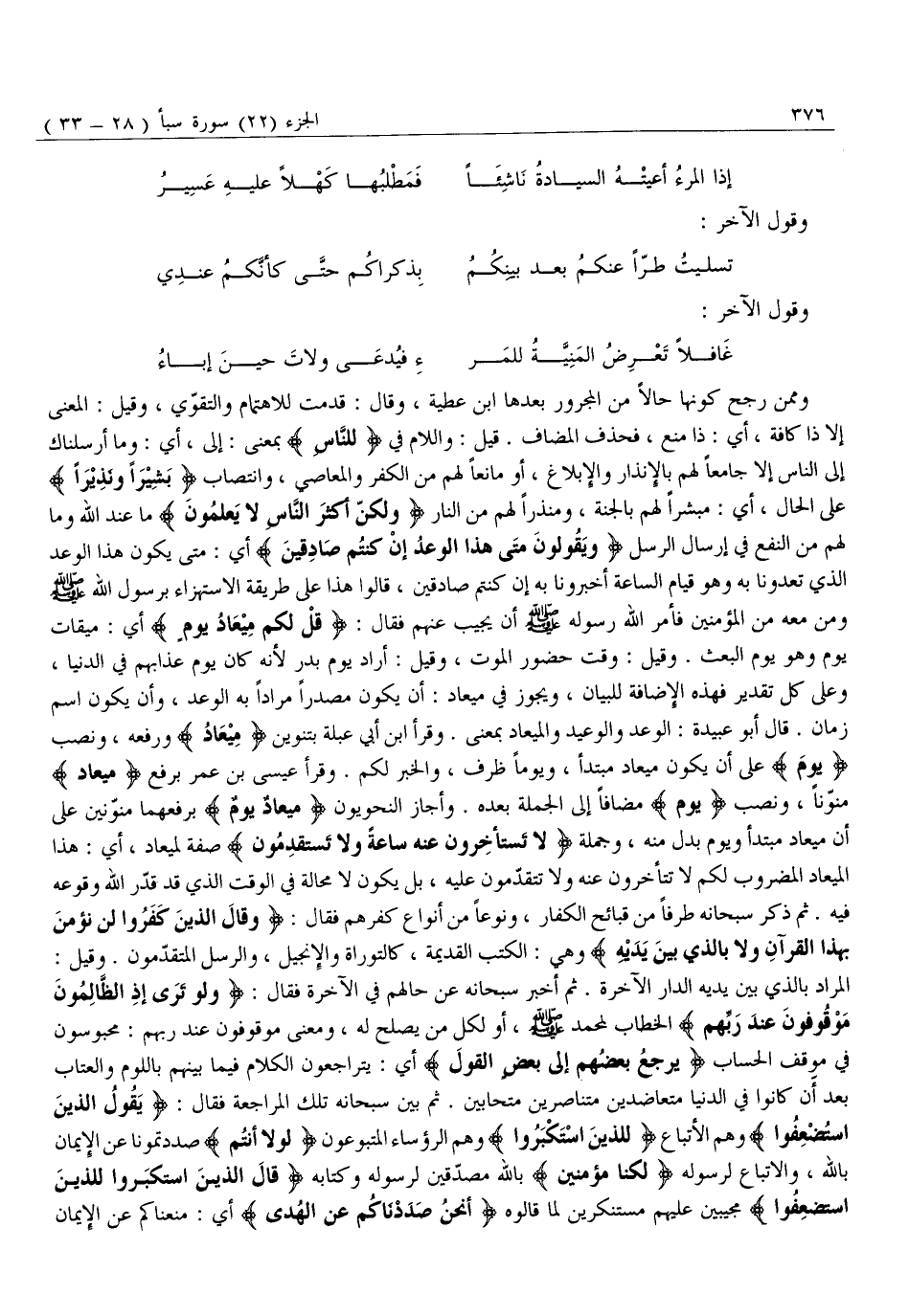وَمِمَّنْ رَجَّحَ كَوْنَهَا حَالًا مِنَ الْمَجْرُورِ بَعْدَهَا ابْنُ عَطِيَّةَ، وَقَالَ: قُدِّمَتْ لِلِاهْتِمَامِ وَالتَّقَوِّي، وَقِيلَ: الْمَعْنَى إِلَّا ذَا كَافَّةٍ، أَيْ: ذَا مَنْعٍ، فَحُذِفَ الْمُضَافُ. قِيلَ: وَاللَّامُ فِي لِلنَّاسِ بِمَعْنَى: إِلَى، أَيْ: وَمَا أَرْسَلْنَاكَ إِلَى النَّاسِ إِلَّا جَامِعًا لَهُمْ بِالْإِنْذَارِ وَالْإِبْلَاغِ، أَوْ مَانِعًا لَهُمْ مِنَ الْكُفْرِ وَالْمَعَاصِي، وَانْتِصَابُ بَشِيراً وَنَذِيراً عَلَى الْحَالِ، أَيْ: مُبَشِّرًا لَهُمْ بِالْجَنَّةِ، وَمُنْذِرًا لَهُمْ مِنَ النَّارِ وَلكِنَّ أَكْثَرَ النَّاسِ لا يَعْلَمُونَ ما عند الله وما لهم مِنَ النَّفْعِ فِي إِرْسَالِ الرُّسُلِ وَيَقُولُونَ مَتى هذَا الْوَعْدُ إِنْ كُنْتُمْ صادِقِينَ أَيْ: مَتَى يَكُونُ هَذَا الْوَعْدُ الَّذِي تَعِدُونَا بِهِ وَهُوَ قِيَامُ السَّاعَةِ أَخْبِرُونَا بِهِ إِنْ كُنْتُمْ صَادِقِينَ، قَالُوا هَذَا عَلَى طَرِيقَةِ الِاسْتِهْزَاءِ بِرَسُولِ اللَّهِ صَلَّى اللَّهُ عَلَيْهِ وَسَلَّمَ وَمَنْ مَعَهُ مِنَ الْمُؤْمِنِينَ فَأَمَرَ اللَّهُ رَسُولَهُ صَلَّى اللَّهُ عَلَيْهِ وَسَلَّمَ أَنْ يُجِيبَ عَنْهُمْ فَقَالَ: قُلْ لَكُمْ مِيعادُ يَوْمٍ أَيْ: مِيقَاتُ يَوْمٍ وَهُوَ يَوْمُ الْبَعْثِ. وَقِيلَ: وَقْتُ حُضُورِ الْمَوْتِ، وَقِيلَ: أَرَادَ يَوْمَ بَدْرٍ لِأَنَّهُ كَانَ يَوْمَ عَذَابِهِمْ فِي الدُّنْيَا، وَعَلَى كُلِّ تَقْدِيرٍ فَهَذِهِ الْإِضَافَةُ لِلْبَيَانِ، وَيَجُوزُ فِي مِيعَادُ: أَنْ يَكُونَ مَصْدَرًا مُرَادًا بِهِ الْوَعْدُ، وَأَنْ يَكُونَ اسْمَ زَمَانٍ. قَالَ أَبُو عُبَيْدَةَ: الْوَعْدُ وَالْوَعِيدُ وَالْمِيعَادُ بِمَعْنًى. وَقَرَأَ ابْنُ أَبِي عَبْلَةَ بِتَنْوِينِ مِيعادُ وَرَفْعِهِ، وَنَصْبِ «يَوْمٍ» عَلَى أَنْ يَكُونَ مِيعَادٌ مُبْتَدَأً، وَيَوْمًا ظَرْفٌ، وَالْخَبَرُ لَكُمْ. وَقَرَأَ عِيسَى بْنُ عُمَرَ بِرَفْعِ «مِيعَادُ» مَنَوَّنًا، وَنَصْبِ «يَوْمٍ» مُضَافًا إِلَى الْجُمْلَةِ بَعْدَهُ. وَأَجَازَ النَّحْوِيُّونَ مِيعادُ يَوْمٍ بِرَفْعِهِمَا مُنَوَّنَيْنِ عَلَى أَنَّ مِيعَادٌ مُبْتَدَأٌ وَيَوْمٌ بَدَلٌ مِنْهُ، وَجُمْلَةُ لَا تَسْتَأْخِرُونَ عَنْهُ ساعَةً وَلا تَسْتَقْدِمُونَ صفة لميعاد، أَيْ: هَذَا الْمِيعَادُ الْمَضْرُوبُ لَكُمْ لَا تَتَأَخَّرُونَ عَنْهُ وَلَا تَتَقَدَّمُونَ عَلَيْهِ، بَلْ يَكُونُ لَا مَحَالَةَ فِي الْوَقْتِ الَّذِي قَدْ قَدَّرَ اللَّهُ وُقُوعَهُ فِيهِ. ثُمَّ ذَكَرَ سُبْحَانَهُ طَرَفًا مِنْ قَبَائِحِ الْكُفَّارِ، وَنَوْعًا مِنْ أَنْوَاعِ كُفْرِهِمْ فَقَالَ: وَقالَ الَّذِينَ كَفَرُوا لَنْ نُؤْمِنَ بِهذَا الْقُرْآنِ وَلا بِالَّذِي بَيْنَ يَدَيْهِ وَهِيَ: الْكُتُبُ الْقَدِيمَةُ، كالتوراة والإنجيل، والرسل المتقدّمون. وقيل: