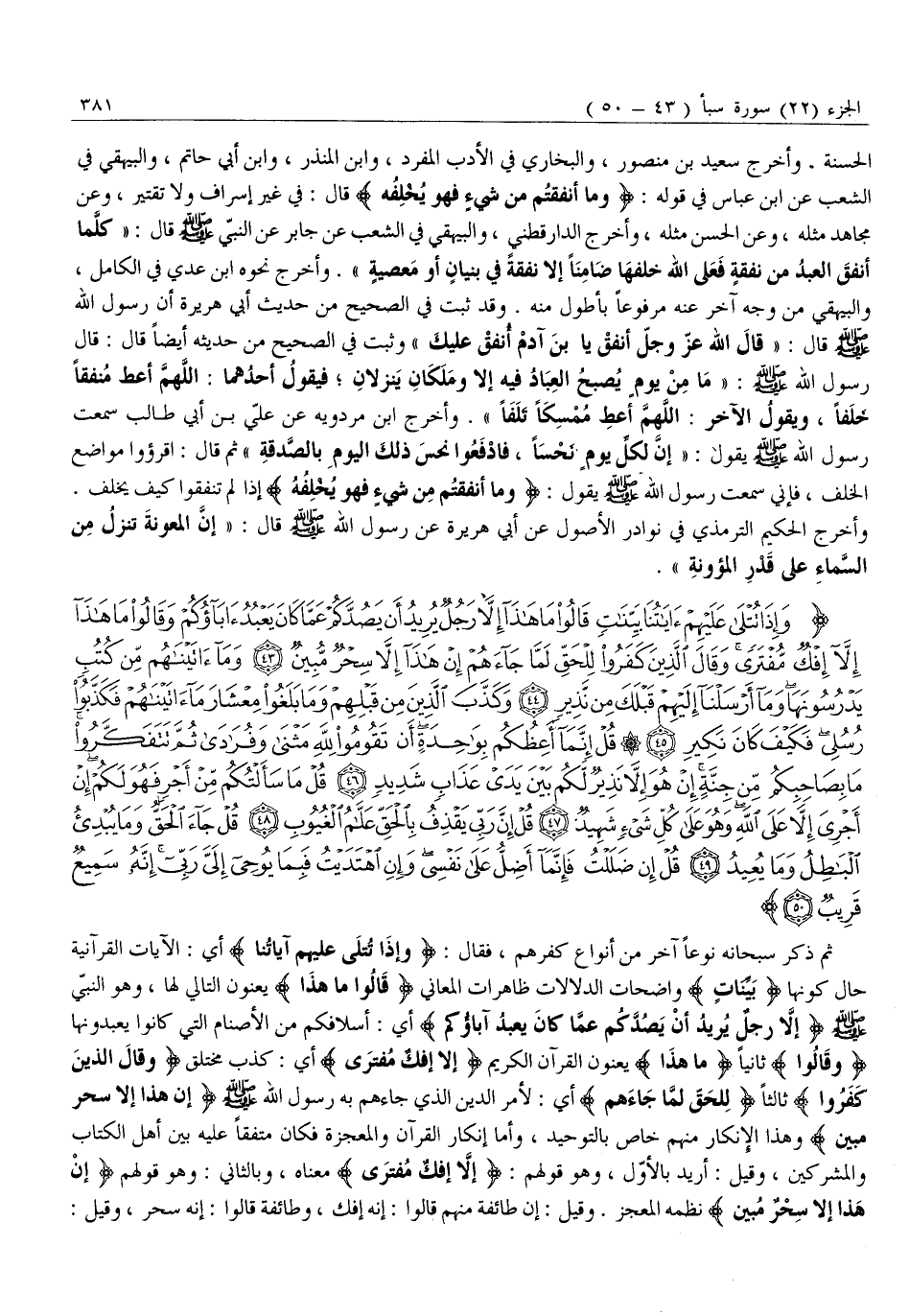 وَإِذا تُتْلى عَلَيْهِمْ آياتُنا بَيِّناتٍ قالُوا مَا هَذَا إِلاَّ رَجُلٌ يُرِيدُ أَنْ يَصُدَّكُمْ عَمَّا كانَ يَعْبُدُ آباؤُكُمْ وَقالُوا مَا هَذَا إِلاَّ إِفْكٌ مُفْتَرىً وَقالَ الَّذِينَ كَفَرُوا لِلْحَقِّ لَمَّا جاءَهُمْ إِنْ هَذَا إِلاَّ سِحْرٌ مُبِينٌ (43) وَما آتَيْناهُمْ مِنْ كُتُبٍ يَدْرُسُونَها وَما أَرْسَلْنا إِلَيْهِمْ قَبْلَكَ مِنْ نَذِيرٍ (44) وَكَذَّبَ الَّذِينَ مِنْ قَبْلِهِمْ وَما بَلَغُوا مِعْشارَ مَا آتَيْناهُمْ فَكَذَّبُوا رُسُلِي فَكَيْفَ كانَ نَكِيرِ (45) قُلْ إِنَّما أَعِظُكُمْ بِواحِدَةٍ أَنْ تَقُومُوا لِلَّهِ مَثْنى وَفُرادى ثُمَّ تَتَفَكَّرُوا مَا بِصاحِبِكُمْ مِنْ جِنَّةٍ إِنْ هُوَ إِلاَّ نَذِيرٌ لَكُمْ بَيْنَ يَدَيْ عَذابٍ شَدِيدٍ (46) قُلْ مَا سَأَلْتُكُمْ مِنْ أَجْرٍ فَهُوَ لَكُمْ إِنْ أَجْرِيَ إِلاَّ عَلَى اللَّهِ وَهُوَ عَلى كُلِّ شَيْءٍ شَهِيدٌ (47)