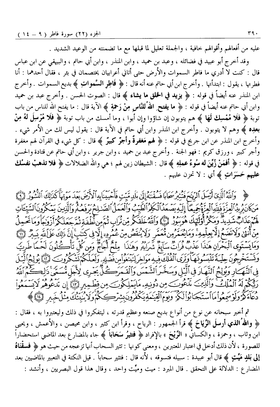 وَاللَّهُ الَّذِي أَرْسَلَ الرِّياحَ قَرَأَ الْجُمْهُورُ: الرِّيَاحَ، وَقَرَأَ ابْنُ كثير، وابن محيصن، والأعمش، ويحيى ابن وَثَّابٍ، وَحَمْزَةُ، وَالْكِسَائِيُّ «الرِّيحَ» بِالْإِفْرَادِ فَتُثِيرُ سَحاباً جَاءَ بِالْمُضَارِعِ بَعْدَ الْمَاضِي اسْتِحْضَارًا لِلصُّورَةِ، لِأَنَّ ذَلِكَ أَدْخَلُ فِي اعْتِبَارِ الْمُعْتَبِرِينَ، وَمَعْنَى كَوْنِهَا: تُثِيرُ السَّحَابَ أَنَّهَا تُزْعِجُهُ مِنْ حَيْثُ هُوَ فَسُقْناهُ إِلى بَلَدٍ مَيِّتٍ قَالَ أَبُو عُبَيْدَةَ: سبيله فنسوقه، لِأَنَّهُ قَالَ: فَتُثِيرُ سَحَابًا. قِيلَ النُّكْتَةُ فِي التَّعْبِيرِ بِالْمَاضِيَيْنِ بَعْدَ الْمُضَارِعِ: الدَّلَالَةُ عَلَى التَّحَقُّقِ. قَالَ الْمُبَرِّدُ: مَيْتٌ وَمَيِّتٌ وَاحِدٌ، وَقَالَ هَذَا قَوْلُ الْبَصْرِيِّينَ، وَأَنْشَدَ: