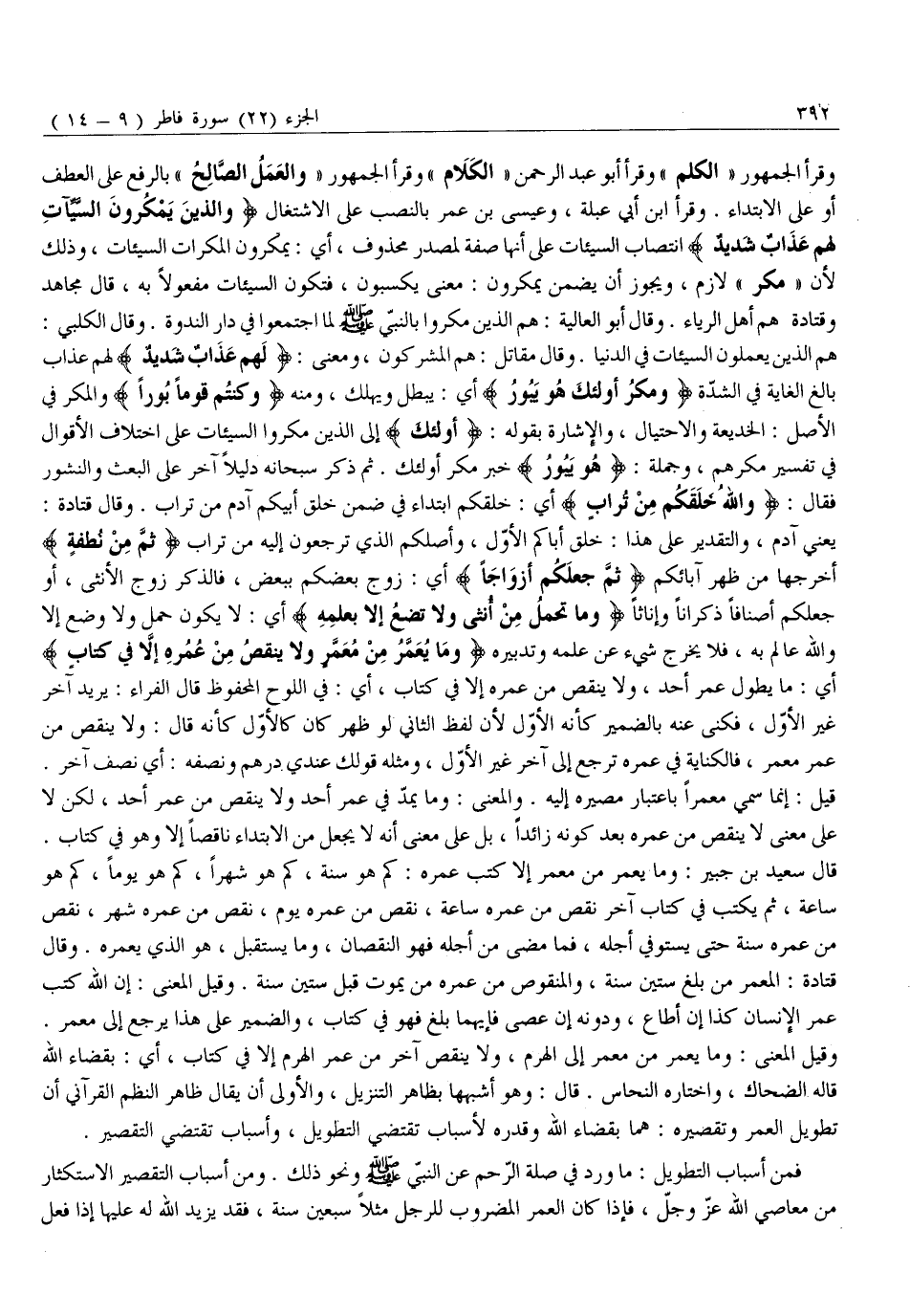 وَقَرَأَ الْجُمْهُورُ «الْكَلِمُ» وَقَرَأَ أَبُو عَبْدِ الرَّحْمَنِ «الْكَلَامُ» وَقَرَأَ الْجُمْهُورُ «وَالْعَمَلُ الصَّالِحُ» بِالرَّفْعِ عَلَى الْعَطْفِ أَوْ عَلَى الِابْتِدَاءِ. وَقَرَأَ ابْنُ أَبِي عَبْلَةَ، وَعِيسَى بْنُ عُمَرَ بِالنَّصْبِ عَلَى الِاشْتِغَالِ وَالَّذِينَ يَمْكُرُونَ السَّيِّئاتِ لَهُمْ عَذابٌ شَدِيدٌ انْتِصَابُ السَّيِّئَاتِ عَلَى أَنَّهَا صِفَةٌ لِمَصْدَرٍ مَحْذُوفٍ، أَيْ: يَمْكُرُونَ الْمَكْرَاتِ السَّيِّئَاتِ، وَذَلِكَ لِأَنَّ «مَكَرَ» لَازِمٌ، وَيَجُوزُ أَنْ يُضَمَّنَ يَمْكُرُونَ: مَعْنَى يَكْسِبُونَ، فَتَكُونُ السَّيِّئَاتُ مَفْعُولًا بِهِ، قَالَ مُجَاهِدٌ وَقَتَادَةُ هُمْ أَهْلُ الرِّيَاءِ. وَقَالَ أَبُو الْعَالِيَةِ: هُمُ الَّذِينَ مكروا بالنبيّ صلّى الله عليه وَسَلَّمَ لَمَّا اجْتَمَعُوا فِي دَارِ النَّدْوَةِ. وَقَالَ الْكَلْبِيُّ: