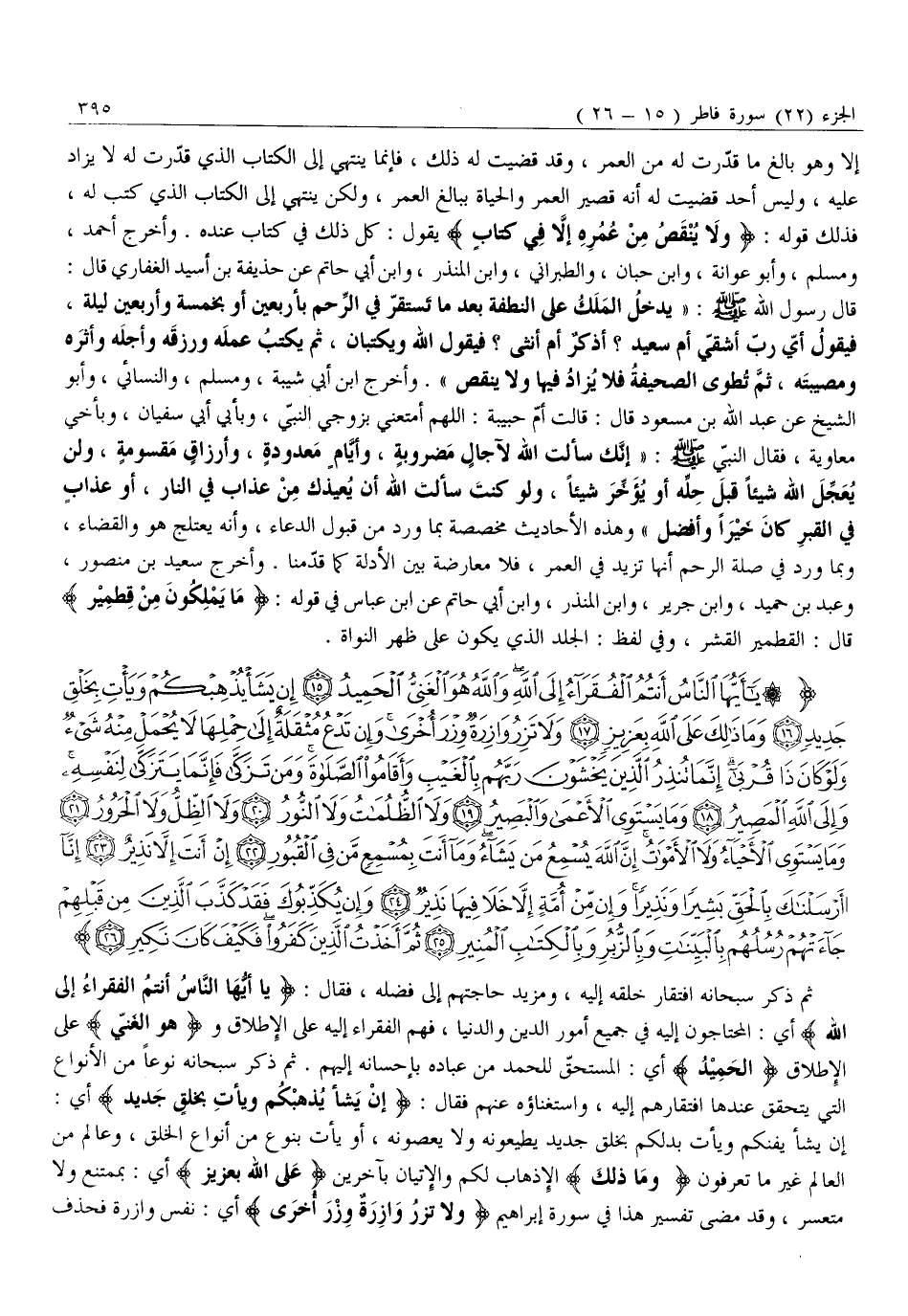 قَالَ رَسُولُ اللَّهِ صَلَّى اللَّهُ عَلَيْهِ وسلّم: «يدخل الملك على النطفة بعد ما تَسْتَقِرُّ فِي الرَّحِمِ بِأَرْبَعِينَ أَوْ بِخَمْسَةٍ وَأَرْبَعِينَ لَيْلَةً، فَيَقُولُ أَيْ رَبِّ أَشَقِيٌّ أَمْ سَعِيدٌ؟ أَذَكَرٌ أَمْ أُنْثَى؟ فَيَقُولُ اللَّهُ وَيُكْتَبَانِ، ثُمَّ يَكْتُبُ عَمَلَهُ وَرِزْقَهُ وَأَجَلَهُ وَأَثَرَهُ وَمُصِيبَتَهُ، ثُمَّ تُطْوَى الصَّحِيفَةُ فَلَا يُزَادُ فِيهَا وَلَا يُنْقَصُ» . وَأَخْرَجَ ابْنُ أَبِي شَيْبَةَ، وَمُسْلِمٌ، وَالنَّسَائِيُّ، وَأَبُو الشَّيْخِ عَنْ عَبْدِ اللَّهِ بْنِ مَسْعُودٍ قَالَ: قَالَتْ أُمُّ حَبِيبَةَ: اللَّهُمَّ أَمْتِعْنِي بِزَوْجِي النَّبِيِّ، وَبِأَبِي أَبِي سُفْيَانَ، وَبِأَخِي مُعَاوِيَةَ، فَقَالَ النَّبِيُّ صلّى الله عليه وَسَلَّمَ: «إِنَّكِ سَأَلْتِ اللَّهَ لِآجَالٍ مَضْرُوبَةٍ، وَأَيَّامٍ مَعْدُودَةٍ، وَأَرْزَاقٍ مَقْسُومَةٍ، وَلَنْ يُعَجِّلَ اللَّهُ شَيْئًا قَبْلَ حِلِّهِ أَوْ يُؤَخِّرَ شَيْئًا، وَلَوْ كُنْتِ سَأَلْتِ اللَّهَ أَنْ يُعِيذَكِ مِنْ عَذَابٍ فِي النَّارِ، أَوْ عَذَابٍ فِي الْقَبْرِ كَانَ خَيْرًا وَأَفْضَلَ» وَهَذِهِ الْأَحَادِيثُ مُخَصَّصَةٌ بِمَا وَرَدَ مِنْ قَبُولِ الدُّعَاءِ، وَأَنَّهُ يَعْتَلِجُ هُوَ وَالْقَضَاءُ، وَبِمَا وَرَدَ فِي صِلَةِ الرَّحِمِ أَنَّهَا تَزِيدُ فِي الْعُمُرِ، فَلَا مُعَارَضَةَ بَيْنَ الْأَدِلَّةِ كَمَا قَدَّمْنَا. وَأَخْرَجَ سَعِيدُ بْنُ مَنْصُورٍ، وَعَبْدُ بْنُ حُمَيْدٍ، وَابْنُ جَرِيرٍ، وَابْنُ الْمُنْذِرِ، وَابْنُ أَبِي حَاتِمٍ عَنِ ابْنِ عَبَّاسٍ فِي قَوْلِهِ: مَا يَمْلِكُونَ مِنْ قِطْمِيرٍ قَالَ: الْقِطْمِيرُ الْقِشْرُ، وَفِي لَفْظٍ: الجلد الذي يكون على ظهر النواة.