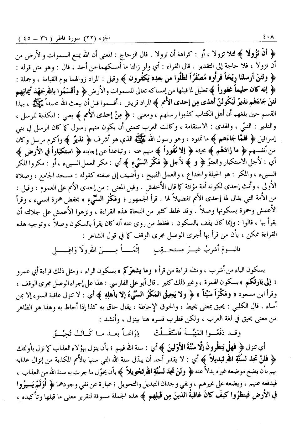 مِنَ الْأُمَّةِ الَّتِي يُقَالُ لَهَا إِحْدَى الْأُمَمِ تَفْضِيلًا لَهَا. قَرَأَ الْجُمْهُورُ «وَمَكْرَ السَّيِّئِ» بِخَفْضِ هَمْزَةِ السيء، وَقَرَأَ الْأَعْمَشُ وَحَمْزَةُ بِسُكُونِهَا وَصْلًا. وَقَدْ غَلَّطَ كَثِيرٌ مِنَ النُّحَاةِ هَذِهِ الْقِرَاءَةَ، وَنَزَّهُوا الْأَعْمَشَ عَلَى جَلَالَتِهِ أَنْ يَقْرَأَ بِهَا، قَالُوا: وَإِنَّمَا كَانَ يَقِفُ بِالسُّكُونِ، فَغَلِطَ مَنْ رَوَى عَنْهُ أَنَّهُ كَانَ يَقْرَأُ بِالسُّكُونِ وَصْلًا، وَتَوْجِيهُ هَذِهِ الْقِرَاءَةِ مُمْكِنٌ، بِأَنَّ مَنْ قَرَأَ بِهَا أَجْرَى الْوَصْلَ مَجْرَى الْوَقْفِ كَمَا فِي قَوْلِ الشَّاعِرِ: