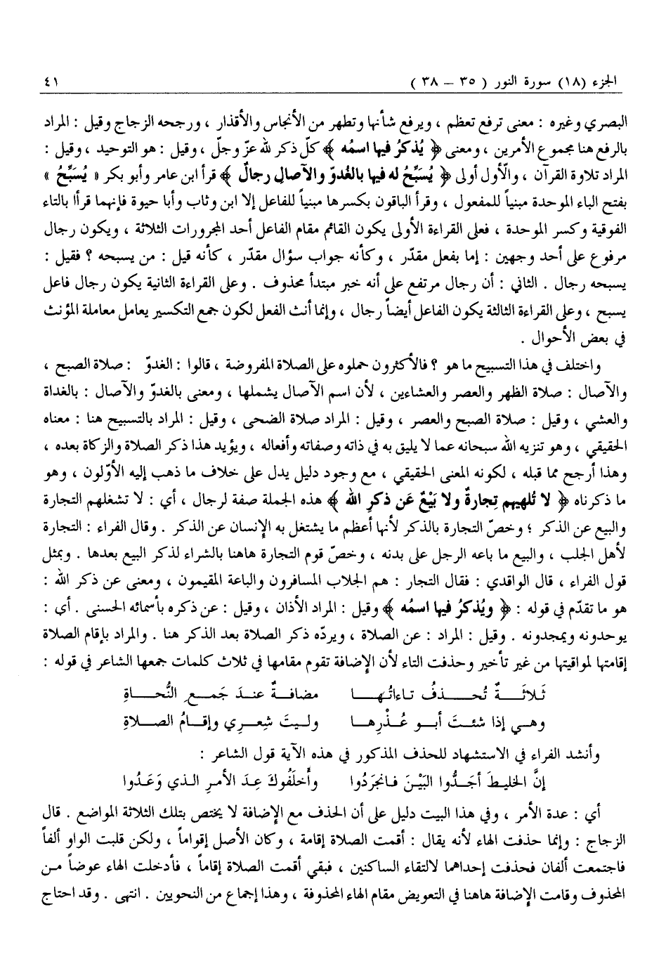 وَاخْتُلِفَ فِي هَذَا التَّسْبِيحِ مَا هُوَ؟ فَالْأَكْثَرُونَ حَمَلُوهُ عَلَى الصَّلَاةِ الْمَفْرُوضَةِ، قَالُوا: الْغُدُوُّ: صَلَاةُ الصُّبْحِ، وَالْآصَالُ: صَلَاةُ الظُّهْرِ وَالْعَصْرِ وَالْعِشَاءَيْنِ، لِأَنَّ اسْمَ الْآصَالِ يَشْمَلُهَا، وَمَعْنَى بِالْغُدُوِّ وَالْآصَالِ: بِالْغَدَاةِ وَالْعَشِيِّ، وَقِيلَ: صَلَاةُ الصُّبْحِ وَالْعَصْرِ، وَقِيلَ: الْمُرَادُ صَلَاةُ الضُّحَى، وَقِيلَ: الْمُرَادُ بِالتَّسْبِيحِ هُنَا: مَعْنَاهُ الْحَقِيقِيُّ، وَهُوَ تَنْزِيهُ اللَّهِ سُبْحَانَهُ عَمَّا لَا يَلِيقُ بِهِ فِي ذَاتِهِ وَصِفَاتِهِ وَأَفْعَالِهِ، وَيُؤَيِّدُ هَذَا ذِكْرُ الصَّلَاةِ وَالزَّكَاةِ بَعْدَهُ، وَهَذَا أَرْجَحُ مِمَّا قَبْلَهُ، لكونه المعنى الحقيقي، مع وجود دليل يدل عَلَى خِلَافِ مَا ذَهَبَ إِلَيْهِ الْأَوَّلُونَ، وَهُوَ مَا ذَكَرْنَاهُ لَا تُلْهِيهِمْ تِجارَةٌ وَلا بَيْعٌ عَنْ ذِكْرِ اللَّهِ هَذِهِ الْجُمْلَةُ صِفَةٌ لِرِجَالٍ، أَيْ: لَا تَشْغَلُهُمُ التِّجَارَةُ وَالْبَيْعُ عَنِ الذِّكْرِ وَخَصَّ التِّجَارَةَ بِالذِّكْرِ لِأَنَّهَا أَعْظَمَ مَا يَشْتَغِلُ بِهِ الْإِنْسَانُ عَنِ الذِّكْرِ. وَقَالَ الْفَرَّاءُ: التِّجَارَةُ لِأَهْلِ الْجَلَبِ، وَالْبَيْعُ مَا بَاعَهُ الرَّجُلُ عَلَى بَدَنِهِ، وَخَصَّ قَوْمٌ التِّجَارَةَ هَاهُنَا بِالشِّرَاءِ لِذِكْرِ الْبَيْعِ بَعْدَهَا. وَبِمِثْلِ قَوْلِ الْفَرَّاءِ، قَالَ الْوَاقِدِيُّ: فقال التجار: هم الجلاب المسافرون والباعة الْمُقِيمُونَ، وَمَعْنَى عَنْ ذِكْرِ اللَّهِ: