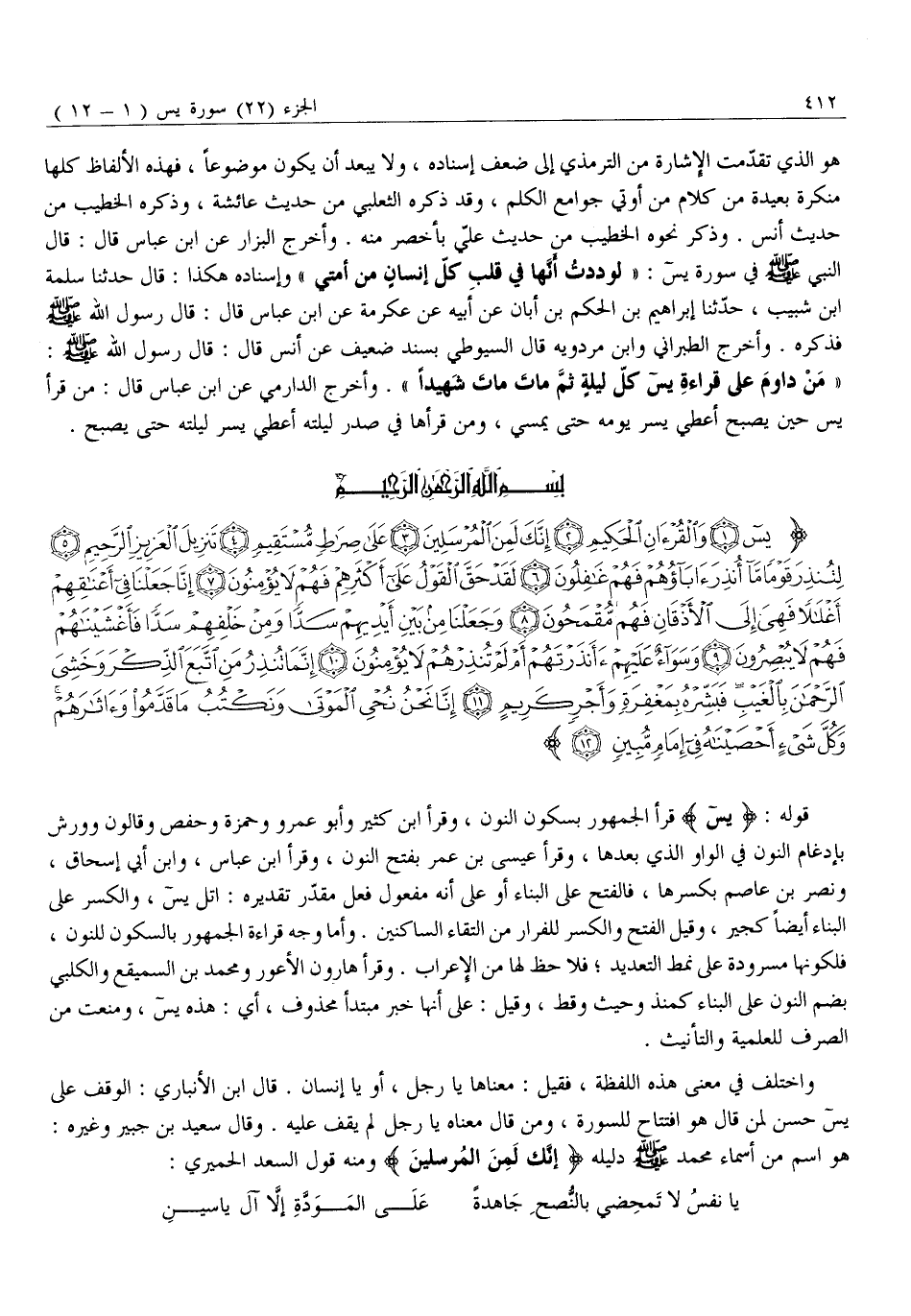 هُوَ الَّذِي تَقَدَّمَتَ الْإِشَارَةُ مِنَ التِّرْمِذِيِّ إِلَى ضَعْفِ إِسْنَادِهِ، وَلَا يَبْعُدُ أَنْ يَكُونَ مَوْضُوعًا، فهذه الألفاظ كلها منكرة بعيدة من كَلَامِ مَنْ أُوتِيَ جَوَامِعَ الْكَلِمِ، وَقَدْ ذَكَرَهُ الثَّعْلَبِيُّ مِنْ حَدِيثِ عَائِشَةَ، وَذَكَرَهُ الْخَطِيبُ مِنْ حَدِيثِ أَنَسٍ. وَذَكَرَ نَحْوَهُ الْخَطِيبُ مِنْ حَدِيثِ عَلِيٍّ بِأَخْصَرَ مِنْهُ. وَأَخْرَجَ الْبَزَّارُ عَنِ ابْنِ عَبَّاسٍ قَالَ: قَالَ النَّبِيُّ صَلَّى اللَّهُ عَلَيْهِ وَسَلَّمَ فِي سُورَةِ يس: «لَوَدِدْتُ أَنَّهَا فِي قَلْبِ كُلِّ إِنْسَانٍ مِنْ أُمَّتِي» وَإِسْنَادُهُ هَكَذَا: قال حدثنا سلمة ابن شَبِيبٍ، حَدَّثَنَا إِبْرَاهِيمُ بْنُ الْحَكَمِ بْنِ أَبَانٍ عَنْ أَبِيهِ عَنْ عِكْرِمَةَ عَنِ ابْنِ عَبَّاسٍ قَالَ: قَالَ رَسُولُ اللَّهِ صَلَّى اللَّهُ عَلَيْهِ وَسَلَّمَ فَذَكَرَهُ. وَأَخْرَجَ الطَّبَرَانِيُّ وَابْنُ مَرْدَوَيْهِ قَالَ السُّيُوطِيُّ بِسَنَدٍ ضَعِيفٍ عَنْ أَنَسٍ قَالَ: قَالَ رَسُولُ اللَّهِ صَلَّى اللَّهُ عليه وسلم: