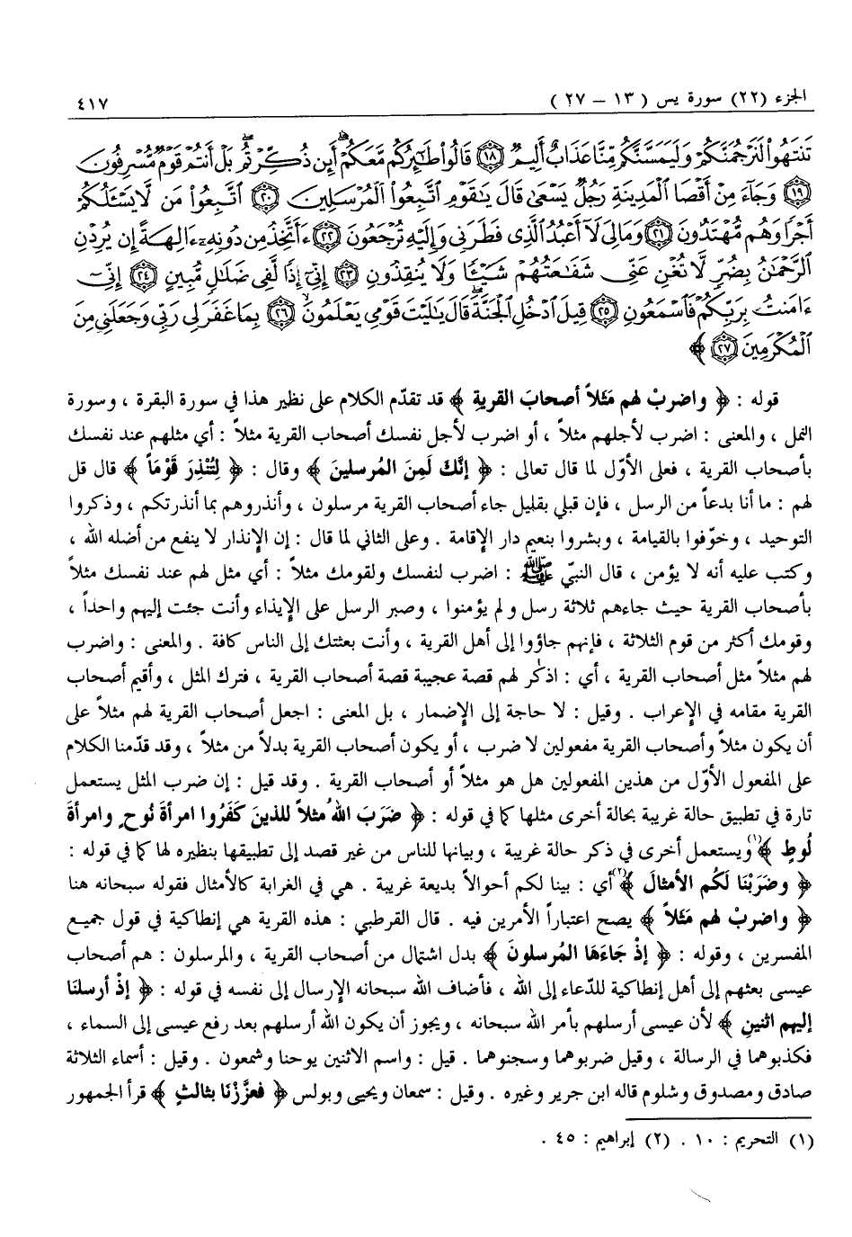 قَوْلُهُ: وَاضْرِبْ لَهُمْ مَثَلًا أَصْحابَ الْقَرْيَةِ قَدْ تَقَدَّمَ الْكَلَامُ عَلَى نَظِيرِ هَذَا فِي سُورَةِ الْبَقَرَةِ، وَسُورَةِ النَّمْلِ، وَالْمَعْنَى: اضْرِبْ لِأَجْلِهِمْ مَثَلًا، أَوِ اضْرِبْ لِأَجْلِ نَفْسِكَ أَصْحَابَ الْقَرْيَةِ مَثَلًا: أَيْ مَثِّلْهُمْ عِنْدَ نَفْسِكَ بِأَصْحَابِ الْقَرْيَةِ، فَعَلَى الْأَوَّلِ لَمَّا قَالَ تَعَالَى: إِنَّكَ لَمِنَ الْمُرْسَلِينَ وقال: لِتُنْذِرَ قَوْماً قَالَ قُلْ لَهُمْ: مَا أَنَا بِدْعًا مِنَ الرُّسُلِ، فَإِنَّ قَبْلِي بِقَلِيلٍ جَاءَ أَصْحَابَ الْقَرْيَةِ مُرْسَلُونَ، وَأَنْذَرُوهُمْ بِمَا أَنْذَرْتُكُمْ، وَذَكَرُوا التَّوْحِيدَ، وَخَوَّفُوا بِالْقِيَامَةِ، وَبَشَّرُوا بِنَعِيمِ دَارِ الْإِقَامَةِ. وَعَلَى الثَّانِي لَمَّا قَالَ: إِنَّ الْإِنْذَارَ لَا يَنْفَعُ مَنْ أَضَلَّهُ اللَّهُ، وَكَتَبَ عَلَيْهِ أَنَّهُ لَا يُؤْمِنُ، قال النبيّ صلّى الله عليه وَسَلَّمَ: اضْرِبْ لِنَفْسِكَ وَلِقَوْمِكَ مَثَلًا: أَيْ مَثِّلْ لَهُمْ عِنْدَ نَفْسِكَ مَثَلًا بِأَصْحَابِ الْقَرْيَةِ حَيْثُ جَاءَهُمْ ثَلَاثَةُ رُسُلٍ وَلَمْ يُؤْمِنُوا، وَصَبَرَ الرُّسُلُ عَلَى الْإِيذَاءِ وَأَنْتَ جِئْتَ إِلَيْهِمْ وَاحِدًا، وَقَوْمُكَ أَكْثَرُ مِنْ قَوْمِ الثَّلَاثَةِ، فَإِنَّهُمْ جَاءُوا إِلَى أَهْلِ الْقَرْيَةِ، وَأَنْتَ بَعَثْتُكَ إِلَى النَّاسِ كَافَّةً. وَالْمَعْنَى: وَاضْرِبْ لَهُمْ مَثَلًا مَثَلَ أَصْحَابِ الْقَرْيَةِ، أَيِ: اذْكُرْ لَهُمْ قِصَّةً عَجِيبَةً قِصَّةَ أَصْحَابِ الْقَرْيَةِ، فَتُرِكَ الْمَثَلُ، وَأُقِيمَ أَصْحَابُ الْقَرْيَةِ مَقَامَهُ فِي الْإِعْرَابِ. وَقِيلَ: لَا حَاجَةَ إِلَى الْإِضْمَارِ، بَلِ الْمَعْنَى: اجْعَلْ أَصْحَابَ الْقَرْيَةِ لَهُمْ مَثَلًا على أن يكون مثلا وأصحاب القرية مفعولين لا ضرب، أَوْ يَكُونَ أَصْحَابَ الْقَرْيَةِ بَدَلًا مِنْ مَثَلًا، وَقَدْ قَدَّمْنَا الْكَلَامَ عَلَى الْمَفْعُولِ الْأَوَّلِ مِنْ هَذَيْنِ الْمَفْعُولَيْنِ هَلْ هُوَ مَثَلًا أَوْ أَصْحَابَ الْقَرْيَةِ. وَقَدْ قِيلَ: إِنَّ ضَرْبَ الْمَثَلِ يُسْتَعْمَلُ تَارَةً فِي تَطْبِيقِ حَالَةٍ غَرِيبَةٍ بِحَالَةٍ أُخْرَى مِثْلِهَا كَمَا فِي قَوْلِهِ: ضَرَبَ اللَّهُ مَثَلًا لِلَّذِينَ كَفَرُوا امْرَأَتَ نُوحٍ وَامْرَأَتَ لُوطٍ «1» وَيُسْتَعْمَلُ أُخْرَى فِي ذِكْرِ حَالَةٍ غَرِيبَةٍ، وَبَيَانِهَا لِلنَّاسِ مِنْ غَيْرِ قَصْدٍ إِلَى تَطْبِيقِهَا بِنَظِيرِهِ لَهَا كَمَا فِي قَوْلِهِ: