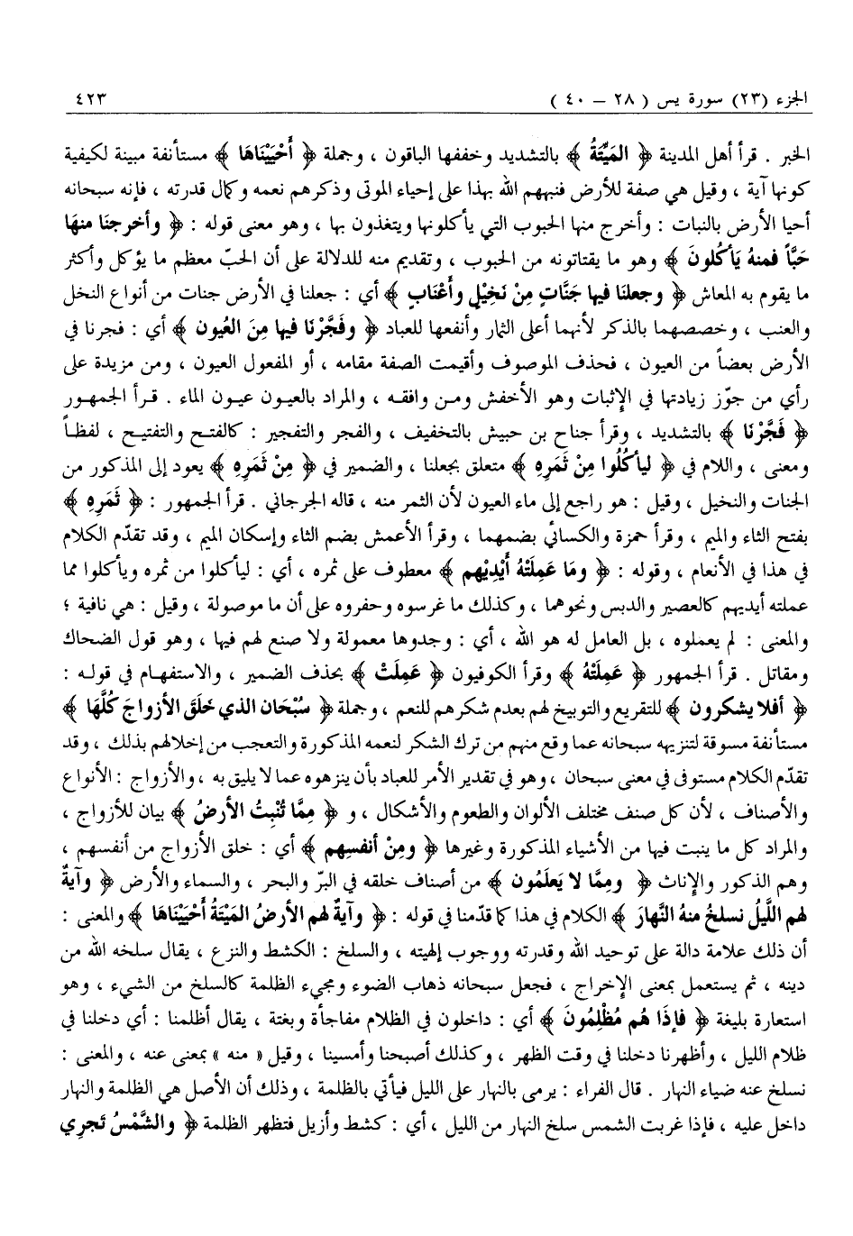 الْخَبَرُ. قَرَأَ أَهْلُ الْمَدِينَةِ «الْمَيِّتَةَ» بِالتَّشْدِيدِ وَخَفَّفَهَا الْبَاقُونَ، وَجُمْلَةُ أَحْيَيْناها مُسْتَأْنَفَةٌ مُبَيِّنَةٌ لِكَيْفِيَّةِ كَوْنِهَا آيَةً، وَقِيلَ هِيَ صِفَةٌ لِلْأَرْضِ فَنَبَّهَهُمُ اللَّهُ بِهَذَا عَلَى إِحْيَاءِ الْمَوْتَى وَذَكَّرَهُمْ نِعَمَهُ وَكَمَالَ قُدْرَتِهِ، فَإِنَّهُ سُبْحَانَهُ أَحْيَا الْأَرْضَ بِالنَّبَاتِ: وَأَخْرَجَ مِنْهَا الْحُبُوبَ الَّتِي يَأْكُلُونَهَا وَيَتَغَذَّوْنَ بِهَا، وَهُوَ مَعْنَى قَوْلِهِ: وَأَخْرَجْنا مِنْها حَبًّا فَمِنْهُ يَأْكُلُونَ وَهُوَ مَا يَقْتَاتُونَهُ مِنَ الْحُبُوبِ، وَتَقْدِيمُ مِنْهُ لِلدَّلَالَةِ عَلَى أَنَّ الْحَبَّ مُعْظَمُ مَا يُؤْكَلُ وَأَكْثَرُ مَا يَقُومُ بِهِ الْمَعَاشُ وَجَعَلْنا فِيها جَنَّاتٍ مِنْ نَخِيلٍ وَأَعْنابٍ أَيْ: جَعَلْنَا فِي الْأَرْضِ جَنَّاتٍ مِنْ أَنْوَاعِ النَّخْلِ وَالْعِنَبِ، وَخَصَّصَهُمَا بِالذِّكْرِ لِأَنَّهُمَا أَعْلَى الثِّمَارِ وَأَنْفَعُهَا لِلْعِبَادِ وَفَجَّرْنا فِيها مِنَ الْعُيُونِ أَيْ: فَجَّرْنَا فِي الْأَرْضِ بَعْضًا مِنَ الْعُيُونِ، فَحُذِفَ الْمَوْصُوفُ وَأُقِيمَتِ الصِّفَةُ مقامه، أو المفعول العيون، ومن مَزِيدَةٌ عَلَى رَأْيِ مَنْ جَوَّزَ زِيَادَتَهَا فِي الْإِثْبَاتِ وَهُوَ الْأَخْفَشُ وَمَنْ وَافَقَهُ، وَالْمُرَادُ بِالْعُيُونِ عُيُونُ الْمَاءِ. قَرَأَ الْجُمْهُورُ فَجَّرْنا بِالتَّشْدِيدِ، وَقَرَأَ جَنَاحُ بْنُ حُبَيْشٍ بِالتَّخْفِيفِ، وَالْفَجْرُ وَالتَّفْجِيرُ: كَالْفَتْحِ وَالتَّفْتِيحِ، لَفْظًا وَمَعْنًى، وَاللَّامُ فِي لِيَأْكُلُوا مِنْ ثَمَرِهِ متعلق بجعلنا، وَالضَّمِيرُ فِي مِنْ ثَمَرِهِ يَعُودُ إِلَى الْمَذْكُورِ مِنَ الْجَنَّاتِ وَالنَّخِيلِ، وَقِيلَ: هُوَ رَاجِعٌ إِلَى مَاءِ الْعُيُونِ لِأَنَّ الثَّمَرَ مِنْهُ، قَالَهُ الْجُرْجَانِيُّ. قَرَأَ الْجُمْهُورُ: ثَمَرِهِ بِفَتْحِ الثَّاءِ وَالْمِيمِ، وَقَرَأَ حَمْزَةُ وَالْكِسَائِيُّ بِضَمِّهِمَا، وَقَرَأَ الْأَعْمَشُ بِضَمِّ الثَّاءِ وَإِسْكَانِ الْمِيمِ، وَقَدْ تَقَدَّمَ الْكَلَامُ فِي هَذَا فِي الْأَنْعَامِ، وَقَوْلُهُ: وَما عَمِلَتْهُ أَيْدِيهِمْ مَعْطُوفٌ عَلَى ثَمَرِهِ، أَيْ: لِيَأْكُلُوا مِنْ ثَمَرِهِ وَيَأْكُلُوا مِمَّا عَمِلَتْهُ أَيْدِيهِمْ كَالْعَصِيرِ وَالدِّبْسِ وَنَحْوِهِمَا، وَكَذَلِكَ مَا غَرَسُوهُ وَحَفَرُوهُ عَلَى أَنَّ مَا مَوْصُولَةٌ، وَقِيلَ: هِيَ نَافِيَةٌ وَالْمَعْنَى: لَمْ يَعْمَلُوهُ، بَلِ الْعَامِلُ لَهُ هُوَ اللَّهُ، أَيْ: وَجَدُوهَا مَعْمُولَةً وَلَا صُنْعَ لَهُمْ فِيهَا، وَهُوَ قَوْلُ الضَّحَّاكِ وَمُقَاتِلٍ. قَرَأَ الْجُمْهُورُ عَمِلَتْهُ وَقَرَأَ الْكُوفِيُّونَ «عَمِلَتْ» بِحَذْفِ الضَّمِيرِ، وَالِاسْتِفْهَامُ فِي قَوْلِهِ:
