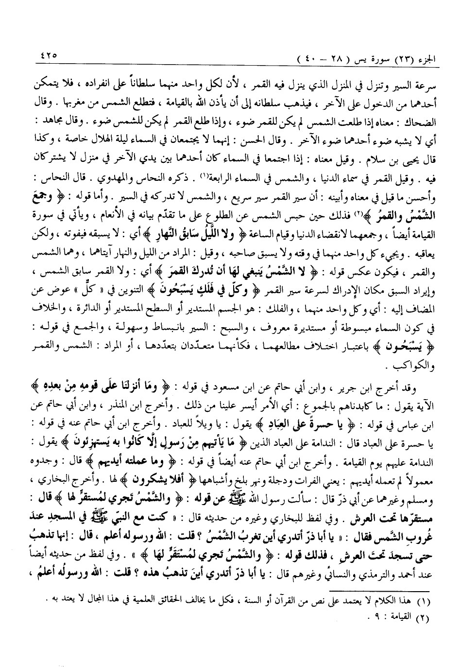 سرعة السير وتنزل في المنزل الذي ينزل فِيهِ الْقَمَرُ، لِأَنَّ لِكُلٍّ وَاحِدٍ مِنْهُمَا سُلْطَانًا عَلَى انْفِرَادِهِ، فَلَا يَتَمَكَّنُ أَحَدُهُمَا مِنَ الدُّخُولِ عَلَى الْآخَرِ، فَيَذْهَبُ سُلْطَانُهُ إِلَى أَنْ يَأْذَنَ اللَّهُ بِالْقِيَامَةِ، فَتَطْلُعُ الشَّمْسُ مِنْ مَغْرِبِهَا. وَقَالَ الضَّحَّاكُ: مَعْنَاهُ إِذَا طَلَعَتِ الشَّمْسُ لَمْ يَكُنْ لِلْقَمَرِ ضَوْءٌ، وَإِذَا طَلَعَ الْقَمَرُ لَمْ يَكُنْ لِلشَّمْسِ ضَوْءٌ. وَقَالَ مُجَاهِدٌ: