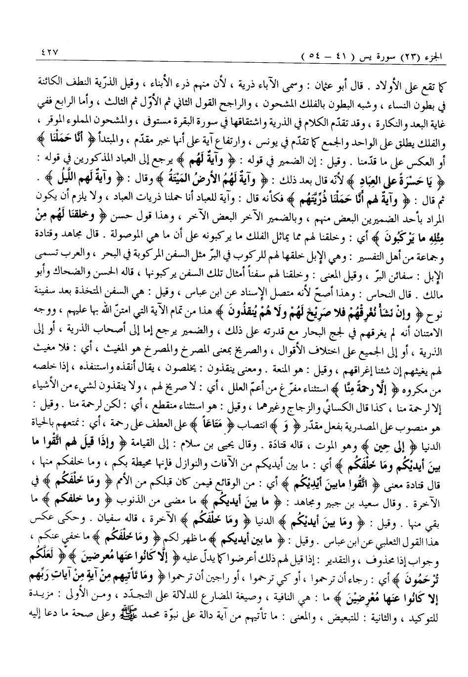 ثُمَّ قَالَ: وَآيَةٌ لَهُمْ أَنَّا حَمَلْنا ذُرِّيَّتَهُمْ فَكَأَنَّهُ قَالَ: وَآيَةٌ لِلْعِبَادِ أَنَّا حَمَلْنَا ذُرِّيَّاتِ الْعِبَادِ، وَلَا يَلْزَمُ أَنْ يَكُونَ الْمُرَادُ بِأَحَدِ الضَّمِيرَيْنِ الْبَعْضَ مِنْهُمْ، وَبِالضَّمِيرِ الْآخَرِ الْبَعْضَ الْآخَرَ، وَهَذَا قَوْلٌ حَسَنٌ وَخَلَقْنا لَهُمْ مِنْ مِثْلِهِ مَا يَرْكَبُونَ أَيْ: وَخَلَقْنَا لَهُمْ مِمَّا يُمَاثِلُ الْفُلْكَ مَا يَرْكَبُونَهُ عَلَى أَنَّ مَا هِيَ الْمَوْصُولَةُ. قَالَ مُجَاهِدٌ وَقَتَادَةُ وَجَمَاعَةٌ مِنْ أَهْلِ التَّفْسِيرِ: وَهِيَ الْإِبِلُ خَلَقَهَا لَهُمْ لِلرُّكُوبِ فِي الْبَرِّ مِثْلَ السُّفُنِ الْمَرْكُوبَةِ فِي الْبَحْرِ، وَالْعَرَبُ تُسَمِّي الْإِبِلَ: سَفَائِنَ الْبَرِّ، وَقِيلَ الْمَعْنَى: وَخَلَقْنَا لَهُمْ سُفُنًا أَمْثَالَ تِلْكَ السُّفُنِ يَرْكَبُونَهَا، قَالَهُ الْحَسَنُ وَالضَّحَّاكُ وَأَبُو مَالِكٍ. قَالَ النَّحَّاسُ: وَهَذَا أَصَحُّ لِأَنَّهُ مُتَّصِلُ الْإِسْنَادِ عَنِ ابْنِ عَبَّاسٍ، وَقِيلَ: هِيَ السُّفُنُ الْمُتَّخَذَةُ بَعْدَ سَفِينَةِ نُوحٍ وَإِنْ نَشَأْ نُغْرِقْهُمْ فَلا صَرِيخَ لَهُمْ وَلا هُمْ يُنْقَذُونَ هَذَا مِنْ تَمَامِ الْآيَةِ الَّتِي امْتَنَّ اللَّهُ بِهَا عَلَيْهِمْ، وَوَجْهُ الِامْتِنَانِ أَنَّهُ لَمْ يُغْرِقْهُمْ فِي لُجَجِ الْبِحَارِ مَعَ قُدْرَتِهِ عَلَى ذَلِكَ، وَالضَّمِيرُ يَرْجِعُ إِمَّا إِلَى أَصْحَابِ الذُّرِّيَّةِ، أَوْ إِلَى الذُّرِّيَّةِ، أَوْ إِلَى الْجَمِيعِ عَلَى اخْتِلَافِ الْأَقْوَالِ، وَالصَّرِيخُ بِمَعْنَى الْمُصْرِخِ وَالْمُصْرِخُ هُوَ الْمُغِيثُ، أَيْ: فَلَا مُغِيثَ لَهُمْ يُغِيثُهُمْ إِنْ شِئْنَا إِغْرَاقَهُمْ، وَقِيلَ: هُوَ الْمَنَعَةُ. وَمَعْنَى ينقذون: يخلصون، يقال أنقذه واستنفذه، إِذَا خَلَّصَهُ مِنْ مَكْرُوهٍ إِلَّا رَحْمَةً مِنَّا اسْتِثْنَاءٌ مُفَرَّغٌ مِنْ أَعَمِّ الْعِلَلِ، أَيْ: لَا صَرِيخَ لَهُمْ، وَلَا يُنْقَذُونَ لِشَيْءٍ مِنَ الْأَشْيَاءِ إِلَّا لِرَحْمَةٍ مِنَّا، كَذَا قَالَ الْكِسَائِيُّ وَالزَّجَّاجُ وَغَيْرُهُمَا، وَقِيلَ: هُوَ اسْتِثْنَاءٌ مُنْقَطِعٌ، أَيْ: لَكِنْ لِرَحْمَةٍ مِنَّا. وَقِيلَ: