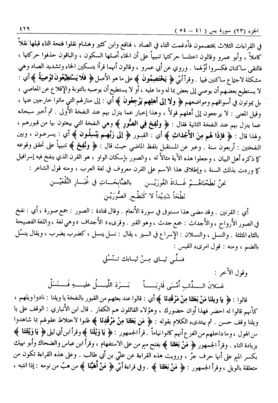 قَالُوا: يَا وَيْلَنا مَنْ بَعَثَنا مِنْ مَرْقَدِنا أَيْ: قَالُوا عِنْدَ بَعْثِهِمْ مِنَ الْقُبُورِ بِالنَّفْخَةِ يَا وَيْلَنَا: نَادَوْا وَيْلَهُمْ، كَأَنَّهُمْ قَالُوا لَهُ احْضُرْ فَهَذَا أَوَانُ حُضُورِكَ، وَهَؤُلَاءِ الْقَائِلُونَ هُمُ الْكُفَّارُ. قَالَ ابْنُ الْأَنْبَارِيِّ: الْوَقْفُ عَلَى يَا وَيْلَنَا وَقْفٌ حَسَنٌ. ثُمَّ يَبْتَدِئُ الْكَلَامُ بِقَوْلِهِ: مَنْ بَعَثَنا مِنْ مَرْقَدِنا ظَنُّوا لِاخْتِلَاطِ عُقُولِهِمْ بِمَا شَاهَدُوا مِنَ الْهَوْلِ، وَمَا دَاخَلَهُمْ مِنَ الْفَزَعِ أَنَّهُمْ كَانُوا نِيَامًا. قَرَأَ الْجُمْهُورُ: يَا وَيْلَنا وَقَرَأَ ابْنُ أَبِي لَيْلَى «يَا وَيْلَتَنَا» بِزِيَادَةِ التَّاءِ. وَقَرَأَ الْجُمْهُورُ مَنْ بَعَثَنا بِفَتْحِ مِيمِ مَنْ عَلَى الِاسْتِفْهَامِ، وَقَرَأَ ابْنُ عَبَّاسٍ وَالضَّحَّاكُ وَأَبُو نَهِيكٍ بِكَسْرِ الْمِيمِ عَلَى أَنَّهَا حَرْفُ جَرٍّ، وَرُوِيَتْ هَذِهِ الْقِرَاءَةُ عَنْ عَلِيِّ بْنِ أَبِي طَالِبٍ. وَعَلَى هَذِهِ الْقِرَاءَةِ تَكُونُ مِنْ مُتَعَلِّقَةً بِالْوَيْلِ، وَقَرَأَ الْجُمْهُورُ: مَنْ بَعَثَنا. وَفِي قِرَاءَةِ أُبَيٍّ «مَنْ أَهَبَّنَا» مِنْ هَبَّ مِنْ نَوْمِهِ: إِذَا انْتَبَهَ،