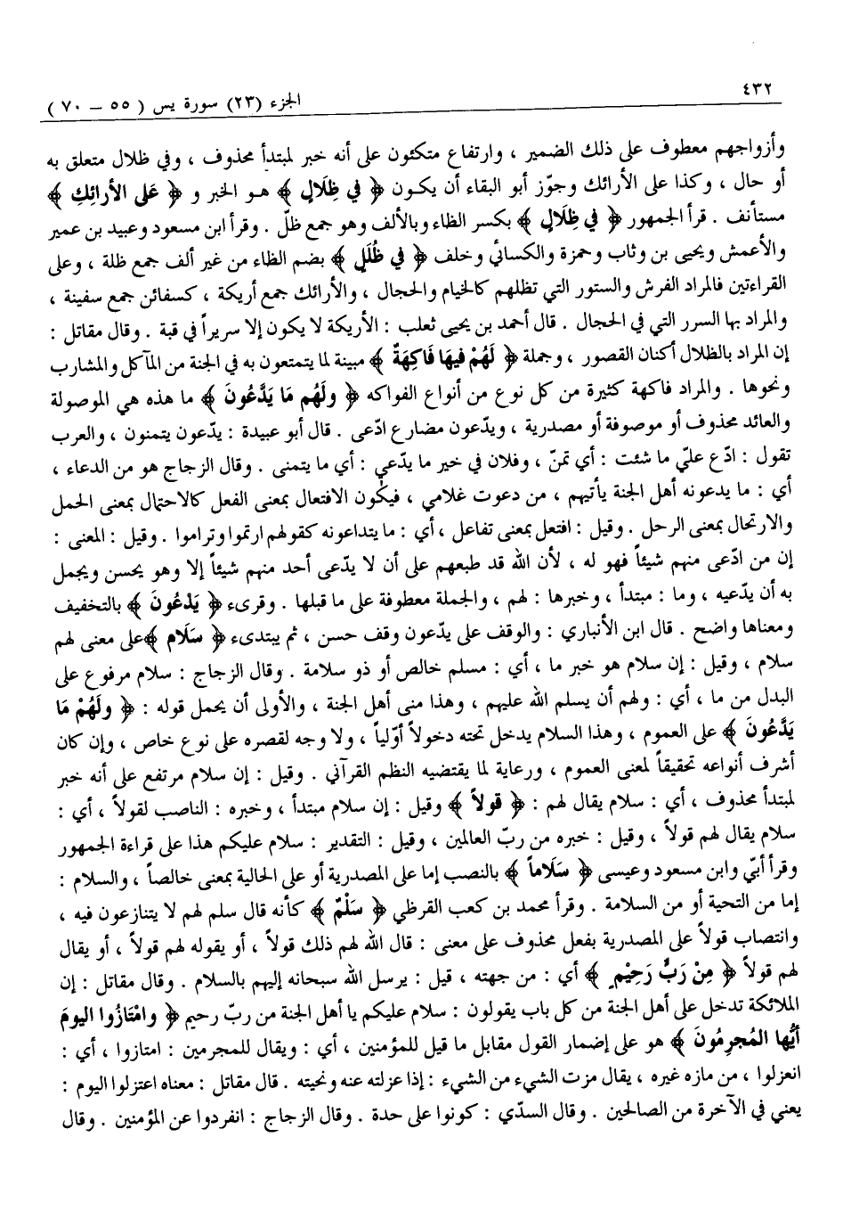 وأزواجهم مَعْطُوفٌ عَلَى ذَلِكَ الضَّمِيرِ، وَارْتِفَاعُ مُتَّكِئُونَ عَلَى أنه خبر لمبتدأ محذوف، وفي ظِلَالٍ مُتَعَلِّقٌ بِهِ أَوْ حَالٌ، وَكَذَا عَلَى الْأَرَائِكِ وَجَوَّزَ أَبُو الْبَقَاءِ أَنْ يَكُونَ فِي ظِلالٍ هو الخبر وعَلَى الْأَرائِكِ مُسْتَأْنَفٌ. قَرَأَ الْجُمْهُورُ فِي ظِلالٍ بِكَسْرِ الظَّاءِ وَبِالْأَلِفِ وَهُوَ جَمْعُ ظِلٍّ. وَقَرَأَ ابْنُ مسعود وعبيد بْنُ عُمَيْرٍ وَالْأَعْمَشُ وَيَحْيَى بْنُ وَثَّابٍ وَحَمْزَةُ وَالْكِسَائِيُّ وَخَلَفٌ فِي ظُلَلٍ بِضَمِّ الظَّاءِ مِنْ غَيْرِ أَلِفٍ جَمْعُ ظُلَّةٍ، وَعَلَى الْقِرَاءَتَيْنِ فَالْمُرَادُ الفرش والستور التي تظلهم كالخيام والحجال، والأرائك جَمْعُ أَرِيكَةٍ، كَسَفَائِنَ جَمْعِ سَفِينَةٍ، وَالْمُرَادُ بِهَا السُّرُرُ الَّتِي فِي الْحِجَالِ. قَالَ أَحْمَدُ بْنُ يَحْيَى ثَعْلَبٌ: الْأَرِيكَةُ لَا يَكُونُ إِلَّا سَرِيرًا فِي قُبَّةٍ. وَقَالَ مُقَاتِلٌ: