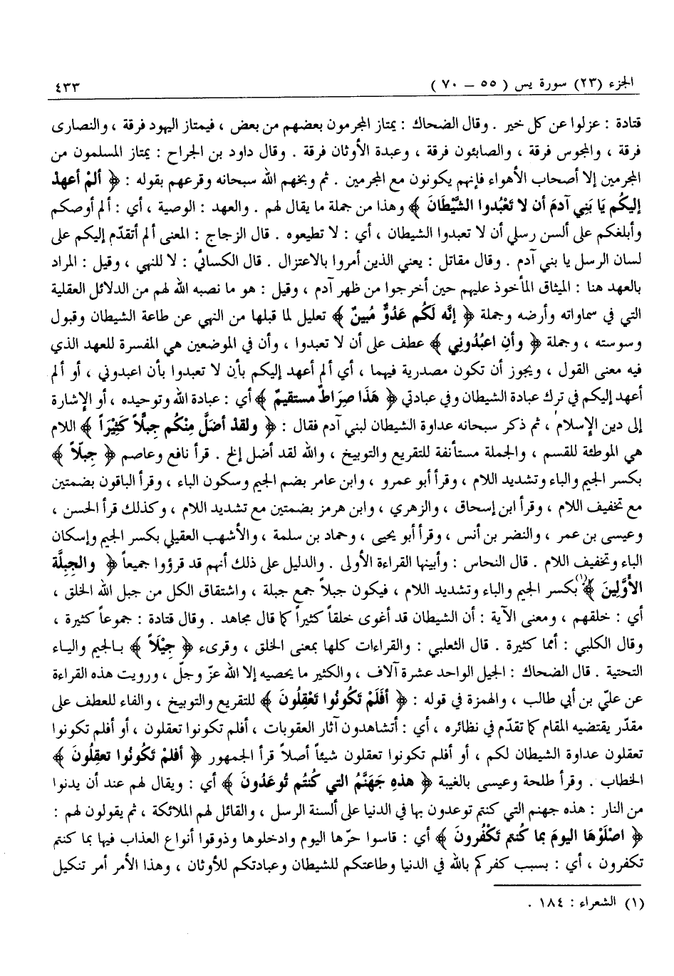 قَتَادَةُ: عُزِلُوا عَنْ كُلِّ خَيْرٍ. وَقَالَ الضَّحَّاكُ: يَمْتَازُ الْمُجْرِمُونَ بَعْضُهُمْ مِنْ بَعْضٍ، فَيَمْتَازُ الْيَهُودُ فِرْقَةً، وَالنَّصَارَى فِرْقَةً، وَالْمَجُوسُ فِرْقَةً، وَالصَّابِئُونَ فِرْقَةً، وَعَبَدَةُ الْأَوْثَانِ فِرْقَةً. وَقَالَ دَاوُدُ بْنُ الْجَرَّاحِ: يَمْتَازُ الْمُسْلِمُونَ مِنَ الْمُجْرِمِينَ إِلَّا أَصْحَابَ الْأَهْوَاءِ فَإِنَّهُمْ يَكُونُونَ مَعَ الْمُجْرِمِينَ. ثُمَّ وَبَّخَهُمُ اللَّهُ سبحانه وقرعهم بقوله: أَلَمْ أَعْهَدْ إِلَيْكُمْ يَا بَنِي آدَمَ أَنْ لَا تَعْبُدُوا الشَّيْطانَ وَهَذَا مِنْ جُمْلَةِ مَا يُقَالُ لَهُمْ. وَالْعَهْدُ: الْوَصِيَّةُ، أَيْ: أَلَمْ أُوصِكُمْ وَأُبْلِغْكُمْ عَلَى أَلْسُنِ رُسُلِي أَنْ لَا تَعْبُدُوا الشَّيْطَانَ، أَيْ: لَا تُطِيعُوهُ. قَالَ الزَّجَّاجُ: الْمَعْنَى أَلَمْ أَتَقَدَّمْ إِلَيْكُمْ عَلَى لِسَانِ الرُّسُلِ يَا بَنِي آدَمَ. وَقَالَ مُقَاتِلٌ: يَعْنِي الَّذِينَ أُمِرُوا بِالِاعْتِزَالِ. قَالَ الْكِسَائِيُّ: لَا لِلنَّهْيِ، وَقِيلَ: الْمُرَادُ بِالْعَهْدِ هُنَا: الْمِيثَاقُ الْمَأْخُوذُ عَلَيْهِمْ حِينَ أُخْرِجُوا مِنْ ظَهْرِ آدَمَ، وَقِيلَ: هُوَ مَا نَصَبَهُ اللَّهُ لَهُمْ مِنَ الدَّلَائِلِ الْعَقْلِيَّةِ الَّتِي فِي سَمَاوَاتِهِ وَأَرْضِهِ وَجُمْلَةُ إِنَّهُ لَكُمْ عَدُوٌّ مُبِينٌ تَعْلِيلٌ لِمَا قَبْلَهَا مِنَ النَّهْيِ عَنْ طَاعَةِ الشَّيْطَانِ وَقَبُولِ وَسْوَسَتِهِ، وَجُمْلَةُ وَأَنِ اعْبُدُونِي عَطْفٌ على أن لا تعبدوا، وأن فِي الْمَوْضِعَيْنِ هِيَ الْمُفَسِّرَةُ لِلْعَهْدِ الَّذِي فِيهِ مَعْنَى الْقَوْلِ، وَيَجُوزُ أَنْ تَكُونَ مَصْدَرِيَّةً فِيهِمَا، أي ألم أَعْهَدْ إِلَيْكُمْ بِأَنْ لَا تَعْبُدُوا بِأَنِ اعْبُدُونِي، أَوْ أَلَمْ أَعْهَدْ إِلَيْكُمْ فِي تَرْكِ عِبَادَةِ الشَّيْطَانِ وَفِي عِبَادَتِي هَذَا صِراطٌ مُسْتَقِيمٌ أَيْ: عِبَادَةُ اللَّهِ وَتَوْحِيدُهُ، أَوِ الْإِشَارَةُ إِلَى دِينِ الْإِسْلَامِ، ثُمَّ ذَكَرَ سُبْحَانَهُ عَدَاوَةَ الشَّيْطَانِ لِبَنِي آدَمَ فَقَالَ: وَلَقَدْ أَضَلَّ مِنْكُمْ جِبِلًّا كَثِيراً اللَّامُ هِيَ الْمُوَطِّئَةُ لِلْقَسَمِ، وَالْجُمْلَةُ مُسْتَأْنَفَةٌ لِلتَّقْرِيعِ والتوبيخ، وَاللَّهِ لَقَدْ أَضَلَّ إِلَخْ. قَرَأَ نَافِعٌ وَعَاصِمٌ جِبِلًّا بِكَسْرِ الْجِيمِ وَالْبَاءِ وَتَشْدِيدِ اللَّامِ، وَقَرَأَ أَبُو عمرو، وابن عامر بضم الجيم وسكون الباء، وقرأ الباقون بضمتين مع تخفيف اللام، وقرأ ابن إِسْحَاقَ، وَالزُّهْرِيُّ، وَابْنُ هُرْمُزَ بِضَمَّتَيْنِ مَعَ تَشْدِيدِ اللَّامِ، وَكَذَلِكَ قَرَأَ الْحَسَنُ، وَعِيسَى بْنُ عُمَرَ، وَالنَّضْرُ بْنُ أَنَسٍ، وَقَرَأَ أَبُو يَحْيَى، وَحَمَّادُ بْنُ سَلَمَةَ، وَالْأَشْهَبُ الْعُقَيْلِيُّ بِكَسْرِ الْجِيمِ وَإِسْكَانِ الْبَاءِ وَتَخْفِيفِ اللَّامِ. قَالَ النَّحَّاسُ: وَأَبْيَنُهَا الْقِرَاءَةُ الْأُولَى. وَالدَّلِيلُ عَلَى ذَلِكَ أَنَّهُمْ قَدْ قَرَءُوا جَمِيعًا وَالْجِبِلَّةَ الْأَوَّلِينَ «1» بِكَسْرِ الْجِيمِ وَالْبَاءِ وَتَشْدِيدِ اللَّامِ، فَيَكُونُ جِبِلًّا جَمْعَ جِبِلَّةٍ، وَاشْتِقَاقُ الْكُلِّ مِنْ جَبَلَ اللَّهُ الْخَلْقَ، أَيْ: خَلَقَهُمْ، وَمَعْنَى الْآيَةِ: أَنَّ الشَّيْطَانَ قَدْ أَغْوَى خَلْقًا كَثِيرًا كَمَا قَالَ مُجَاهِدٌ. وَقَالَ قَتَادَةُ: جُمُوعًا كَثِيرَةً، وَقَالَ الْكَلْبِيُّ: أُمَمًا كَثِيرَةً. قَالَ الثَّعْلَبِيُّ: وَالْقِرَاءَاتُ كُلُّهَا بِمَعْنَى الْخَلْقِ، وَقُرِئَ «جِيلًا» بِالْجِيمِ وَالْيَاءِ التَّحْتِيَّةِ. قَالَ الضَّحَّاكُ: الْجِيلُ الْوَاحِدُ عَشْرَةُ آلَافٍ، والكثير ما يُحْصِيهِ إِلَّا اللَّهُ عَزَّ وَجَلَّ، وَرُوِيَتْ هَذِهِ الْقِرَاءَةُ عَنْ عَلِيِّ