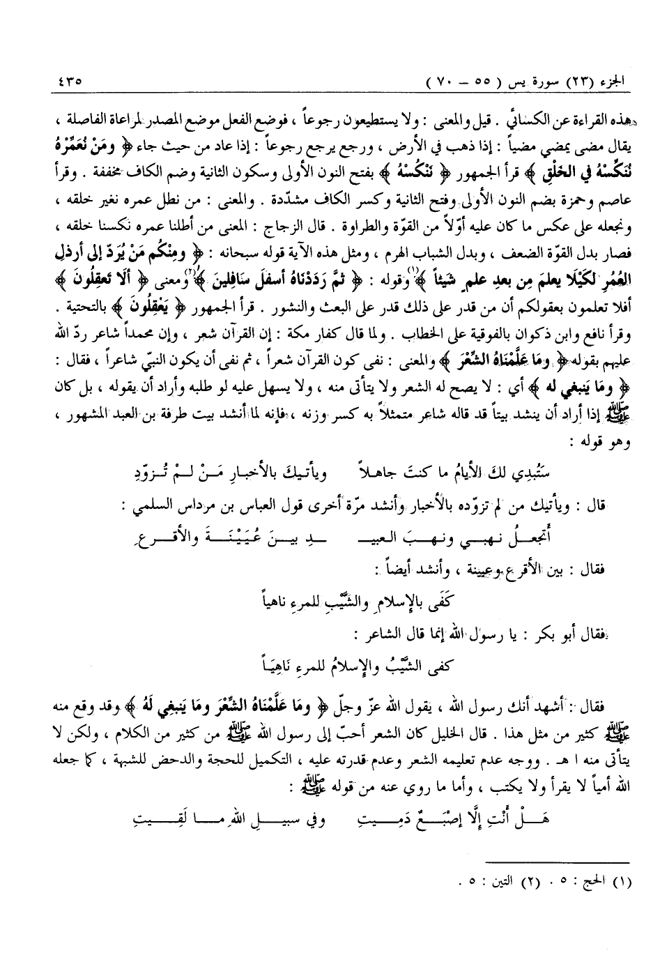 كَفَى الشَّيْبُ وَالْإِسْلَامُ لِلْمَرْءِ نَاهِيًا فَقَالَ: أَشْهَدُ أَنَّكَ رَسُولُ اللَّهِ، يَقُولُ اللَّهُ عَزَّ وَجَلَّ وَما عَلَّمْناهُ الشِّعْرَ وَما يَنْبَغِي لَهُ وَقَدْ وَقَعَ مِنْهُ صَلَّى اللَّهُ عَلَيْهِ وَسَلَّمَ كَثِيرٌ مِنْ مِثْلِ هَذَا. قَالَ الْخَلِيلُ كان الشعر أَحَبَّ إِلَى رَسُولِ اللَّهِ صَلَّى اللَّهُ عَلَيْهِ وَسَلَّمَ مِنْ كَثِيرٍ مِنَ الْكَلَامِ، وَلَكِنْ لَا يَتَأَتَّى مِنْهُ اه. وَوَجْهُ عَدَمِ تَعْلِيمِهِ الشِّعْرَ وَعَدَمِ قُدْرَتِهِ عَلَيْهِ، التَّكْمِيلُ لِلْحُجَّةِ وَالدَّحْضُ لِلشُّبْهَةِ، كَمَا جَعَلَهُ اللَّهُ أُمِّيًّا لَا يَقْرَأُ وَلَا يَكْتُبُ، وَأَمَّا مَا رُوِيَ عَنْهُ مِنْ قَوْلِهِ صَلَّى الله عليه وَسَلَّمَ:
