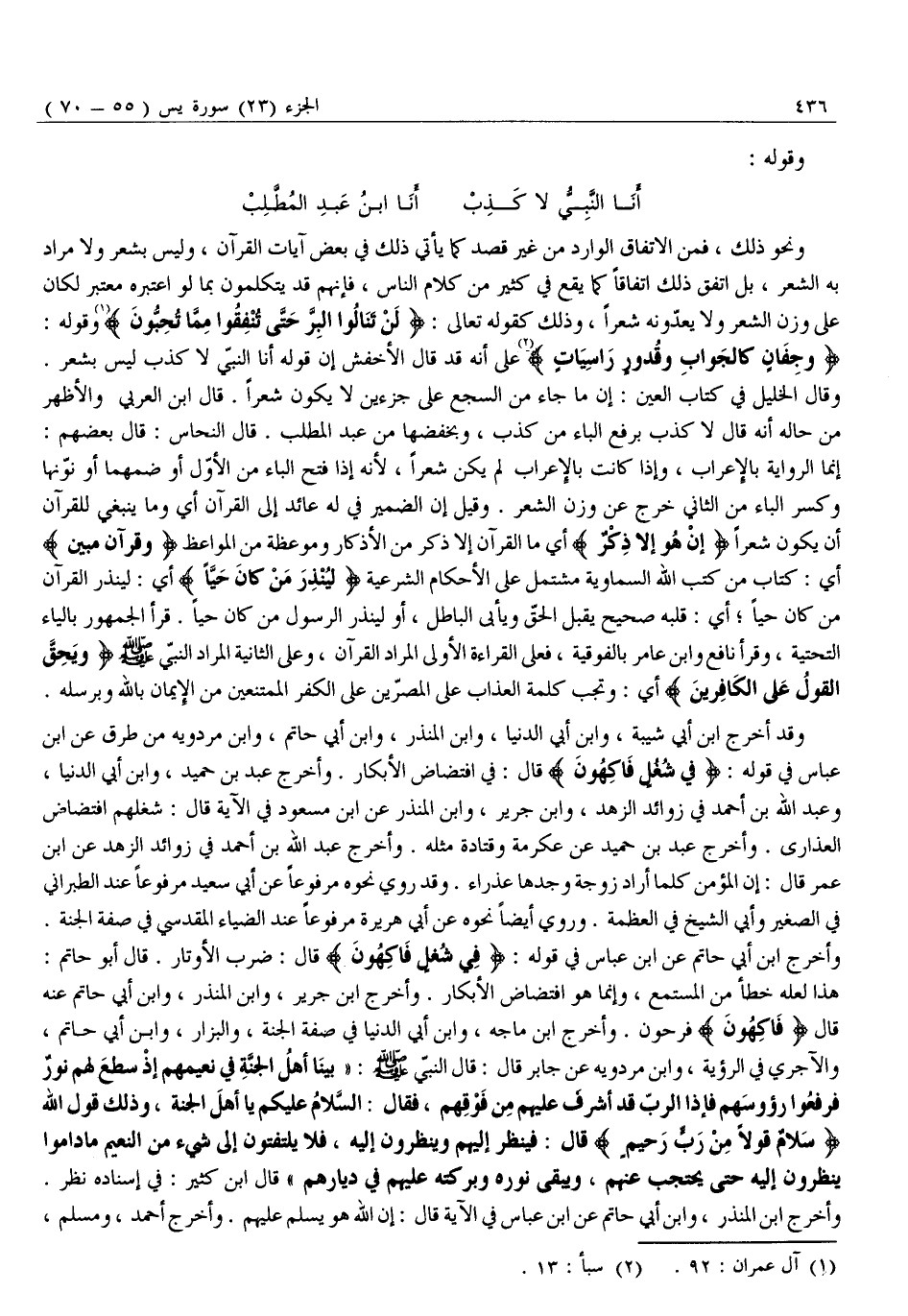 هَذَا لَعَلَّهُ خَطَأٌ مِنَ الْمُسْتَمِعِ، وَإِنَّمَا هُوَ افْتِضَاضُ الْأَبْكَارِ. وَأَخْرَجَ ابْنُ جَرِيرٍ، وَابْنُ الْمُنْذِرِ، وَابْنُ أَبِي حَاتِمٍ عَنْهُ قَالَ فاكِهُونَ فَرِحُونَ. وَأَخْرَجَ ابْنُ مَاجَهْ، وَابْنُ أَبِي الدُّنْيَا فِي صِفَةِ الْجَنَّةِ، وَالْبَزَّارُ، وَابْنُ أَبِي حَاتِمٍ، وَالْآجُرِّيُّ فِي الرُّؤْيَةِ، وَابْنُ مَرْدَوَيْهِ عَنْ جَابِرٍ قَالَ: قَالَ النَّبِيُّ صَلَّى اللَّهُ عَلَيْهِ وَسَلَّمَ: «بَيْنَا أَهْلُ الْجَنَّةِ فِي نَعِيمِهِمْ إِذْ سطع لهم نور فرفعوا رؤوسهم فَإِذَا الرَّبُّ قَدْ أَشْرَفَ عَلَيْهِمْ مِنْ فَوْقِهِمْ، فَقَالَ: السَّلَامُ عَلَيْكُمْ يَا أَهْلَ الْجَنَّةِ، وَذَلِكَ قَوْلُ اللَّهِ سَلامٌ قَوْلًا مِنْ رَبٍّ رَحِيمٍ قَالَ: فَيَنْظُرُ إِلَيْهِمْ وَيَنْظُرُونَ إِلَيْهِ، فَلَا يَلْتَفِتُونَ إِلَى شَيْءٍ مِنَ النَّعِيمِ مَا دَامُوا يَنْظُرُونَ إِلَيْهِ حَتَّى يَحْتَجِبَ عَنْهُمْ، وَيَبْقَى نُورُهُ وَبَرَكَتُهُ عَلَيْهِمْ فِي دِيَارِهِمْ» قَالَ ابْنُ كَثِيرٍ: فِي إِسْنَادِهِ نَظَرٌ.