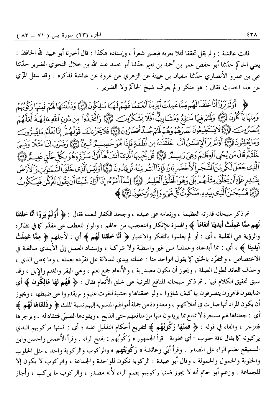 ثُمَّ ذَكَرَ سُبْحَانَهُ قُدْرَتَهُ الْعَظِيمَةَ، وَإِنْعَامَهُ عَلَى عَبِيدِهِ، وَجَحْدَ الْكُفَّارِ لِنِعَمِهِ فَقَالَ: أَوَلَمْ يَرَوْا أَنَّا خَلَقْنا لَهُمْ مِمَّا عَمِلَتْ أَيْدِينا أَنْعاماً وَالْهَمْزَةُ لِلْإِنْكَارِ وَالتَّعْجِيبِ مِنْ حَالِهِمْ، وَالْوَاوُ لِلْعَطْفِ عَلَى مُقَدَّرٍ كَمَا فِي نَظَائِرِهِ وَالرُّؤْيَةُ هِيَ الْقَلْبِيَّةُ، أَيْ: أَوَ لَمْ يَعْلَمُوا بِالتَّفَكُّرِ وَالِاعْتِبَارِ أَنَّا خَلَقْنا لَهُمْ أَيْ: لِأَجْلِهِمْ مِمَّا عَمِلَتْ أَيْدِينا، أي: مما أبدعناه وعملنا مِنْ غَيْرِ وَاسِطَةٍ وَلَا شَرِكَةٍ، وَإِسْنَادُ الْعَمَلِ إِلَى الْأَيْدِي مُبَالَغَةٌ فِي الِاخْتِصَاصِ، وَالتَّفَرُّدِ بِالْخَلْقِ كَمَا يَقُولُ الْوَاحِدُ مِنَّا: عَمِلْتُهُ بِيَدَيَّ لِلدَّلَالَةِ على تفرّده بعمله، وما بِمَعْنَى الَّذِي، وَحُذِفَ الْعَائِدُ لِطُولِ الصِّلَةِ، وَيَجُوزُ أَنْ تَكُونَ مَصْدَرِيَّةً، وَالْأَنْعَامُ جَمْعُ نَعَمٍ، وَهِيَ الْبَقَرُ وَالْغَنَمُ وَالْإِبِلُ، وَقَدْ سَبَقَ تَحْقِيقُ الْكَلَامِ فِيهَا. ثُمَّ ذَكَرَ سُبْحَانَهُ الْمَنَافِعَ الْمُتَرَتِّبَةَ عَلَى خَلْقِ الْأَنْعَامِ فَقَالَ: فَهُمْ لَها مالِكُونَ أَيْ ضابطون قاهرون يتصرفون بها كيف شاؤوا، وَلَوْ خَلَقْنَاهَا وَحْشِيَّةً لَنَفَرَتْ عَنْهُمْ وَلَمْ يَقْدِرُوا عَلَى ضَبْطِهَا، وَيَجُوزُ أَنْ يَكُونَ الْمُرَادُ أَنَّهَا صَارَتْ فِي أَمْلَاكِهِمْ، وَمَعْدُودَةً مِنْ جُمْلَةِ أَمْوَالِهِمُ الْمَنْسُوبَةِ إِلَيْهِمْ نِسْبَةَ الْمُلْكِ وَذَلَّلْناها لَهُمْ أَيْ: جَعَلْنَاهَا لَهُمْ مُسَخَّرَةً لَا تَمْتَنِعُ مِمَّا يُرِيدُونَ مِنْهَا مِنْ مَنَافِعِهِمْ حَتَّى الذَّبْحِ، وَيَقُودُهَا الصَّبِيُّ فَتَنْقَادُ لَهُ، وَيَزْجُرُهَا فَتَنْزَجِرُ، وَالْفَاءُ فِي قَوْلِهِ: فَمِنْها رَكُوبُهُمْ لِتَفْرِيعِ أَحْكَامِ التَّذْلِيلِ عَلَيْهِ أَيْ: فَمِنْهَا مَرْكُوبُهُمُ الَّذِي يَرْكَبُونَهُ كَمَا يُقَالُ نَاقَةٌ حَلُوبٌ: أَيْ مَحْلُوبَةٌ. قَرَأَ الْجُمْهُورُ «رَكُوبُهُمْ» بِفَتْحِ الراء. وقرأ الأعمش والحسن وابن السميقع بِضَمِّ الرَّاءِ عَلَى الْمَصْدَرِ. وَقَرَأَ أُبَيٌّ وَعَائِشَةُ «رَكُوبَتُهُمْ» وَالرَّكُوبُ وَالرَّكُوبَةُ وَاحِدٌ، مِثْلُ الْحَلُوبِ وَالْحَلُوبَةِ وَالْحَمُولِ وَالْحُمُولَةِ، وَقَالَ أَبُو عُبَيْدَةَ: الرَّكُوبَةُ تَكُونُ لِلْوَاحِدَةِ وَالْجَمَاعَةِ، وَالرَّكُوبُ لَا يَكُونُ إِلَّا لِلْجَمَاعَةِ. وَزَعَمَ أَبُو حَاتِمٍ أَنَّهُ لَا يَجُوزُ فَمِنْهَا رُكُوبُهُمْ بِضَمِّ الرَّاءِ لِأَنَّهُ مَصْدَرٌ، وَالرُّكُوبُ مَا يركب، وأجاز