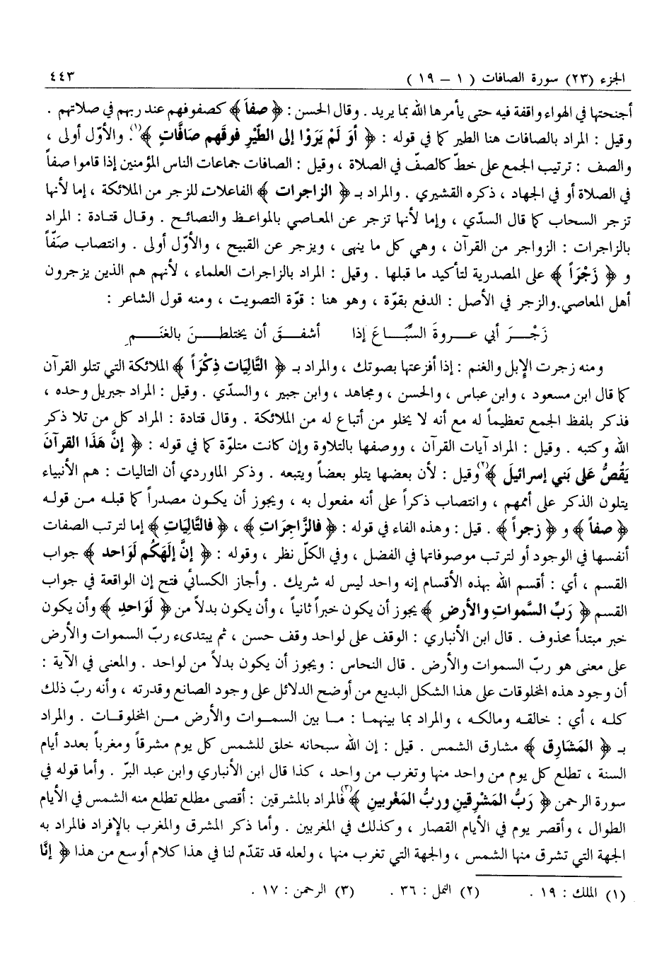 وَقِيلَ: الْمُرَادُ بِالصَّافَّاتِ هُنَا الطَّيْرُ كَمَا فِي قَوْلِهِ: أَوَلَمْ يَرَوْا إِلَى الطَّيْرِ فَوْقَهُمْ صافَّاتٍ «1» . وَالْأَوَّلُ أَوْلَى، وَالصَّفُّ: تَرْتِيبُ الْجَمْعِ عَلَى خَطٍّ كالصفّ في الصلاة، وقيل: الصافات جماعات النَّاسِ الْمُؤْمِنِينَ إِذَا قَامُوا صَفًّا فِي الصَّلَاةِ أَوْ فِي الْجِهَادِ، ذَكَرَهُ الْقُشَيْرِيُّ. وَالْمُرَادُ بِ فَالزَّاجِراتِ الْفَاعِلَاتُ لِلزَّجْرِ مِنَ الْمَلَائِكَةِ، إِمَّا لِأَنَّهَا تَزْجُرُ السَّحَابَ كَمَا قَالَ السُّدِّيُّ، وَإِمَّا لِأَنَّهَا تَزْجُرُ عَنِ الْمَعَاصِي بِالْمَوَاعِظِ وَالنَّصَائِحِ. وَقَالَ قَتَادَةُ: الْمُرَادُ بِالزَّاجِرَاتِ: الزَّوَاجِرُ مِنَ الْقُرْآنِ، وَهِيَ كُلُّ مَا يَنْهَى، وَيَزْجُرُ عَنِ الْقَبِيحِ، وَالْأَوَّلُ أَوْلَى. وَانْتِصَابُ صفّا.