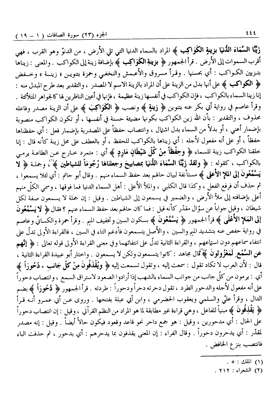 وَقَرَأَ عَاصِمٌ فِي رِوَايَةِ أبي بكر عنه بتنوين بِزِينَةٍ وَنَصْبِ «الْكَوَاكِبَ» عَلَى أَنَّ الزِّينَةَ مَصْدَرٌ وَفَاعِلُهُ مَحْذُوفٌ، وَالتَّقْدِيرُ: بِأَنَّ اللَّهَ زَيَّنَ الْكَوَاكِبَ بِكَوْنِهَا مُضِيئَةً حَسَنَةً فِي أَنْفُسِهَا، أَوْ تَكُونُ الْكَوَاكِبُ مَنْصُوبَةً بِإِضْمَارِ أَعْنِي، أَوْ بَدَلًا مِنَ السَّمَاءِ بَدَلَ اشْتِمَالٍ، وَانْتِصَابُ حِفْظًا عَلَى الْمَصْدَرِيَّةِ بِإِضْمَارِ فعل: أي حفظناها حفظا، أو على أنه مَفْعُولٌ لِأَجْلِهِ: أَيْ زَيَّنَّاهَا بِالْكَوَاكِبِ لِلْحِفْظِ، أَوْ بِالْعَطْفِ عَلَى مَحَلِّ زِينَةٍ كَأَنَّهُ قَالَ: إِنَّا خَلَقْنَا الْكَوَاكِبَ زِينَةً لِلسَّمَاءِ وَحِفْظاً مِنْ كُلِّ شَيْطانٍ مارِدٍ أَيْ: مُتَمَرِّدٍ خَارِجٍ عَنِ الطَّاعَةِ يُرْمَى بِالْكَوَاكِبِ، كَقَوْلِهِ: وَلَقَدْ زَيَّنَّا السَّماءَ الدُّنْيا بِمَصابِيحَ وَجَعَلْناها رُجُوماً لِلشَّياطِينِ «1» ، وَجُمْلَةُ لَا يَسَّمَّعُونَ إِلَى الْمَلَإِ الْأَعْلى مُسْتَأْنَفَةٌ لِبَيَانِ حَالِهِمْ بَعْدَ حِفْظِ السَّمَاءِ مِنْهُمْ. وَقَالَ أَبُو حَاتِمٍ: أَيْ لِئَلَّا يَسْمَعُوا، ثُمَّ حَذَفَ إِنْ فَرَفَعَ الْفِعْلَ، وَكَذَا قَالَ الْكَلْبِيُّ، وَالْمَلَأُ الْأَعْلَى: أَهْلُ السَّمَاءِ الدُّنْيَا فَمَا فَوْقَهَا، وَسُمِّيَ الْكُلُّ مِنْهُمْ أَعْلَى بِإِضَافَتِهِ إِلَى مَلَأِ الْأَرْضِ، وَالضَّمِيرُ فِي يَسَّمَّعُونَ إِلَى الشَّيَاطِينِ. وَقِيلَ: إِنَّ جُمْلَةَ لَا يَسَّمَّعُونَ صِفَةٌ لِكُلِّ شَيْطَانٍ، وَقِيلَ جَوَابًا عَنْ سُؤَالٍ مُقَدَّرٍ كَأَنَّهُ قِيلَ: فَمَا كَانَ حَالُهُمْ بَعْدَ حِفْظِ السَّمَاءِ عَنْهُمْ؟ فَقَالَ: لَا يَسَّمَّعُونَ إِلَى الْمَلَإِ الْأَعْلى قَرَأَ الْجُمْهُورُ «يَسْمَعُونَ» بِسُكُونِ السِّينِ وَتَخْفِيفِ الْمِيمِ. وَقَرَأَ حَمْزَةُ وَالْكِسَائِيُّ وَعَاصِمٌ فِي رِوَايَةِ حَفْصٍ عَنْهُ بِتَشْدِيدِ الْمِيمِ وَالسِّينِ، وَالْأَصْلُ يَتَسَمَّعُونَ فَأَدْغَمَ التَّاءَ فِي السِّينِ، فَالْقِرَاءَةُ الْأُولَى تَدُلُّ عَلَى انْتِفَاءِ سَمَاعِهِمْ دُونَ اسْتِمَاعِهِمْ، وَالْقِرَاءَةُ الثَّانِيَةُ تَدُلُّ عَلَى انْتِفَائِهِمَا وَفِي مَعْنَى الْقِرَاءَةِ الْأُولَى قَوْلُهُ تَعَالَى: إِنَّهُمْ عَنِ السَّمْعِ لَمَعْزُولُونَ «2» قَالَ مُجَاهِدٌ: كَانُوا يَتَسَمَّعُونَ وَلَكِنْ لَا يَسْمَعُونَ. وَاخْتَارَ أَبُو عُبَيْدَةَ الْقِرَاءَةَ الثَّانِيَةَ، قَالَ: لِأَنَّ الْعَرَبَ لَا تَكَادُ تَقُولُ: سَمِعْتُ إِلَيْهِ، وَتَقُولُ تَسَمَّعْتُ إِلَيْهِ وَيُقْذَفُونَ مِنْ كُلِّ جانِبٍ دُحُوراً أَيْ: يُرْمَوْنَ مِنْ كُلِّ جَانِبٍ مِنْ جَوَانِبِ السَّمَاءِ بِالشُّهُبِ إِذَا أَرَادُوا الصُّعُودَ لِاسْتِرَاقِ السَّمْعِ، وَانْتِصَابُ دُحُورًا عَلَى أَنَّهُ مَفْعُولٌ لِأَجْلِهِ وَالدُّحُورُ الطَّرْدُ، تَقُولُ دَحَرْتُهُ دَحْرًا وَدُحُورًا: طَرَدْتُهُ. قَرَأَ الْجُمْهُورُ دُحُوراً بِضَمِّ الدَّالِ، وَقَرَأَ عَلِيٌّ وَالسُّلَمِيُّ وَيَعْقُوبُ الْحَضْرَمِيُّ، وَابْنُ أَبِي عَبْلَةَ بِفَتْحِهَا. وَرُوِيَ عَنْ أَبِي عَمْرٍو أَنَّهُ قَرَأَ يُقْذَفُونَ مَبْنِيًّا لِلْفَاعِلِ، وَهِيَ قِرَاءَةٌ غَيْرُ مُطَابِقَةٍ لِمَا هُوَ الْمُرَادُ مِنَ النَّظْمِ الْقُرْآنِيِّ، وَقِيلَ: إِنَّ انْتِصَابَ دُحُورًا عَلَى الْحَالِ: أَيْ مَدْحُورِينَ، وَقِيلَ: هُوَ جَمْعُ دَاحِرٍ نَحْوُ قَاعِدٍ وَقُعُودٍ فَيَكُونُ حَالًا أَيْضًا. وَقِيلَ: إِنَّهُ مَصْدَرٌ لِمُقَدَّرٍ: أَيْ يُدْحَرُونَ دُحُورًا. وَقَالَ الْفَرَّاءُ: إِنَّ الْمَعْنَى يُقْذَفُونَ بِمَا يَدْحَرُهُمْ: أَيْ بِدُحُورٍ، ثُمَّ حُذِفَتِ الْبَاءُ فَانْتَصَبَ بنزع الخافض.