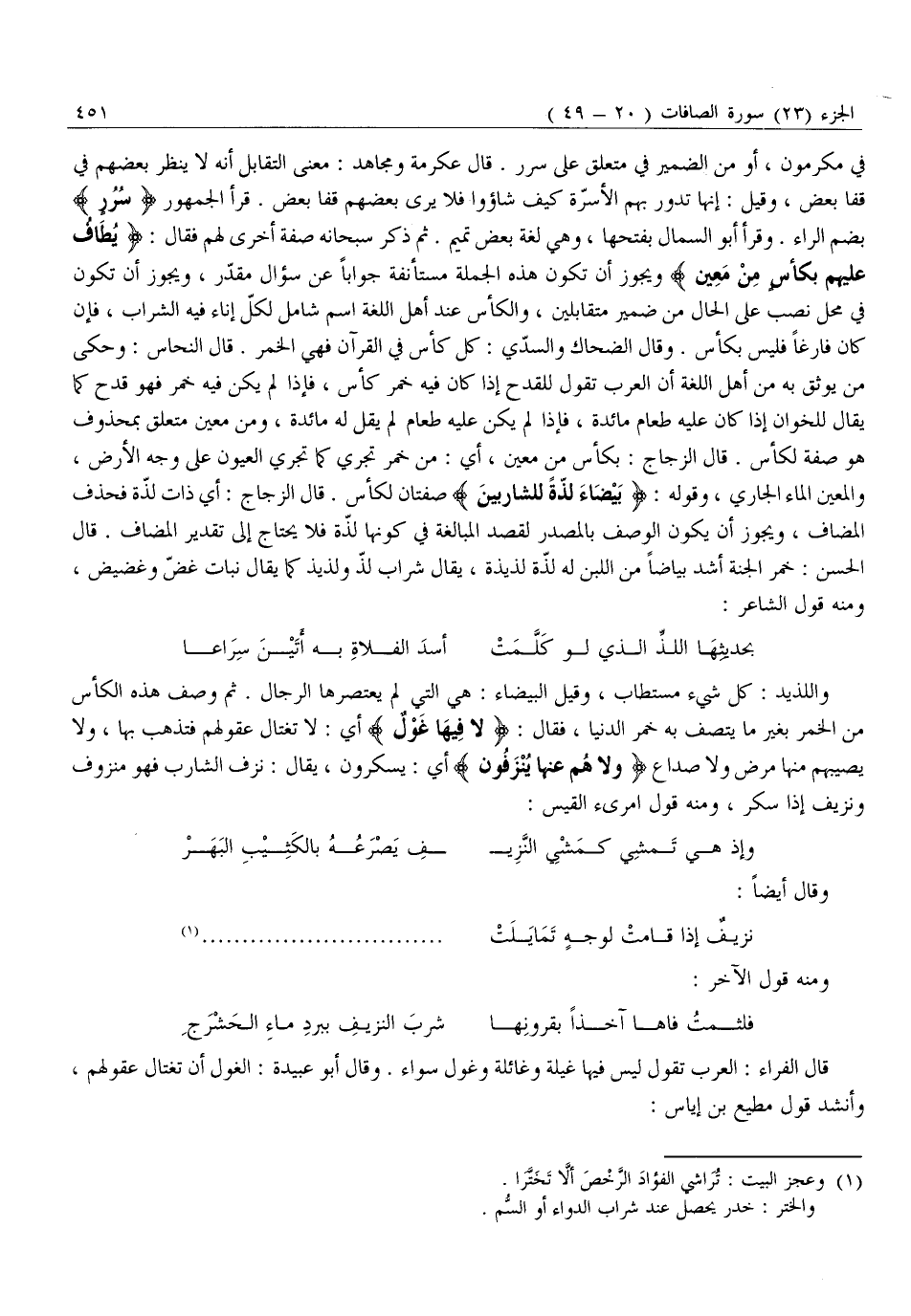 واللذيد: كُلُّ شَيْءٍ مُسْتَطَابٌ، وَقِيلَ الْبَيْضَاءُ: هِيَ الَّتِي لَمْ يَعْتَصِرْهَا الرِّجَالُ. ثُمَّ وَصَفَ هَذِهِ الْكَأْسَ مِنَ الْخَمْرِ بِغَيْرِ مَا يَتَّصِفُ بِهِ خَمْرُ الدُّنْيَا، فَقَالَ: لَا فِيها غَوْلٌ أَيْ: لَا تَغْتَالُ عُقُولُهُمْ فَتَذْهَبُ بِهَا، وَلَا يُصِيبُهُمْ مِنْهَا مَرَضٌ وَلَا صُدَاعٌ وَلا هُمْ عَنْها يُنْزَفُونَ أَيْ: يَسْكَرُونَ، يُقَالُ: نَزَفَ الشَّارِبُ فَهُوَ مَنْزُوفٌ وَنَزِيفٌ إِذَا سَكِرَ، وَمِنْهُ قَوْلُ امْرِئِ الْقَيْسِ: