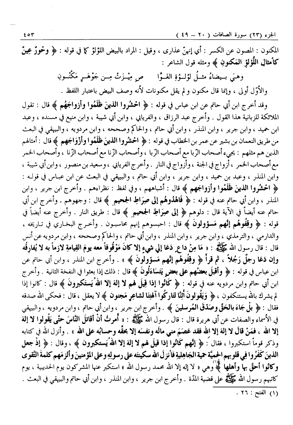احْشُرُوا الَّذِينَ ظَلَمُوا وَأَزْواجَهُمْ قَالَ: أَشْبَاهَهُمْ، وَفِي لَفْظٍ: نُظَرَاءَهُمْ. وَأَخْرَجَ ابْنُ جَرِيرٍ، وَابْنُ الْمُنْذِرِ، وَابْنُ أَبِي حَاتِمٍ عَنْهُ فِي قَوْلِهِ: فَاهْدُوهُمْ إِلى صِراطِ الْجَحِيمِ قَالَ: وَجِّهُوهُمْ. وَأَخْرَجَ ابْنُ أَبِي حَاتِمٍ عَنْهُ أَيْضًا فِي الْآيَةِ قَالَ: دُلُّوهُمْ إِلى صِراطِ الْجَحِيمِ قَالَ: طَرِيقِ النَّارِ. وَأَخْرَجَ عَنْهُ أَيْضًا فِي قَوْلِهِ: وَقِفُوهُمْ إِنَّهُمْ مَسْؤُلُونَ قَالَ: احْبِسُوهُمْ إِنَّهُمْ مُحَاسَبُونَ. وَأَخْرَجَ الْبُخَارِيُّ فِي تَارِيخِهِ، وَالدَّارِمِيُّ، وَالتِّرْمِذِيُّ، وَابْنُ جَرِيرٍ، وَابْنُ الْمُنْذِرِ، وَابْنُ أَبِي حَاتِمٍ، وَالْحَاكِمُ وَصَحَّحَهُ، وَابْنُ مَرْدَوَيْهِ عَنْ أَنَسٍ قَالَ: قَالَ رَسُولُ اللَّهِ صَلَّى اللَّهُ عَلَيْهِ وَسَلَّمَ: «مَا مِنْ دَاعٍ دَعَا إِلَى شَيْءٍ إِلَّا كَانَ مَوْقُوفًا مَعَهُ يَوْمَ الْقِيَامَةِ لَازِمًا بِهِ لَا يُفَارِقُهُ وَإِنْ دَعَا رَجُلٌ رَجُلًا، ثم قرأ وَقِفُوهُمْ إِنَّهُمْ مَسْؤُلُونَ» . وَأَخْرَجَ ابْنُ الْمُنْذِرِ، وَابْنُ أَبِي حَاتِمٍ عَنِ ابن عباس في قوله: فَأَقْبَلَ بَعْضُهُمْ عَلى بَعْضٍ يَتَساءَلُونَ قَالَ: ذَلِكَ إِذَا بُعِثُوا فِي النَّفْخَةِ الثَّانِيَةِ. وَأَخْرَجَ ابْنُ أَبِي حَاتِمٍ وَابْنُ مَرْدَوَيْهِ عَنْهُ فِي قَوْلِهِ: كانُوا إِذا قِيلَ لَهُمْ لَا إِلهَ إِلَّا اللَّهُ يَسْتَكْبِرُونَ قَالَ: كَانُوا إِذَا لَمْ يُشْرَكْ بِاللَّهِ يستنكفون، وَيَقُولُونَ أَإِنَّا لَتارِكُوا آلِهَتِنا لِشاعِرٍ مَجْنُونٍ لَا يُعْقَلُ، قَالَ: فَحَكَى اللَّهُ صِدْقَهُ فَقَالَ: بَلْ جاءَ بِالْحَقِّ وَصَدَّقَ الْمُرْسَلِينَ. وَأَخْرَجَ ابْنُ جَرِيرٍ، وَابْنُ أَبِي حَاتِمٍ، وَابْنُ مَرْدَوَيْهِ، وَالْبَيْهَقِيُّ فِي الْأَسْمَاءِ وَالصِّفَاتِ عَنْ أَبِي هُرَيْرَةَ قَالَ: قَالَ رَسُولُ اللَّهِ صَلَّى اللَّهُ عَلَيْهِ وَسَلَّمَ: «أُمِرْتُ أَنْ أُقَاتِلَ النَّاسَ حَتَّى يَقُولُوا لَا إِلَهَ إِلَّا اللَّهُ، فَمَنْ قَالَ لَا إِلَهَ إِلَّا اللَّهُ فَقَدْ عَصَمَ مِنِّي مَالَهُ وَنَفْسَهُ إِلَّا بِحَقِّهِ وَحِسَابُهُ عَلَى اللَّهِ» . وَأَنْزَلَ اللَّهُ فِي كِتَابِهِ وَذَكَرَ قَوْمًا اسْتَكْبَرُوا، فَقَالَ: إِنَّهُمْ كانُوا إِذا قِيلَ لَهُمْ لَا إِلهَ إِلَّا اللَّهُ يَسْتَكْبِرُونَ، وَقَالَ: إِذْ جَعَلَ الَّذِينَ كَفَرُوا فِي قُلُوبِهِمُ الْحَمِيَّةَ حَمِيَّةَ الْجاهِلِيَّةِ فَأَنْزَلَ اللَّهُ سَكِينَتَهُ عَلى رَسُولِهِ وَعَلَى الْمُؤْمِنِينَ وَأَلْزَمَهُمْ كَلِمَةَ التَّقْوى وَكانُوا أَحَقَّ بِها وَأَهْلَها «1» وَهِيَ «لَا إِلَهَ إِلَّا اللَّهُ مُحَمَّدٌ رَسُولُ اللَّهِ» اسْتَكْبَرَ عَنْهَا الْمُشْرِكُونَ يَوْمَ الْحُدَيْبِيَةِ، يَوْمَ كاتبهم رَسُولَ اللَّهِ صَلَّى اللَّهُ عَلَيْهِ وَسَلَّمَ عَلَى قَضِيَّةِ الْمُدَّةِ. وَأَخْرَجَ ابْنُ جَرِيرٍ، وَابْنُ الْمُنْذِرِ، وَابْنُ أَبِي حَاتِمٍ وَالْبَيْهَقِيُّ فِي البعث.