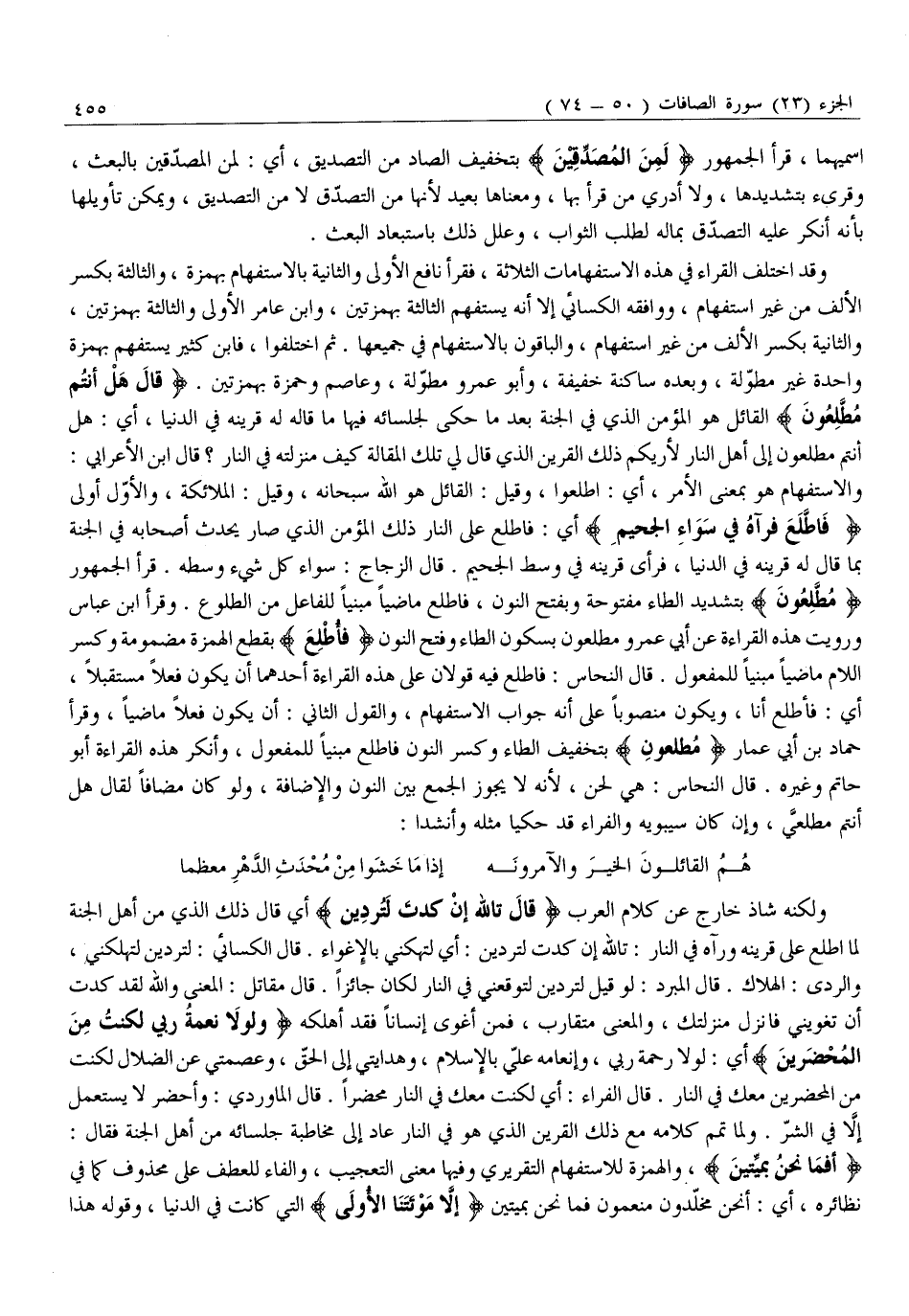 والاستفهام هُوَ بِمَعْنَى الْأَمْرِ، أَيِ: اطَّلِعُوا، وَقِيلَ: الْقَائِلُ هُوَ اللَّهُ سُبْحَانَهُ، وَقِيلَ: الْمَلَائِكَةُ، وَالْأَوَّلُ أَوْلَى فَاطَّلَعَ فَرَآهُ فِي سَواءِ الْجَحِيمِ أَيْ: فَاطَّلَعَ عَلَى النَّارِ ذَلِكَ الْمُؤْمِنُ الَّذِي صَارَ يُحَدِّثُ أَصْحَابَهُ فِي الْجَنَّةِ بِمَا قَالَ لَهُ قَرِينُهُ فِي الدُّنْيَا، فَرَأَى قَرِينَهُ فِي وَسَطِ الْجَحِيمِ. قَالَ الزَّجَّاجُ: سَوَاءُ كُلِّ شَيْءٍ وَسَطُهُ. قَرَأَ الْجُمْهُورُ مُطَّلِعُونَ بِتَشْدِيدِ الطَّاءِ مَفْتُوحَةً وَبِفَتْحِ النُّونِ، فَاطَّلَعَ مَاضِيًا مَبْنِيًّا لِلْفَاعِلِ مِنَ الطُّلُوعِ. وَقَرَأَ ابْنُ عَبَّاسٍ وَرُوِيَتْ هَذِهِ الْقِرَاءَةُ عَنْ أَبِي عَمْرٍو مُطْلِعُونَ بِسُكُونِ الطَّاءِ وَفَتْحِ النُّونِ فَاطَّلَعَ بِقَطْعِ الْهَمْزَةِ مَضْمُومَةً وَكَسْرِ اللَّامِ مَاضِيًا مَبْنِيًّا لِلْمَفْعُولِ. قَالَ النَّحَّاسُ: فَأُطْلِعَ فِيهِ قَوْلَانِ عَلَى هَذِهِ الْقِرَاءَةِ أَحَدُهُمَا أَنْ يَكُونَ فِعْلًا مُسْتَقْبَلًا، أَيْ: فَأَطَّلِعُ أَنَا، وَيَكُونُ مَنْصُوبًا عَلَى أَنَّهُ جَوَابُ الِاسْتِفْهَامِ، وَالْقَوْلُ الثَّانِي: أَنْ يَكُونَ فِعْلًا مَاضِيًا، وَقَرَأَ حَمَّادُ بْنُ أَبِي عَمَّارٍ مُطَّلِعُونَ بِتَخْفِيفِ الطَّاءِ وَكَسْرِ النُّونِ فَاطُّلِعَ مَبْنِيًّا لِلْمَفْعُولِ، وَأَنْكَرَ هَذِهِ الْقِرَاءَةَ أَبُو حَاتِمٍ وَغَيْرُهُ. قَالَ النَّحَّاسُ: هِيَ لَحْنٌ، لِأَنَّهُ لَا يَجُوزُ الْجَمْعُ بَيْنَ النُّونِ وَالْإِضَافَةِ، وَلَوْ كَانَ مُضَافًا لَقَالَ هَلْ أَنْتُمْ مُطْلِعِيَّ، وَإِنْ كَانَ سِيبَوَيْهِ وَالْفَرَّاءُ قَدْ حَكَيَا مِثْلَهُ وَأَنْشَدَا: