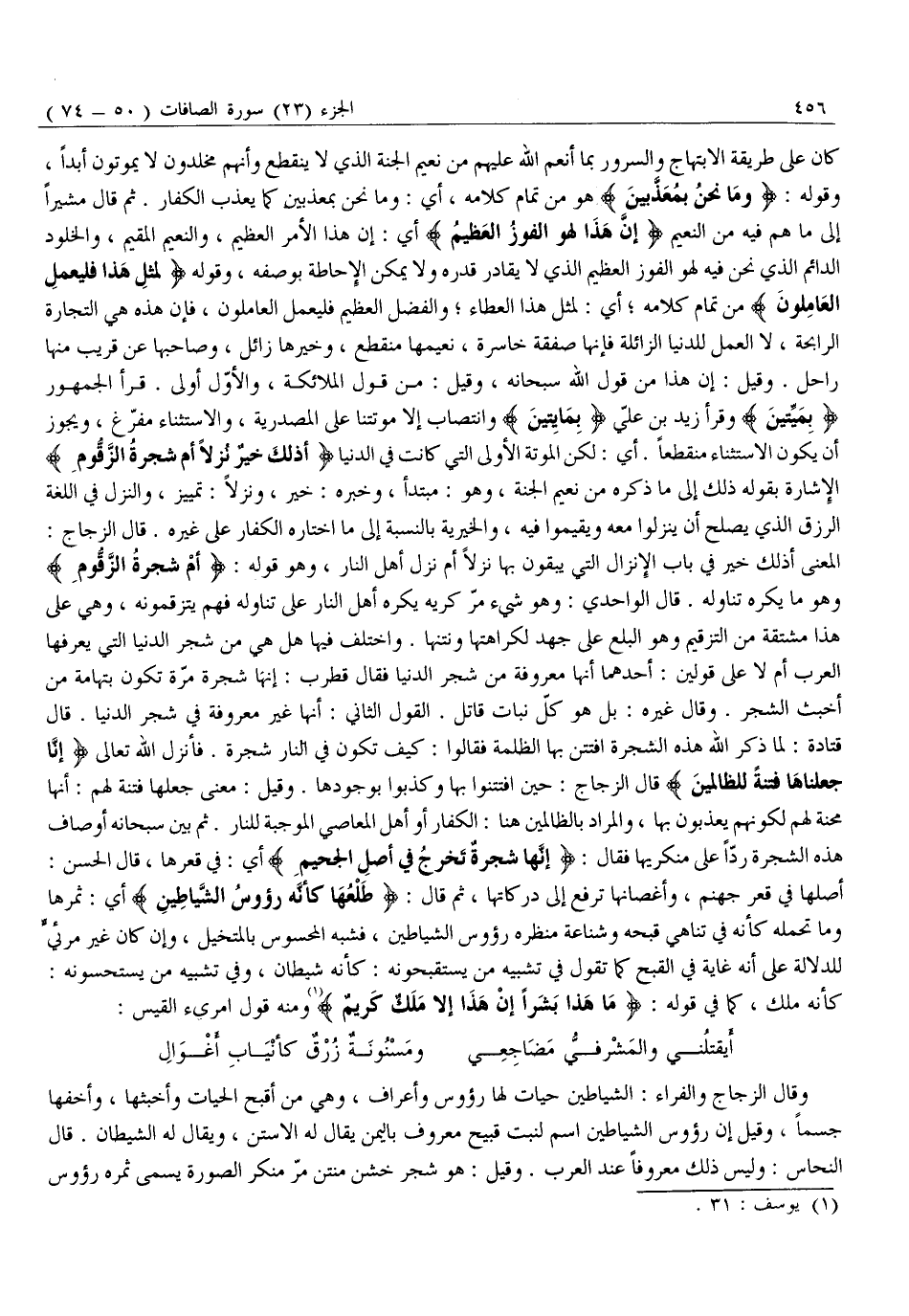كَانَ عَلَى طَرِيقَةِ الِابْتِهَاجِ وَالسُّرُورِ بِمَا أَنْعَمَ اللَّهُ عَلَيْهِمْ مِنْ نَعِيمِ الْجَنَّةِ الَّذِي لَا يَنْقَطِعُ وَأَنَّهُمْ مُخَلَّدُونَ لَا يَمُوتُونَ أَبَدًا، وَقَوْلُهُ: وَما نَحْنُ بِمُعَذَّبِينَ هُوَ مِنْ تَمَامِ كَلَامِهِ، أَيْ: وَمَا نَحْنُ بِمُعَذَّبِينَ كَمَا يُعَذَّبُ الْكُفَّارُ. ثُمَّ قَالَ مُشِيرًا إِلَى مَا هُمْ فِيهِ مِنَ النَّعِيمِ إِنَّ هَذَا لَهُوَ الْفَوْزُ الْعَظِيمُ أَيْ: إِنَّ هَذَا الْأَمْرَ الْعَظِيمَ، وَالنَّعِيمَ الْمُقِيمَ، وَالْخُلُودَ الدَّائِمَ الَّذِي نَحْنُ فِيهِ لَهُوَ الْفَوْزُ الْعَظِيمُ الَّذِي لَا يُقَادَرُ قَدَرُهُ وَلَا يُمْكِنُ الْإِحَاطَةُ بِوَصْفِهِ، وَقَوْلُهُ لِمِثْلِ هَذَا فَلْيَعْمَلِ الْعامِلُونَ مِنْ تَمَامِ كَلَامِهِ أَيْ: لِمِثْلِ هَذَا الْعَطَاءِ وَالْفَضْلِ الْعَظِيمِ فَلْيَعْمَلِ الْعَامِلُونَ، فَإِنَّ هَذِهِ هِيَ التِّجَارَةُ الرَّابِحَةُ، لَا الْعَمَلُ لِلدُّنْيَا الزَّائِلَةِ فَإِنَّهَا صَفْقَةٌ خَاسِرَةٌ، نَعِيمُهَا مُنْقَطِعٌ، وَخَيْرُهَا زَائِلٌ، وَصَاحِبُهَا عَنْ قَرِيبٍ مِنْهَا رَاحِلٌ. وَقِيلَ: إِنَّ هَذَا مِنْ قَوْلِ اللَّهِ سُبْحَانَهُ، وَقِيلَ: مِنْ قَوْلِ الْمَلَائِكَةِ، وَالْأَوَّلُ أَوْلَى. قَرَأَ الْجُمْهُورُ بِمَيِّتِينَ وَقَرَأَ زَيْدُ بْنُ عَلِيٍّ «بِمَايِتِينَ» وَانْتِصَابُ إِلَّا مَوْتَتَنَا عَلَى الْمَصْدَرِيَّةِ، وَالِاسْتِثْنَاءُ مُفَرَّغٌ، وَيَجُوزُ أَنْ يَكُونَ الِاسْتِثْنَاءُ مُنْقَطِعًا. أَيْ: لَكِنَّ الْمَوْتَةَ الْأُولَى الَّتِي كَانَتْ فِي الدُّنْيَا أَذلِكَ خَيْرٌ نُزُلًا أَمْ شَجَرَةُ الزَّقُّومِ الْإِشَارَةُ بِقَوْلِهِ ذَلِكَ إِلَى مَا ذَكَرَهُ مِنْ نَعِيمِ الْجَنَّةِ، وَهُوَ: مُبْتَدَأٌ، وَخَبَرُهُ: خير، ونزلا: تَمْيِيزٌ، وَالنُّزُلُ فِي اللُّغَةِ الرِّزْقُ الَّذِي يَصْلُحُ أَنْ يَنْزِلُوا مَعَهُ وَيُقِيمُوا فِيهِ، وَالْخَيْرِيَّةُ بِالنِّسْبَةِ إِلَى مَا اخْتَارَهُ الْكُفَّارُ عَلَى غَيْرِهِ. قَالَ الزَّجَّاجُ: